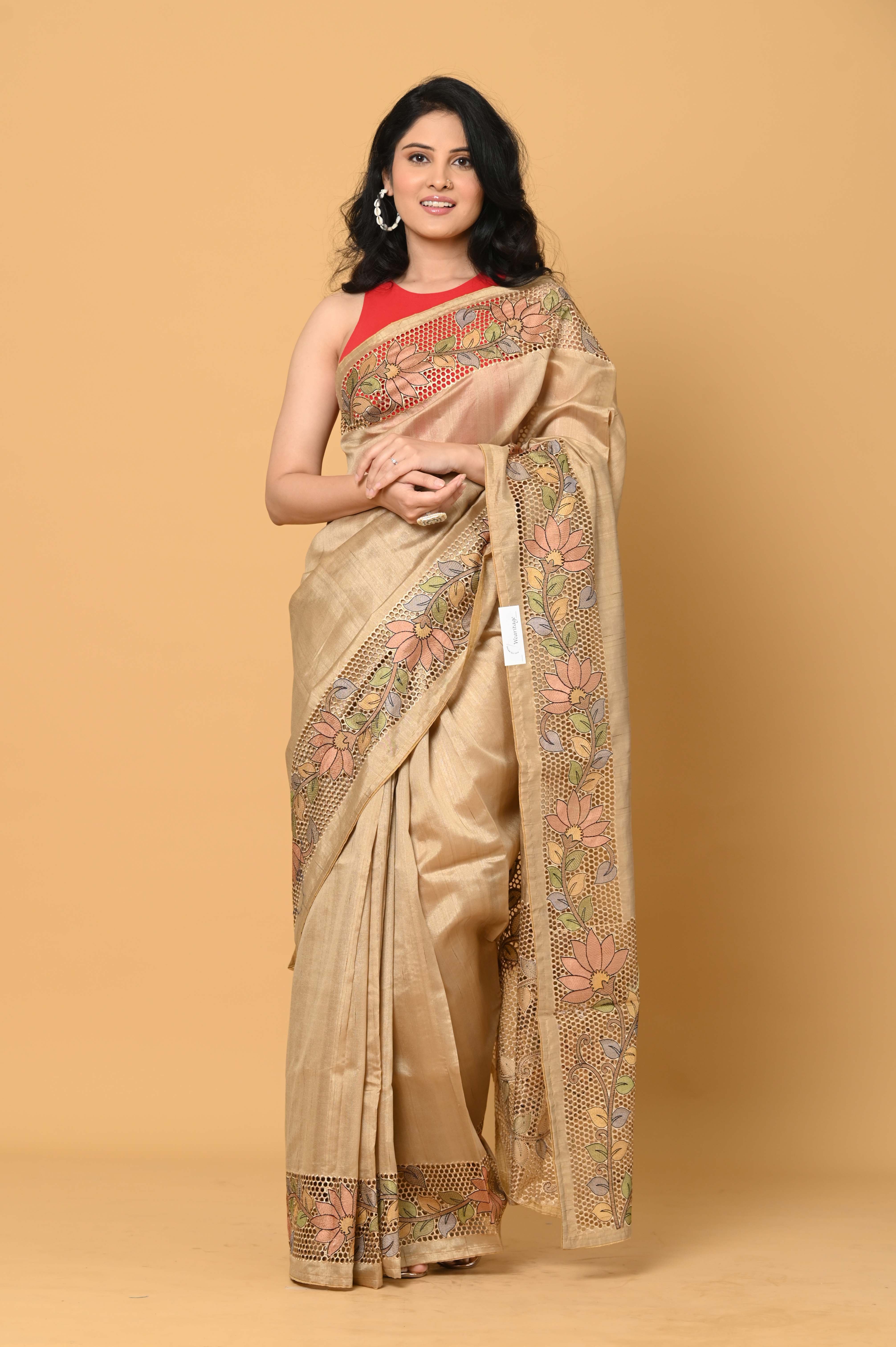 A Semi Tussar Cut Work Saree combines the beauty of semi Tussar silk with the intricate art of cut work embroidery. The cut work is typically done along the borders, pallu (decorative end), and sometimes throughout the body of the saree. It adds an element of exquisite craftsmanship to the saree, making it a fine example of traditional Indian textile artistry.