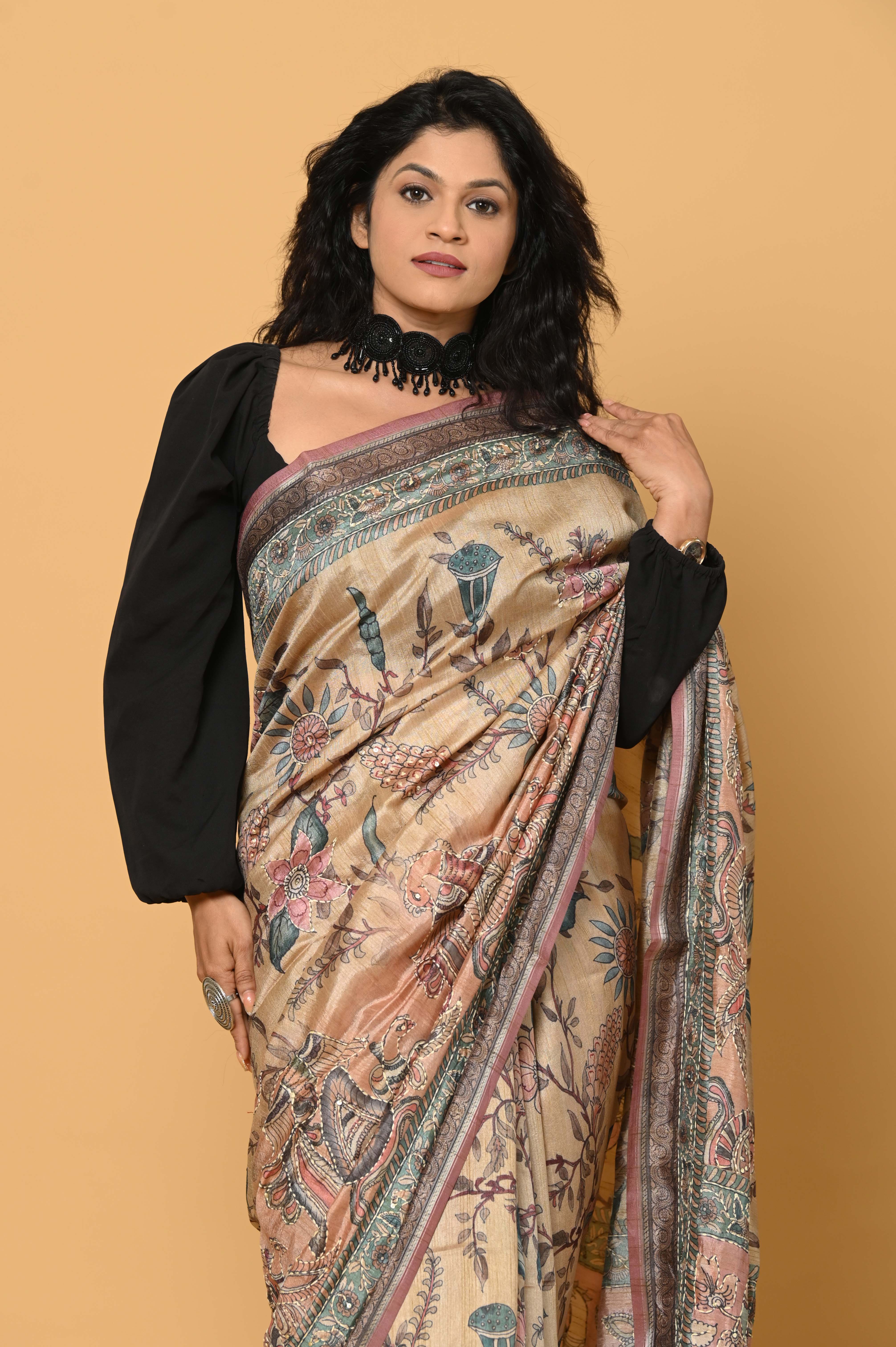 Semi Tussar Katha Work Printed saree that has a unique and visually appealing aesthetic. The Semi Tussar silk provides a natural sheen and texture, while the Katha work embroidery adds a handcrafted, artistic touch with its quilted patterns. The printed d