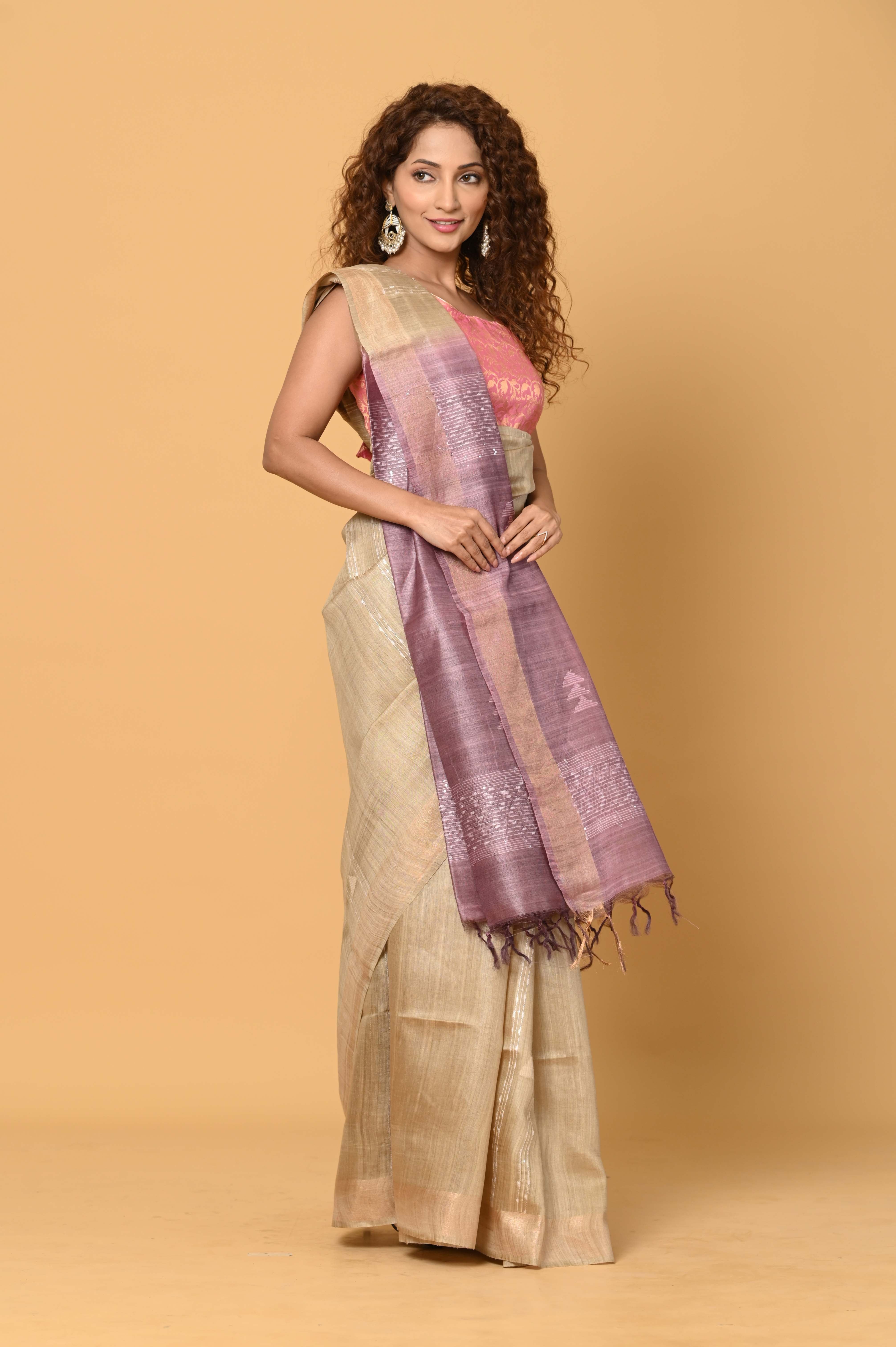 A pure tussar saree with sequins work combines the elegance of tussar silk with the glimmer and sparkle of sequins. The sequins can be hand-stitched onto the saree in various designs, which might include floral patterns, geometric shapes, or other motifs.