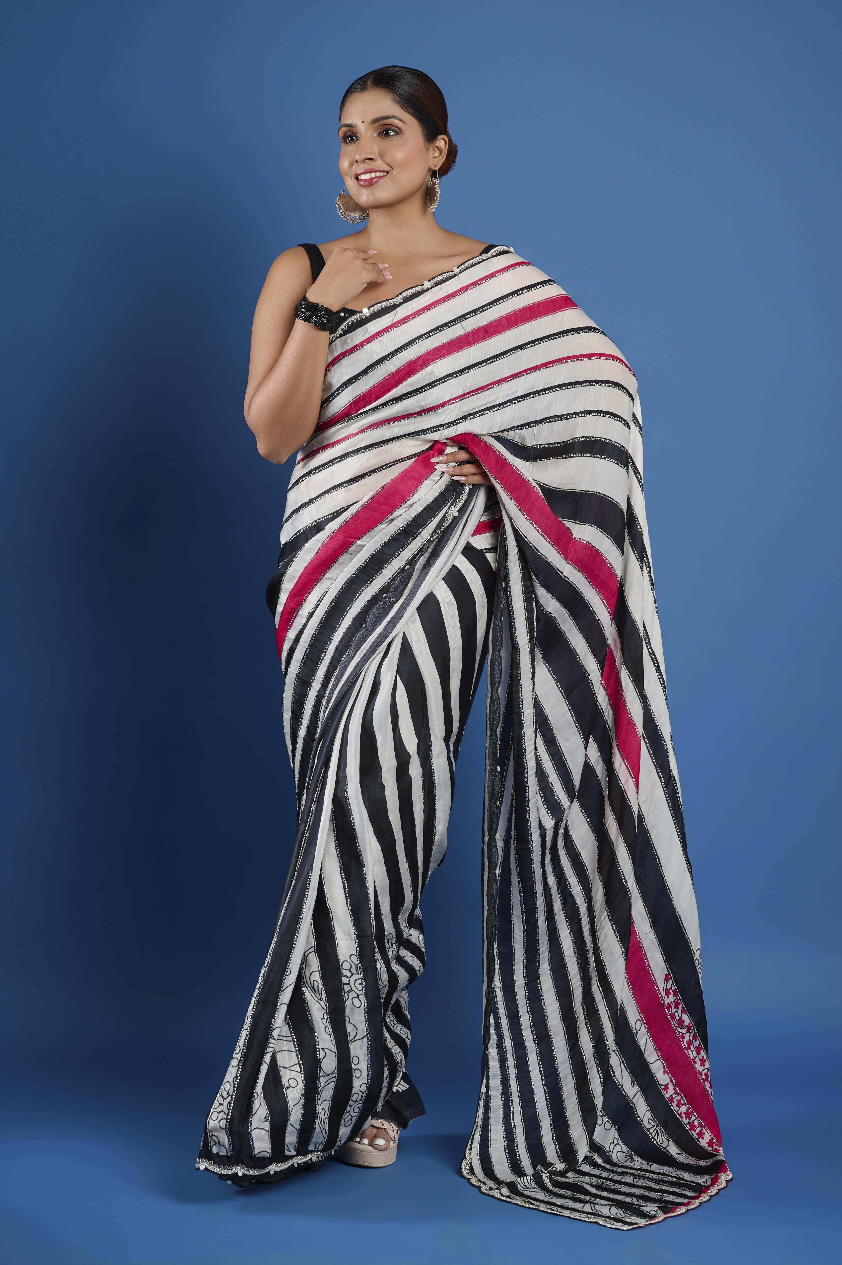 This contemporary Satin saree features dynamic stripes in black, white, and magenta pink, enhanced with intricate hand-embroidered accents along the stripes and a scalloped border. The lightweight crepe drapes beautifully, while glimmering thread and bead handwork adds sophistication and a touch of shimmer. Fine floral vine embroidery along the pallu and lower border creates an elegant finish. Included is a matching unstitched blouse piece for personalized styling.