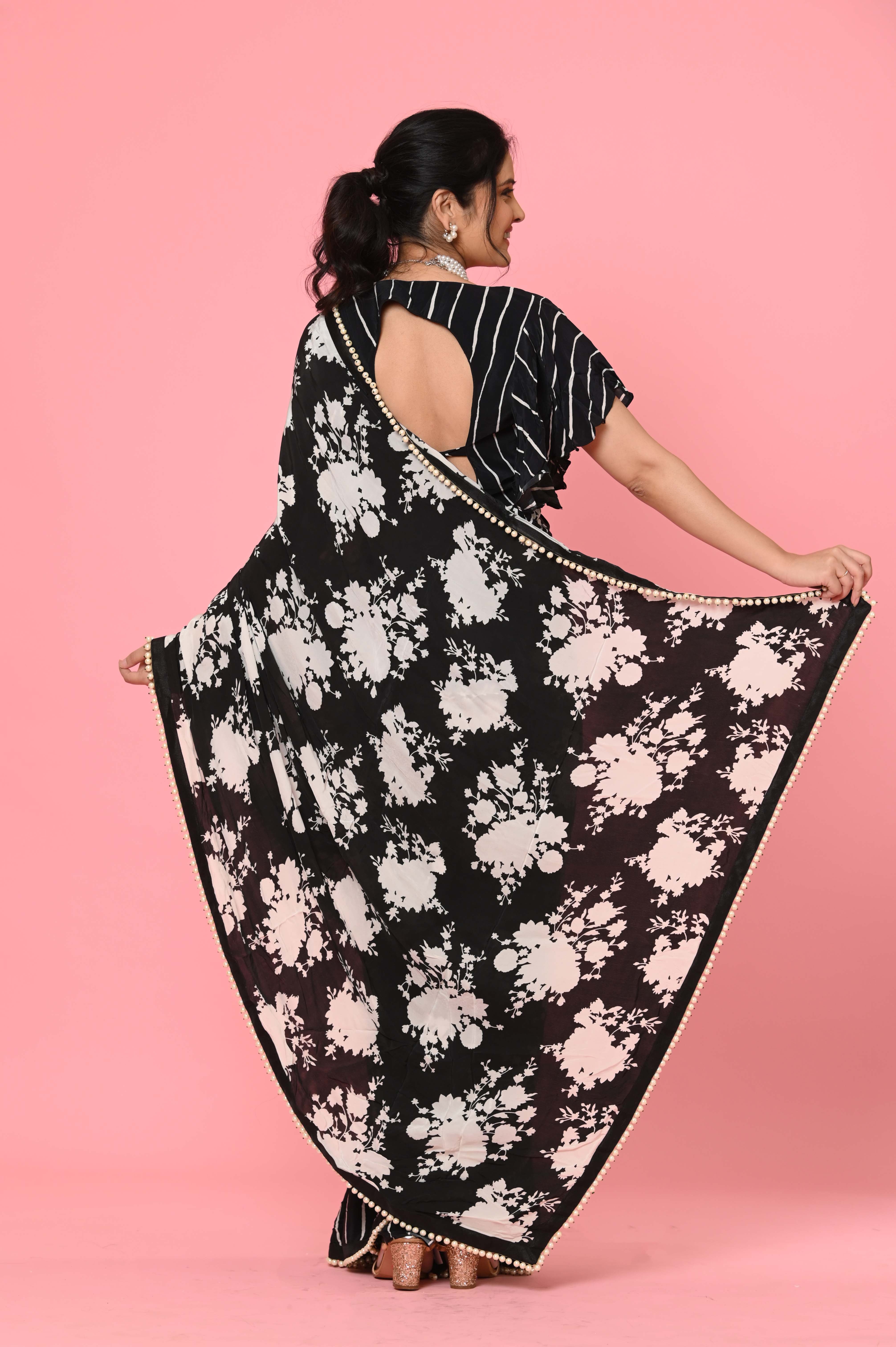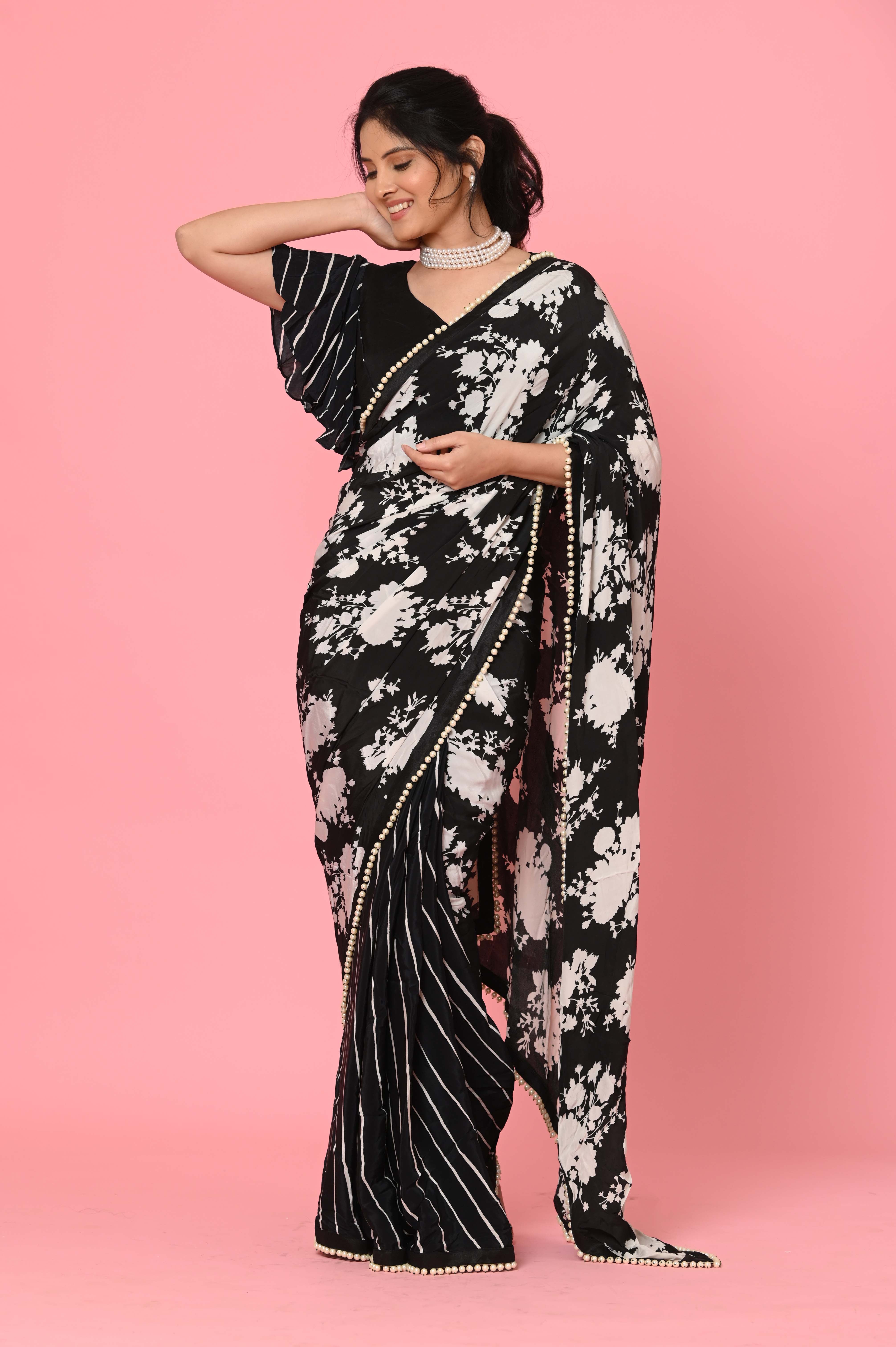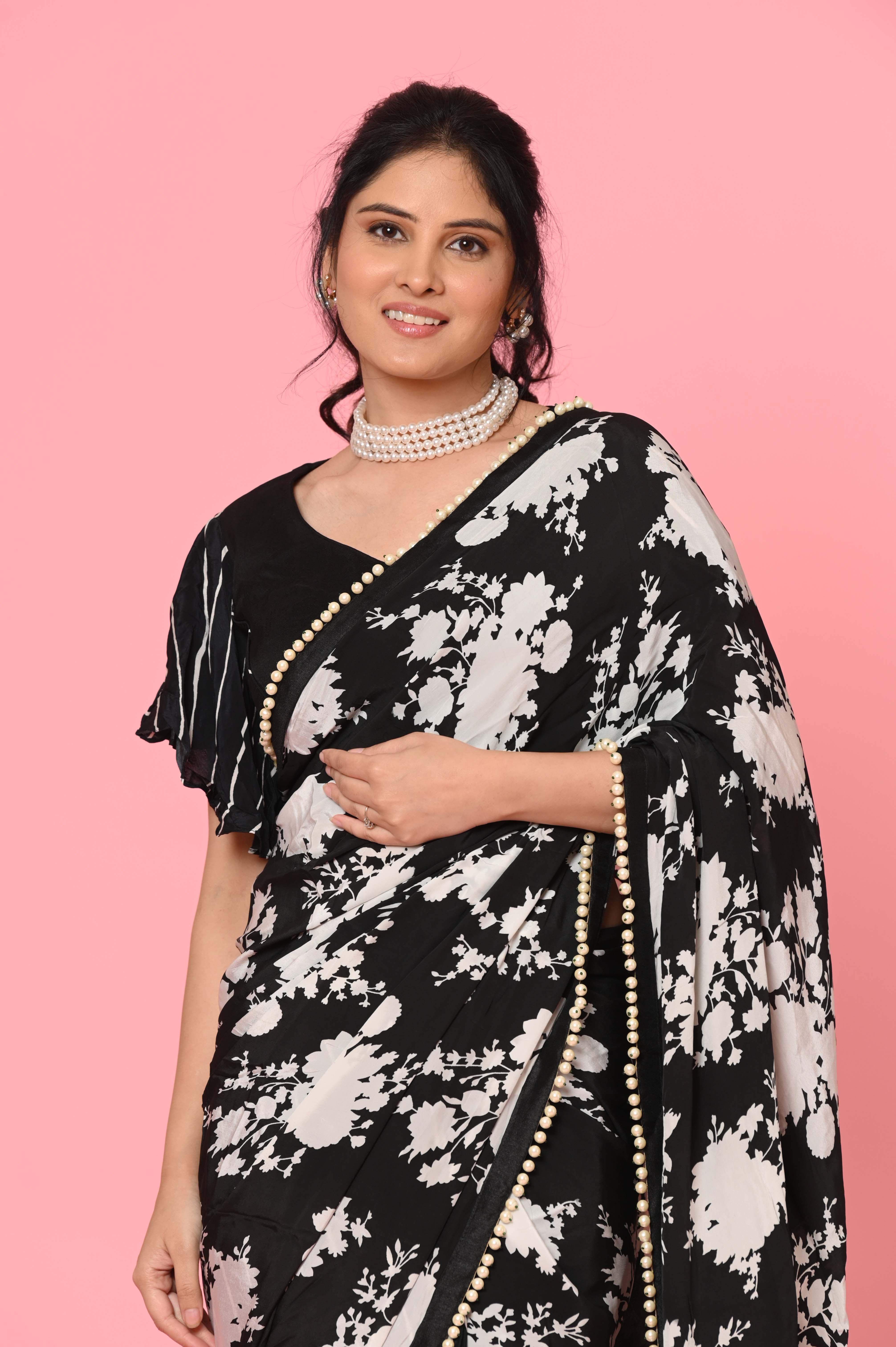 A Chinon printed saree with pearls is a fashionable and contemporary take on traditional Indian attire. Chinon is a lightweight and flowing fabric with a soft texture, making it a comfortable choice for sarees. When adorned with printed designs and embellished with pearls, it creates a unique and elegant look.