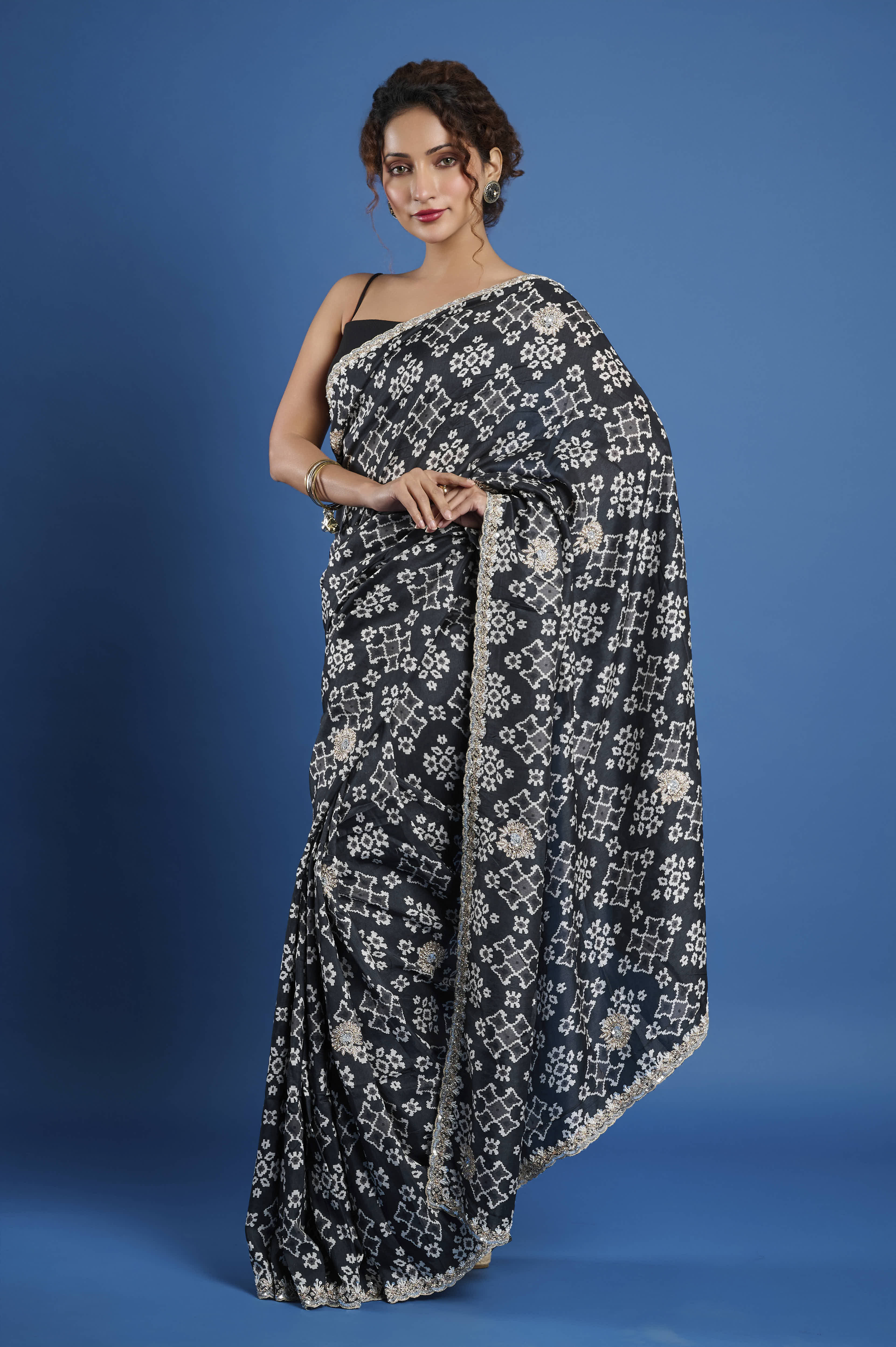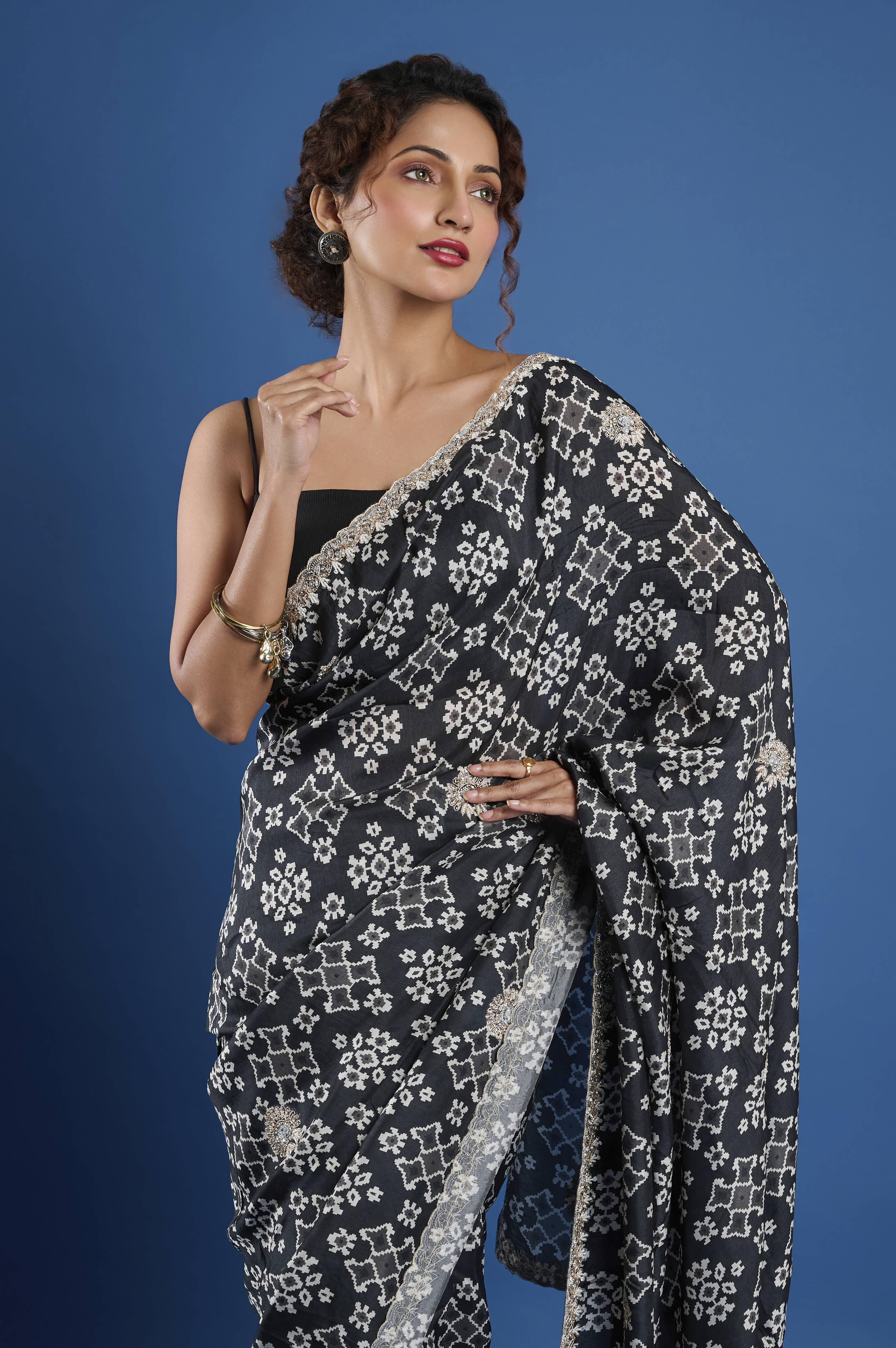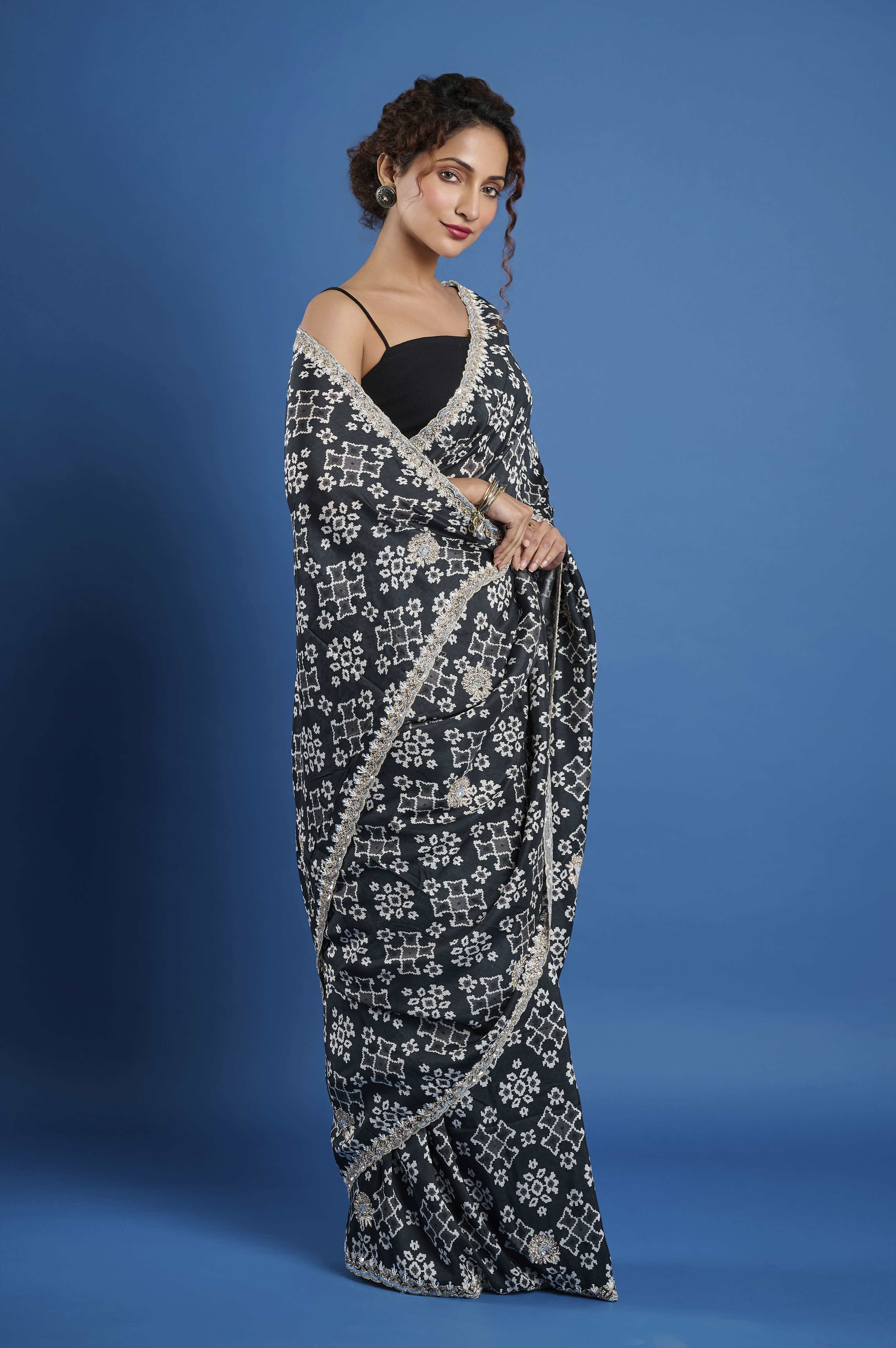 This black crepe saree features an elegant ivory hand-embroidered pattern all over, with intricate artisanal work highlighted in the border and scattered motifs. Lightweight and fluid, the crepe fabric offers a comfortable drape, while the detailed handwork, including delicate beadwork and metallic threads, adds richness and festive appeal. The design balances traditional techniques with contemporary graphic patterns, making it perfect for evening events and sophisticated celebrations.
