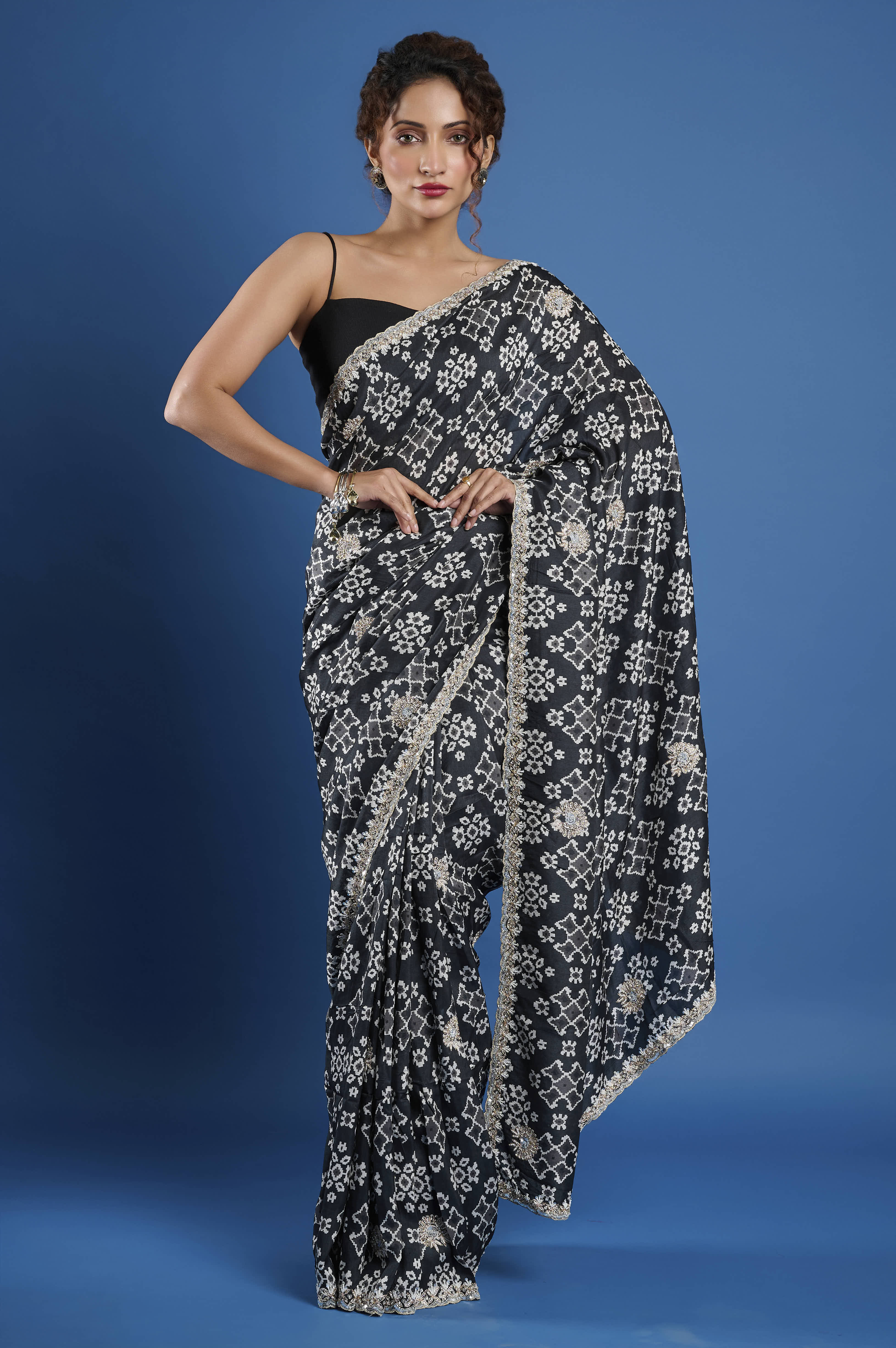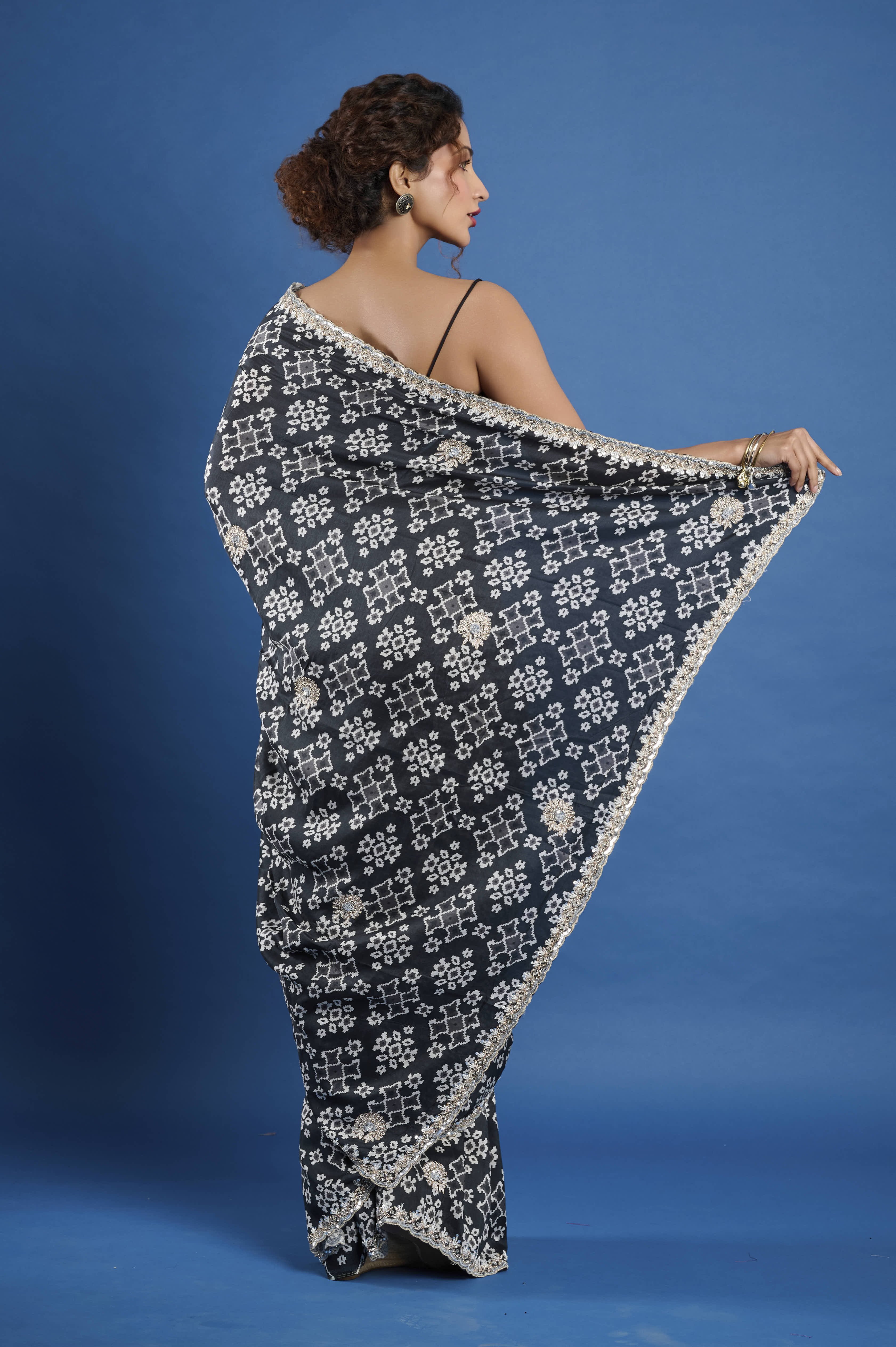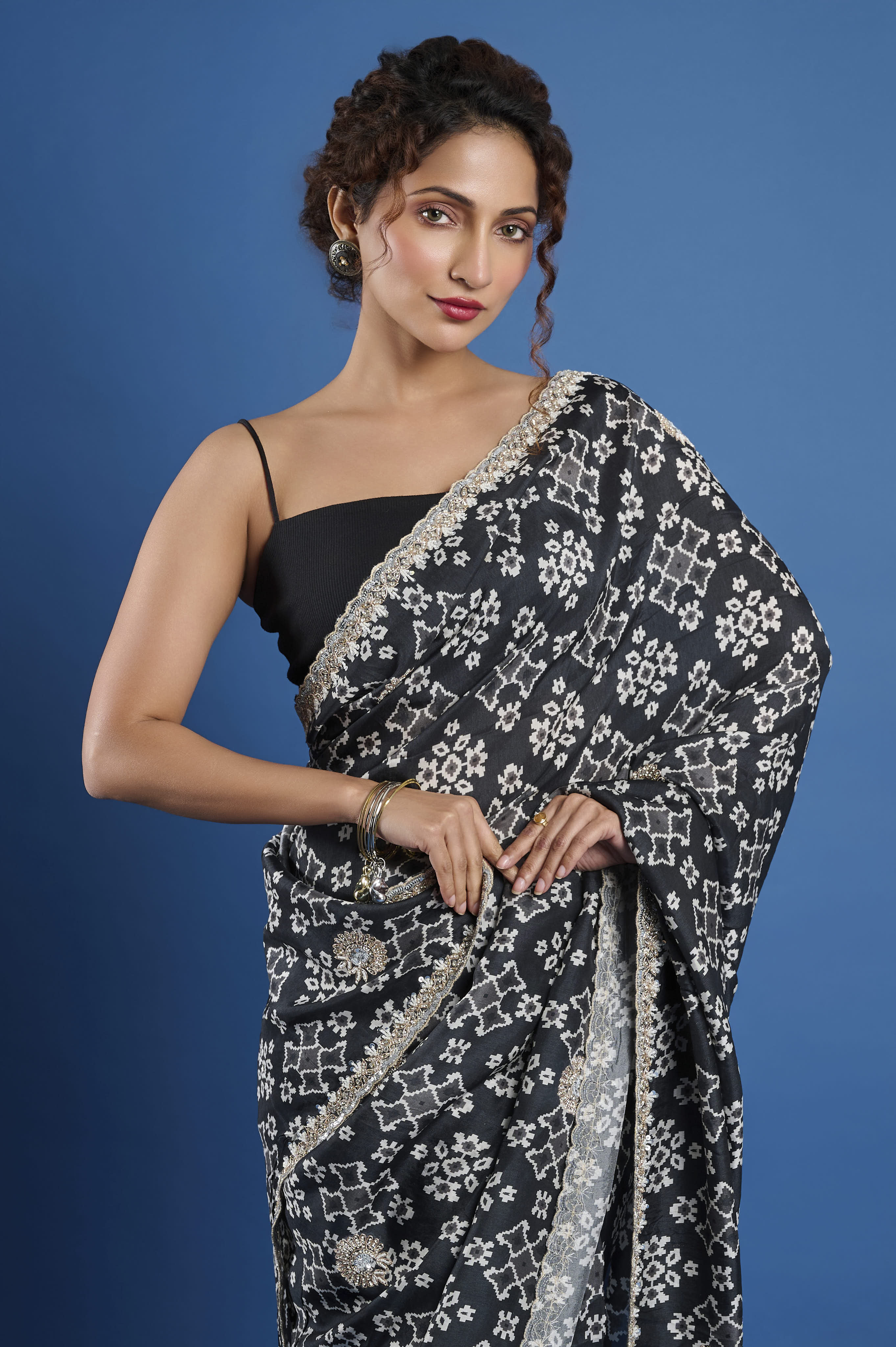 This black crepe saree features an elegant ivory hand-embroidered pattern all over, with intricate artisanal work highlighted in the border and scattered motifs. Lightweight and fluid, the crepe fabric offers a comfortable drape, while the detailed handwork, including delicate beadwork and metallic threads, adds richness and festive appeal. The design balances traditional techniques with contemporary graphic patterns, making it perfect for evening events and sophisticated celebrations.