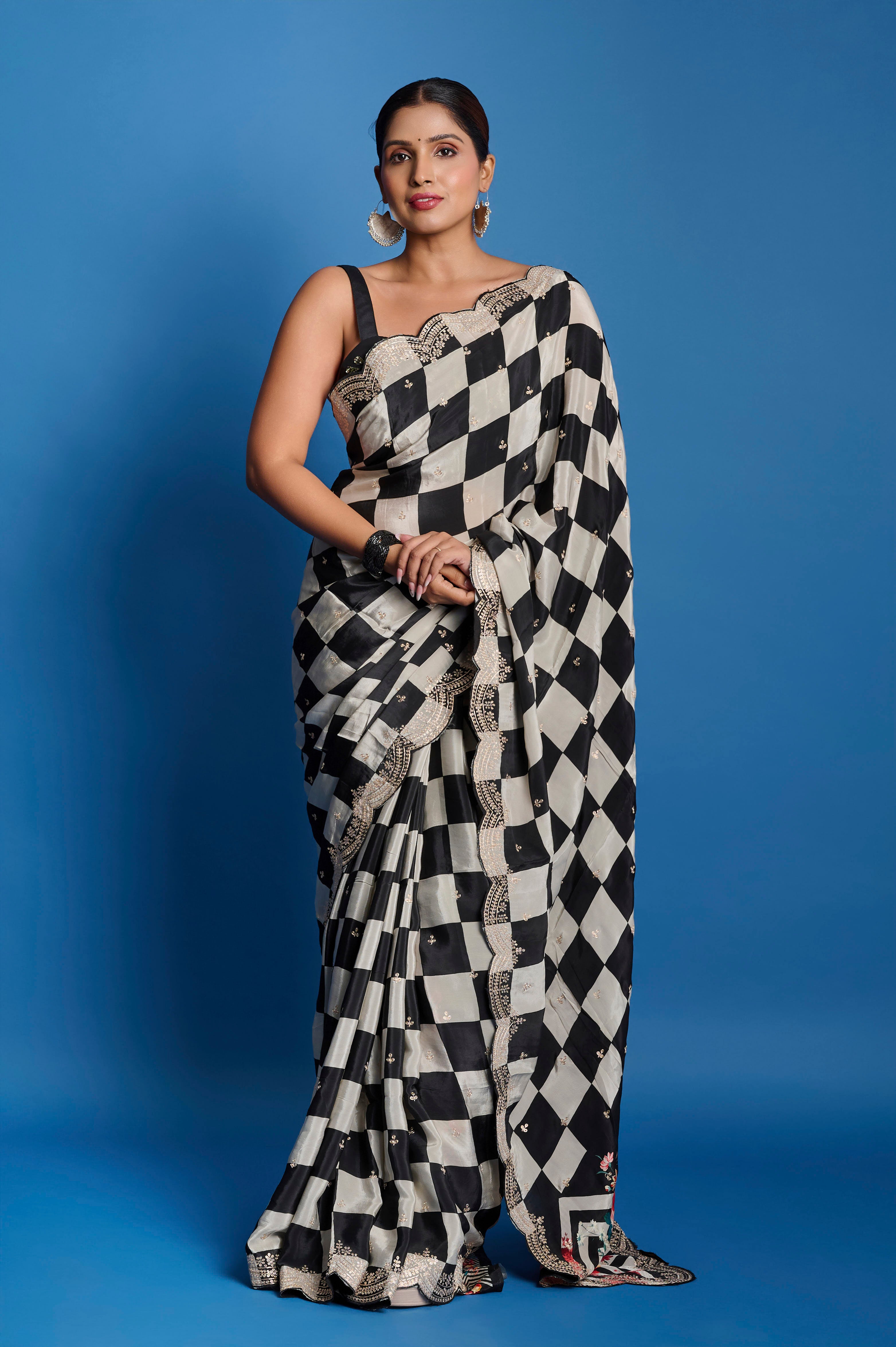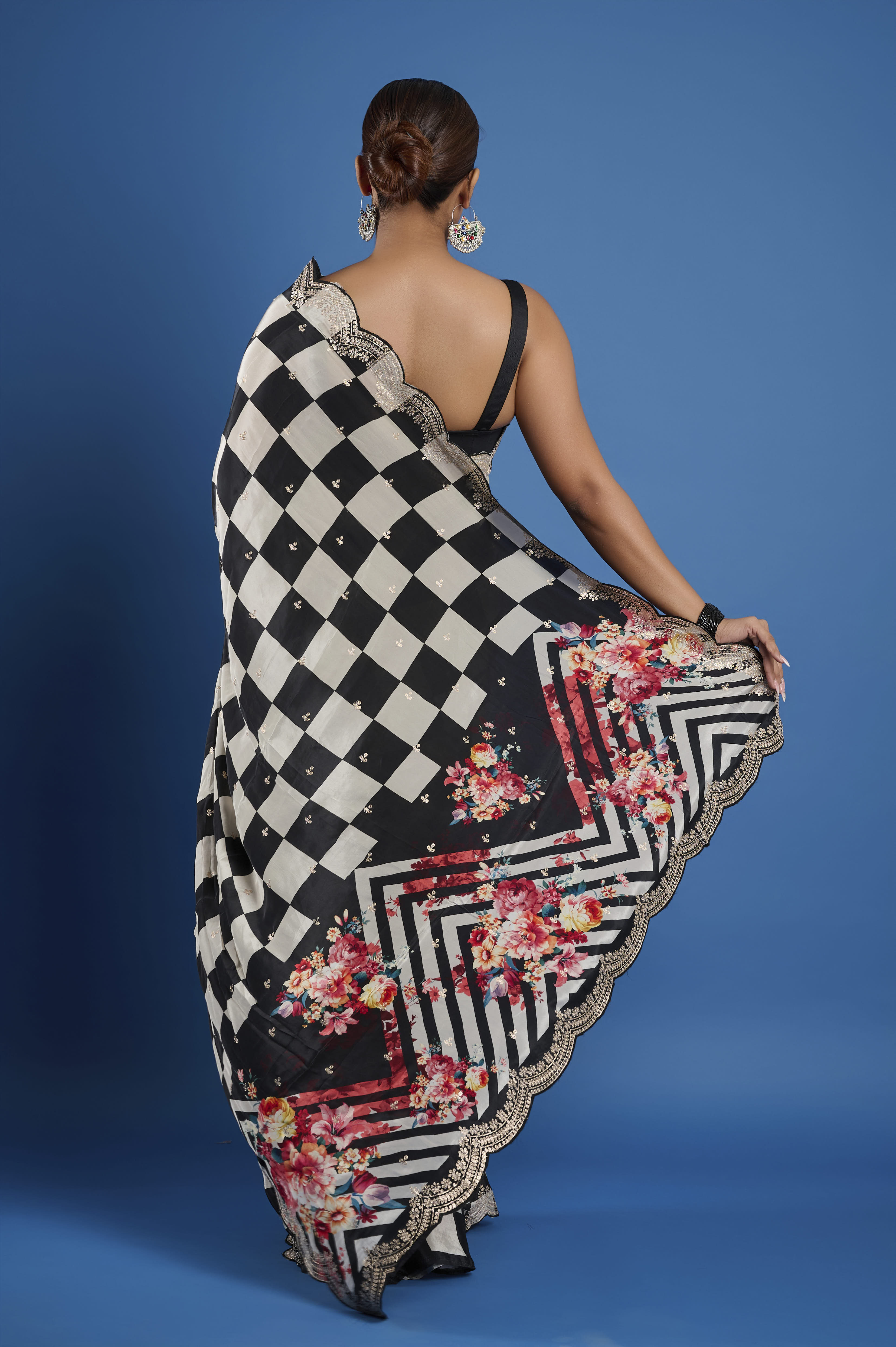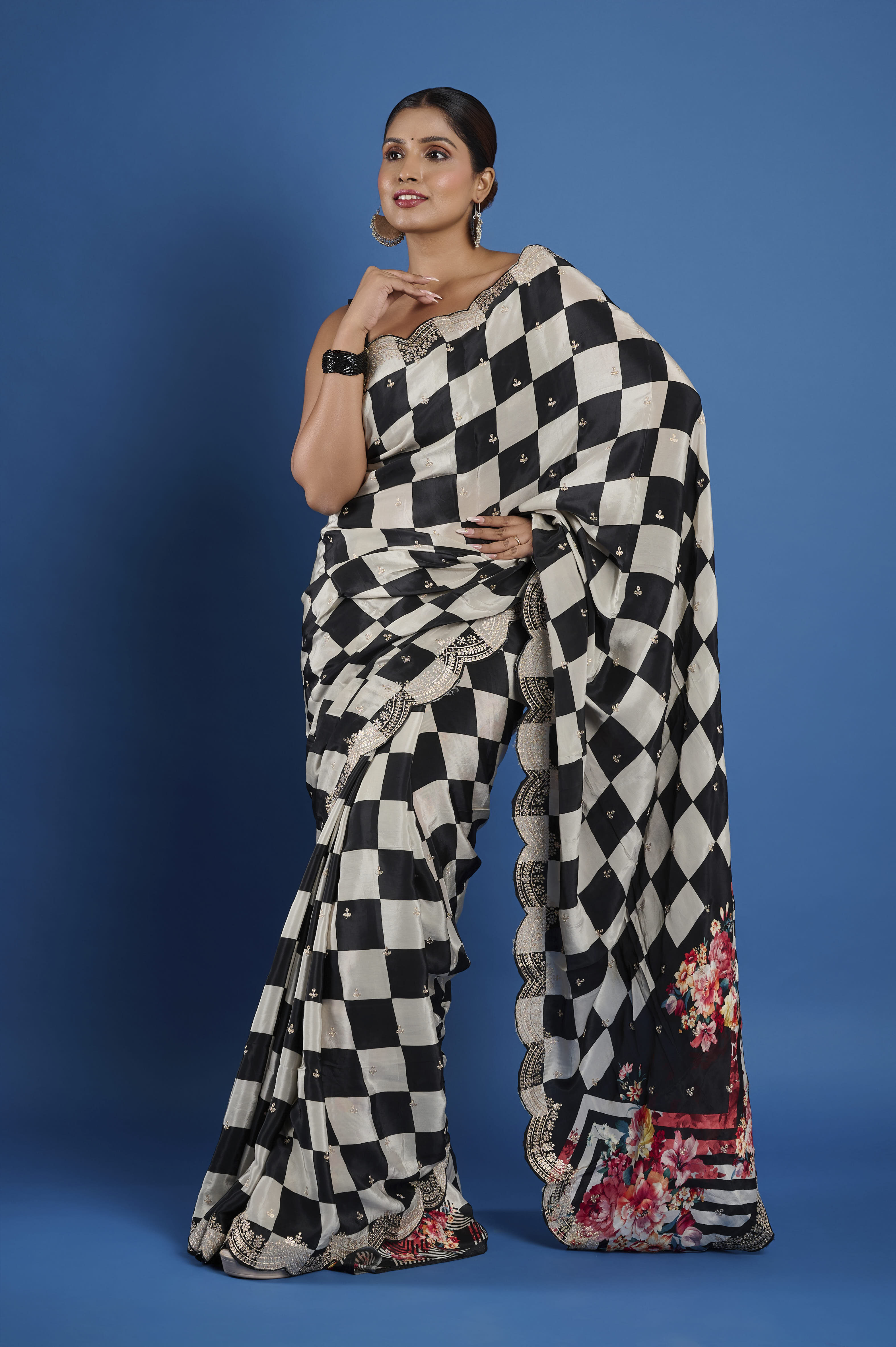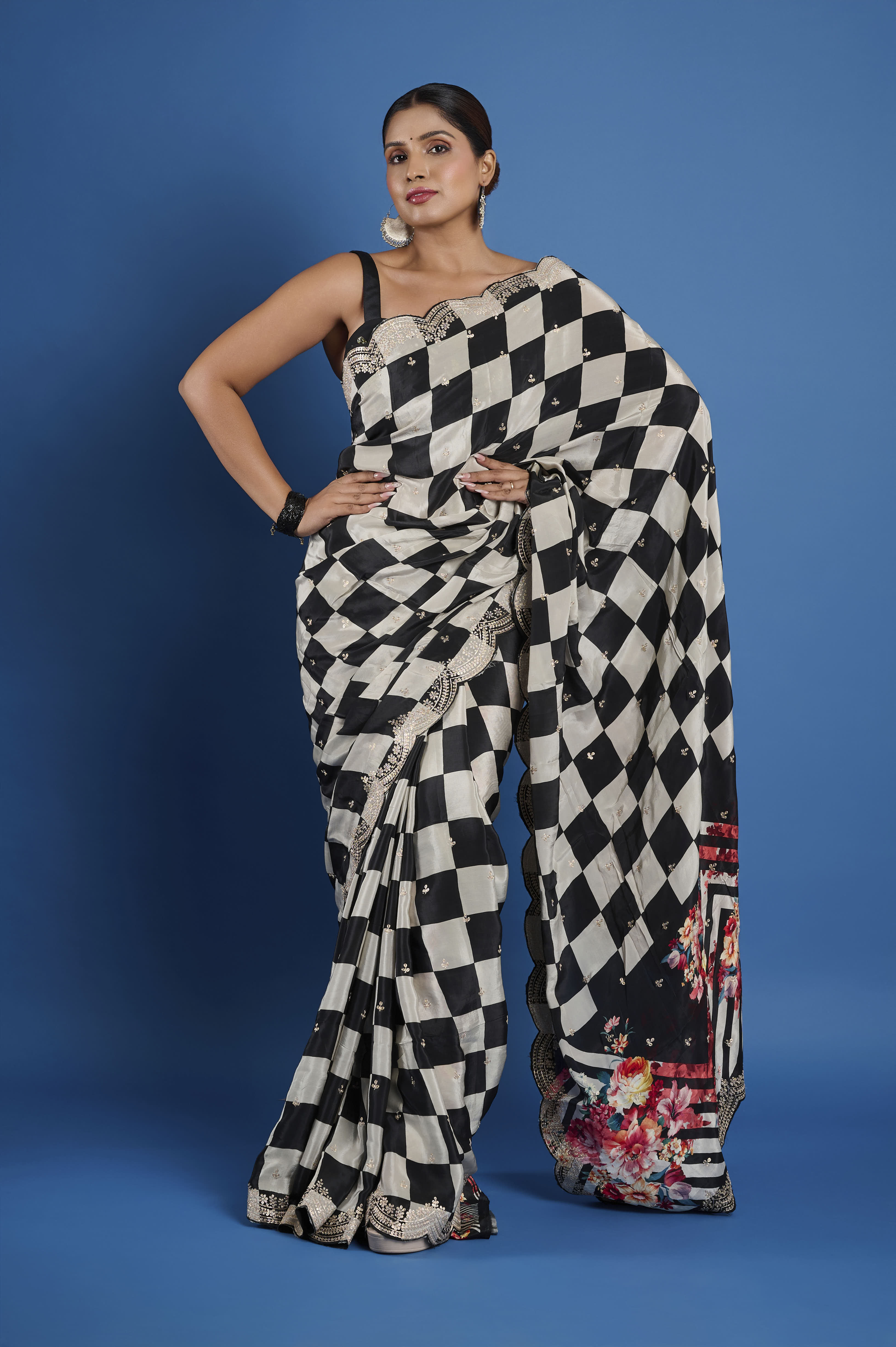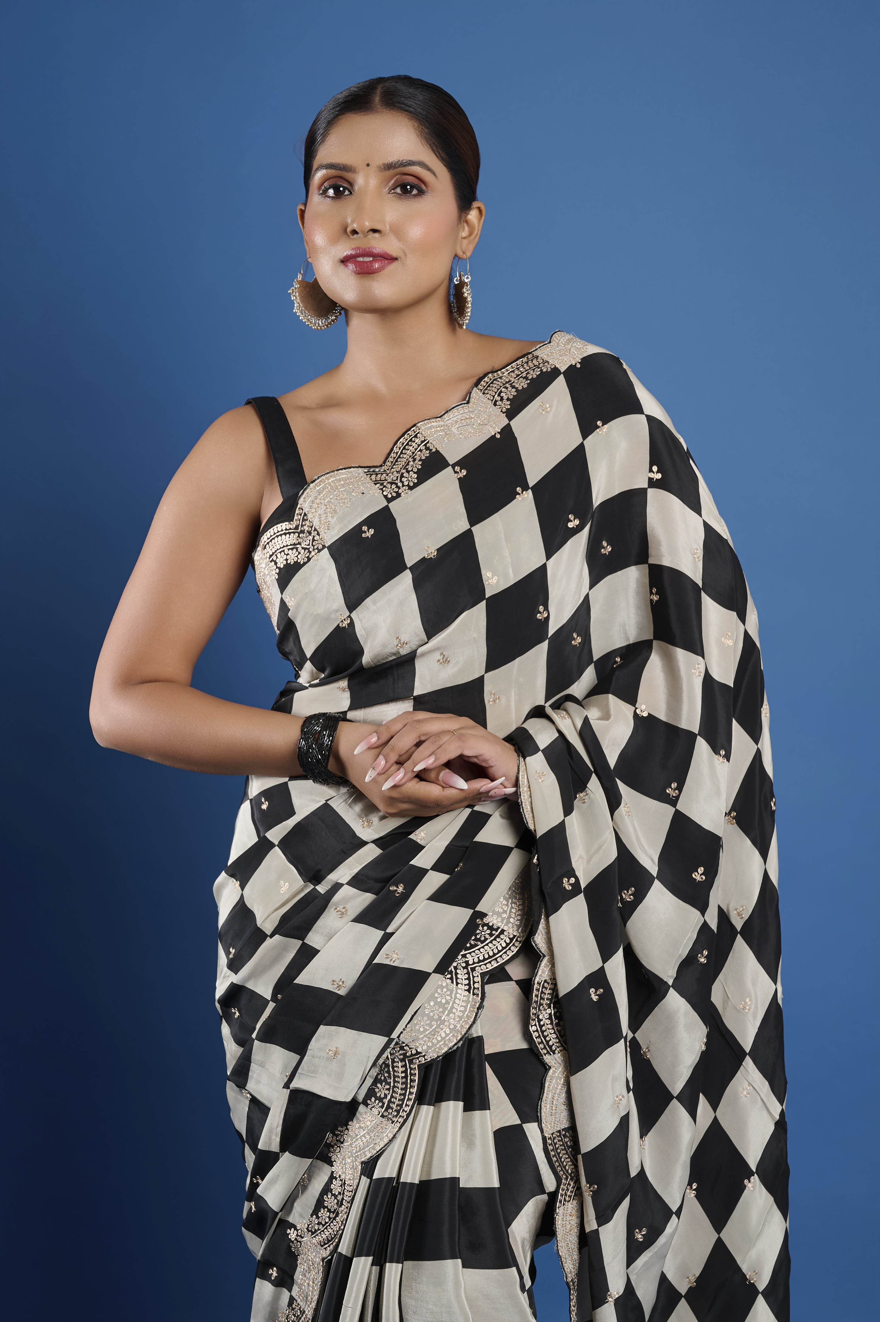 This luxurious black and ivory checkered crepe saree stands out with exquisite hand-applied peeta work. The drape showcases a contemporary large-B/W check pattern accented with delicate floral digital prints and geometric striping along the pallu, all bordered by an intricate scalloped edge detailed with peeta (zari and metal thread) handwork. Lightweight crepe lends a fluid, modern silhouette, making this saree perfect for festive evenings, cocktail parties, and signature celebrations. Comes with a complementary unstitched blouse piece for custom tailoring.