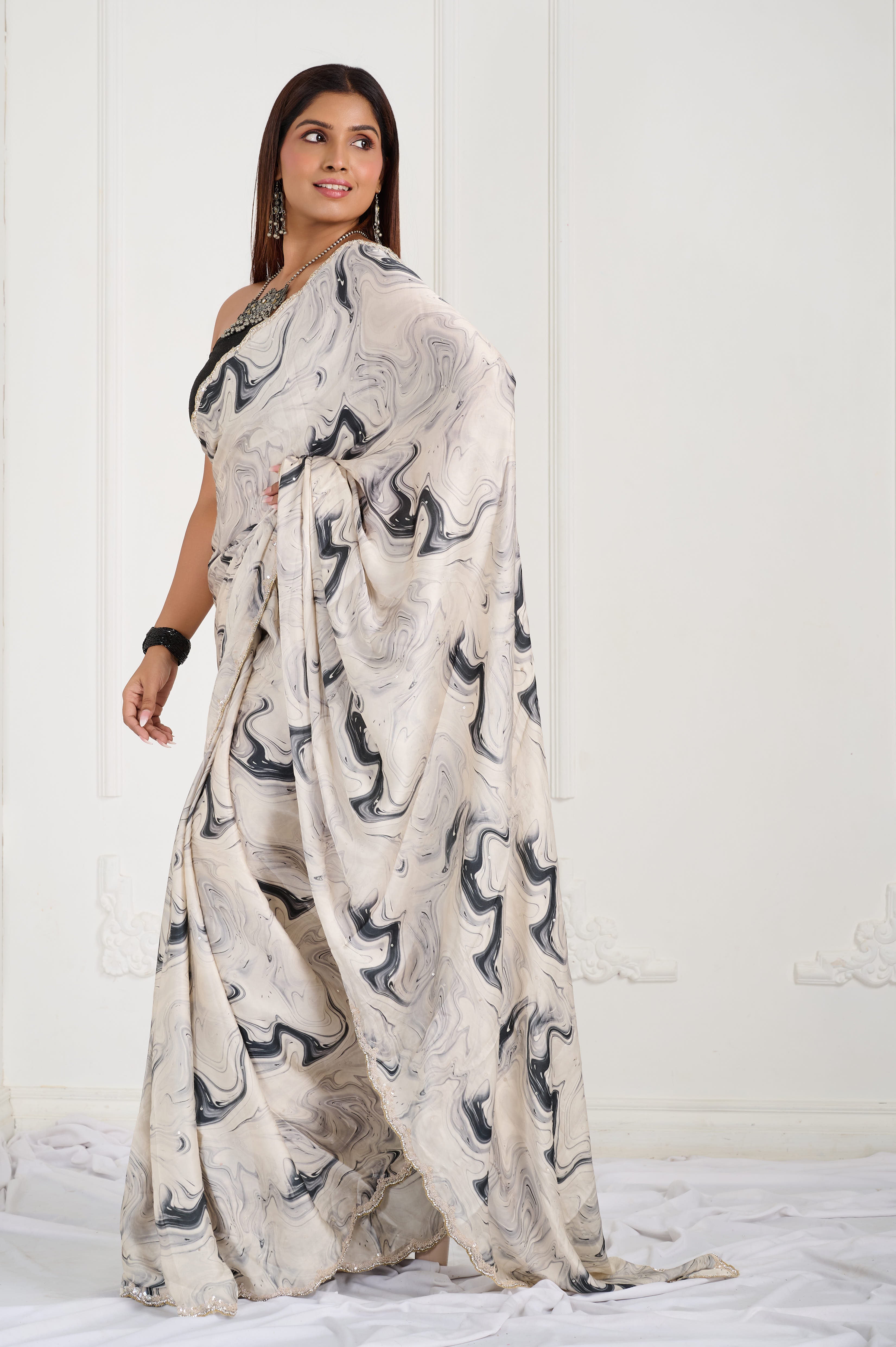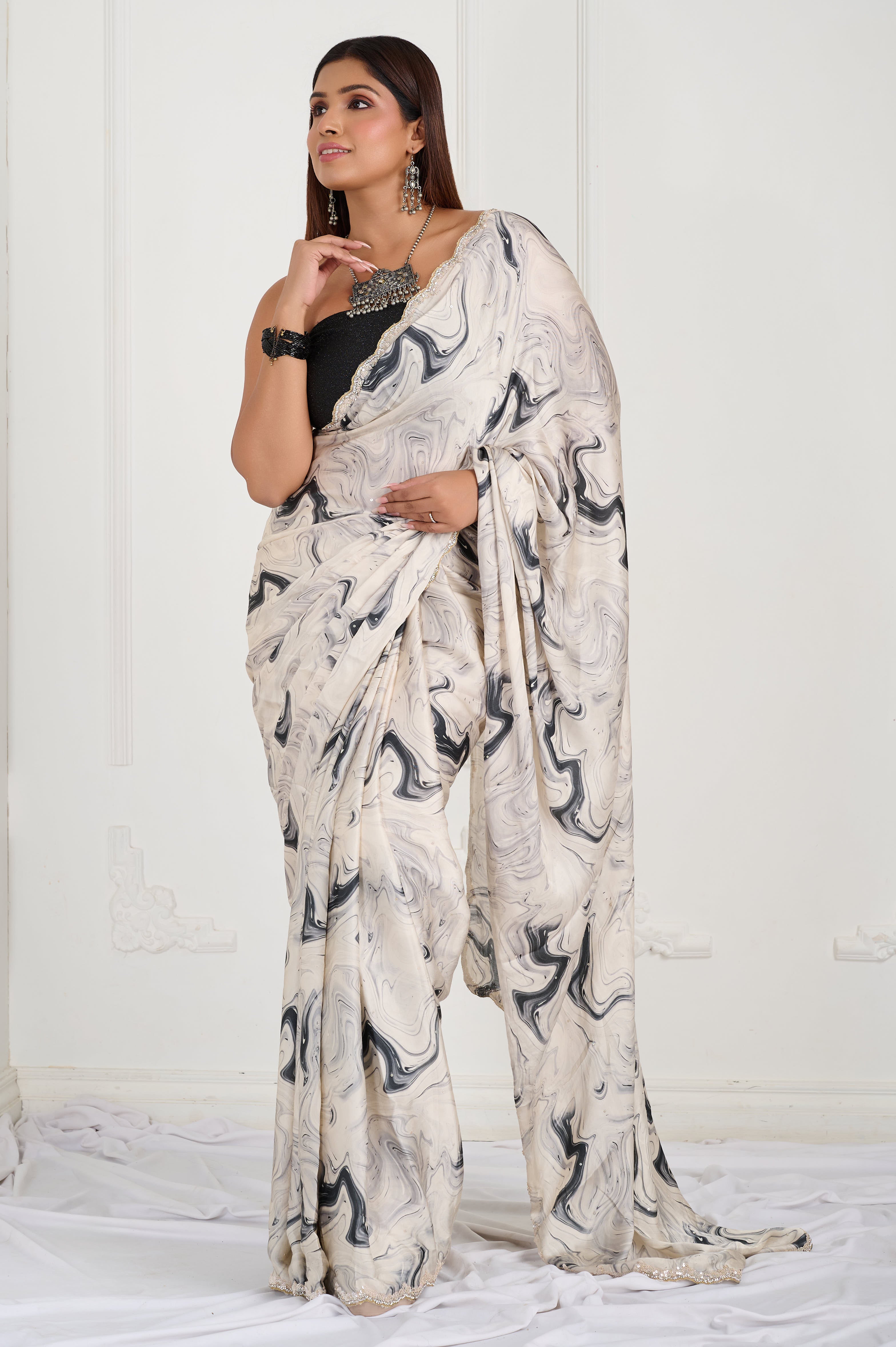A contemporary crepe satin saree with a striking marble-swirl digital print in ivory, dove grey and graphite. Finished with a refined champagne-silver scallop lace and subtle micro-sequin hand highlights. Smooth sheen, fluid fall and crisp pleats, ideal for cocktail nights, receptions and gallery-chic evenings.