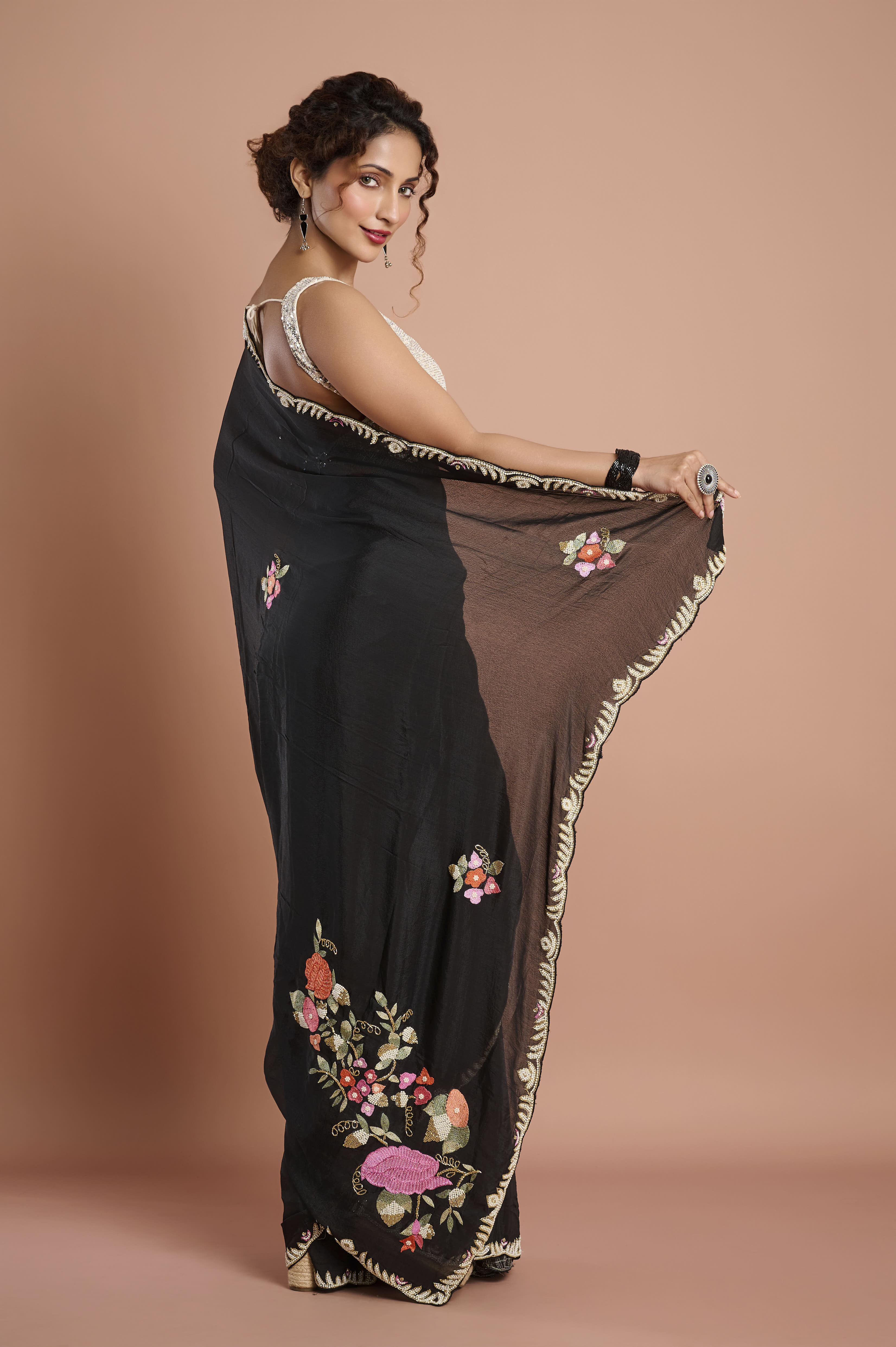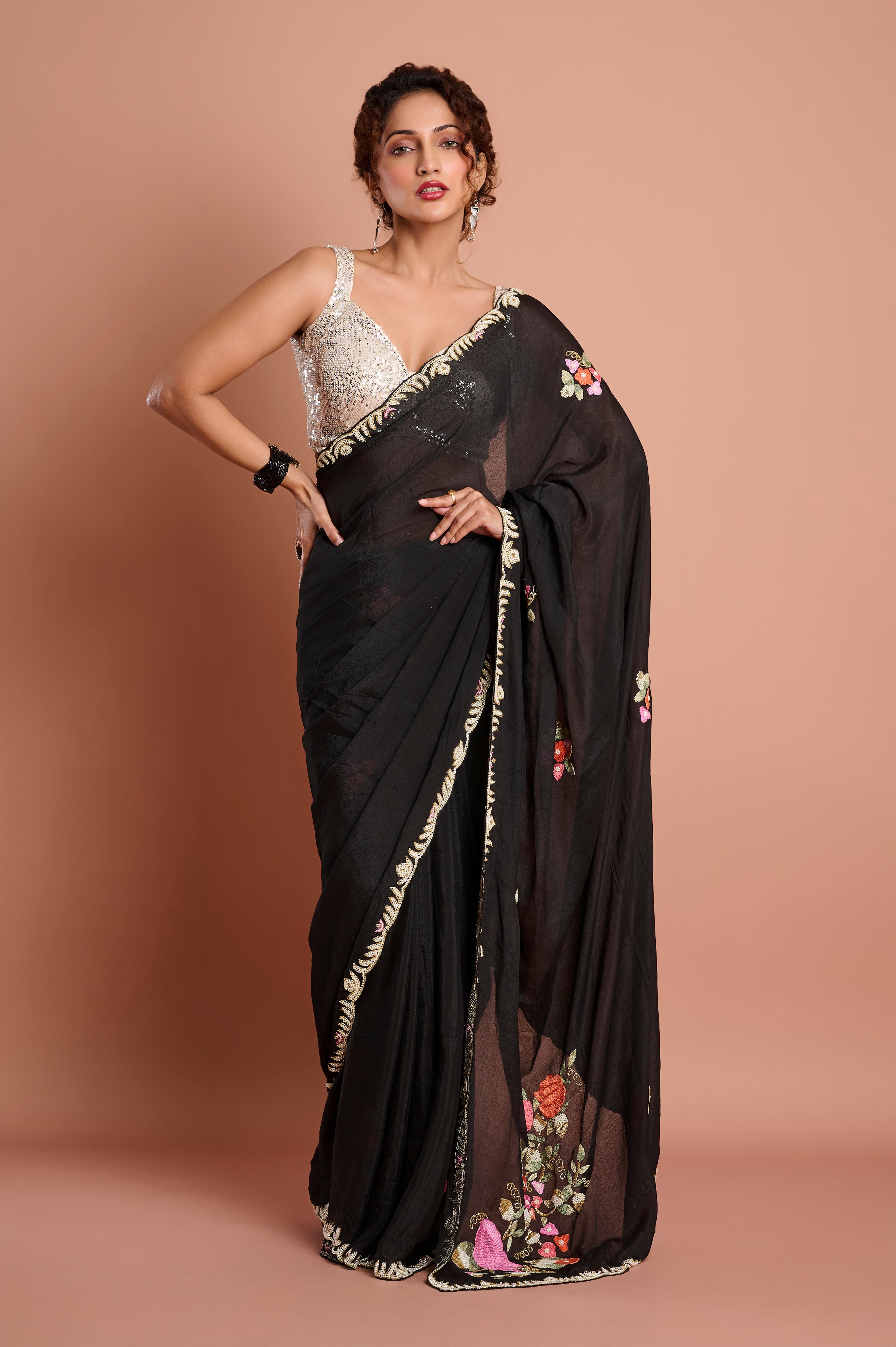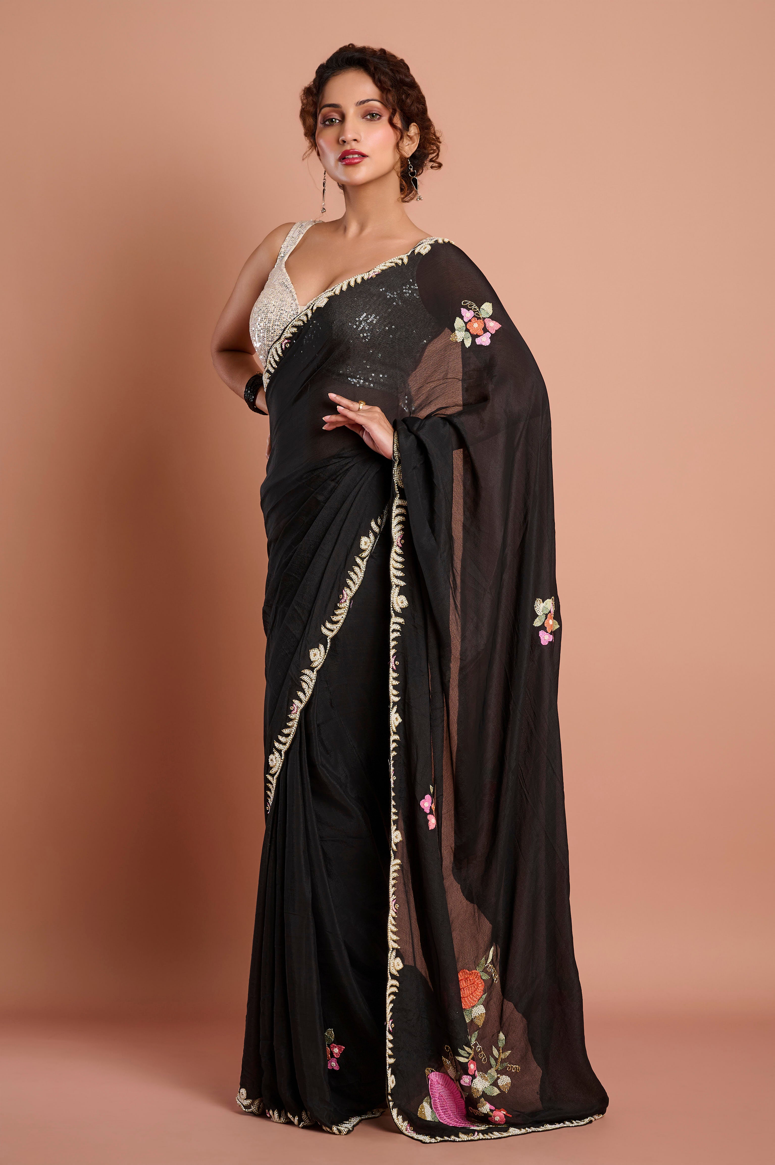 Step into any event with elegance in this luxe black Chinon saree, expertly handcrafted with vibrant floral embroidery scattered across the body and along the pallu. The saree features a distinctive thread-embroidered scalloped ivory border, lending a striking contrast and artisan flair to the fluid, lightweight Chinon fabric. Its sheer drape and delicate work make it an ideal pick for cocktail parties, festive evenings, or intimate celebrations. An unstitched blouse piece is provided for your personalized finish.