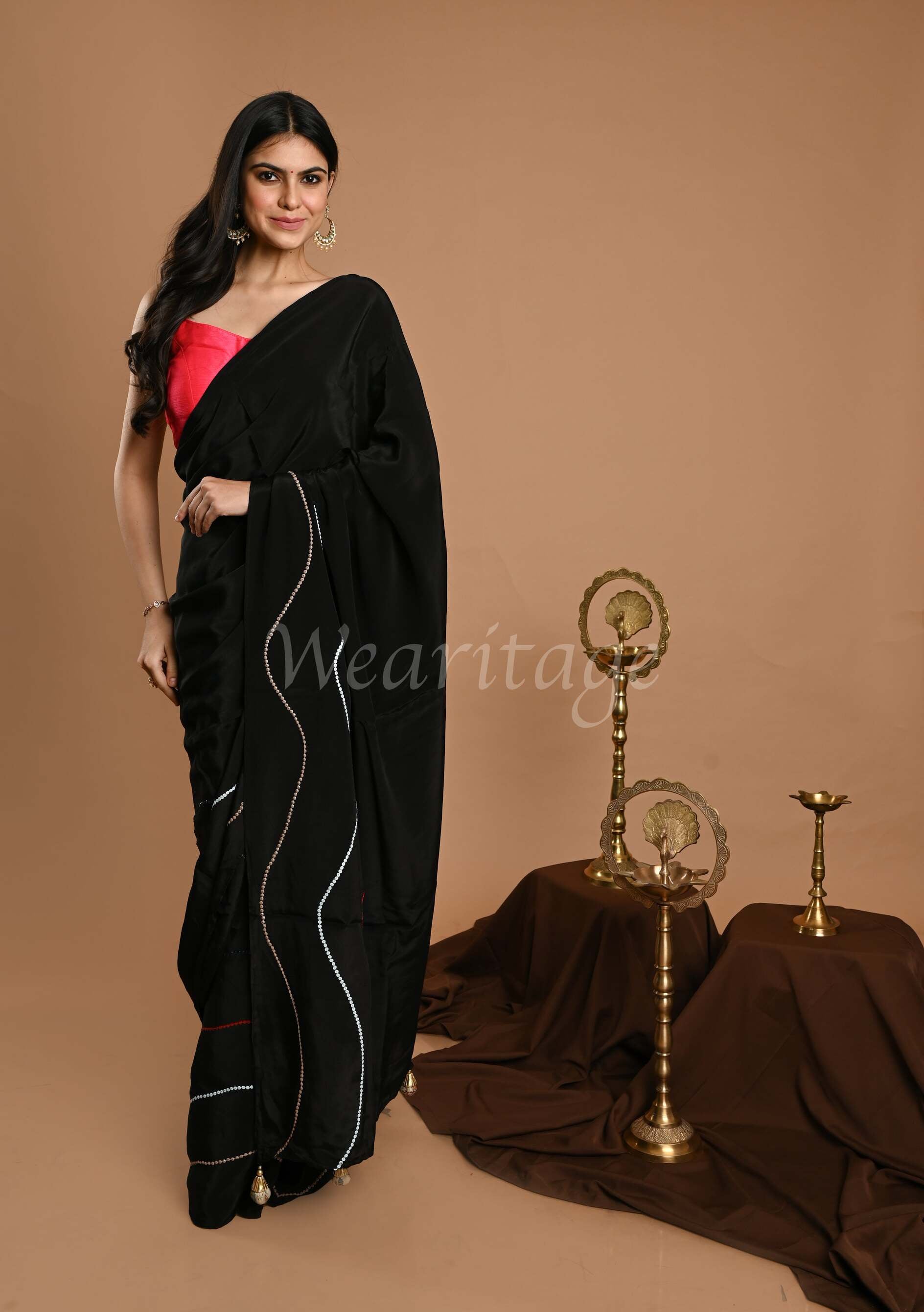 This beautiful black cocktail saree with sequins work and designer blouse gives a classy look and a perfect attire for a party.