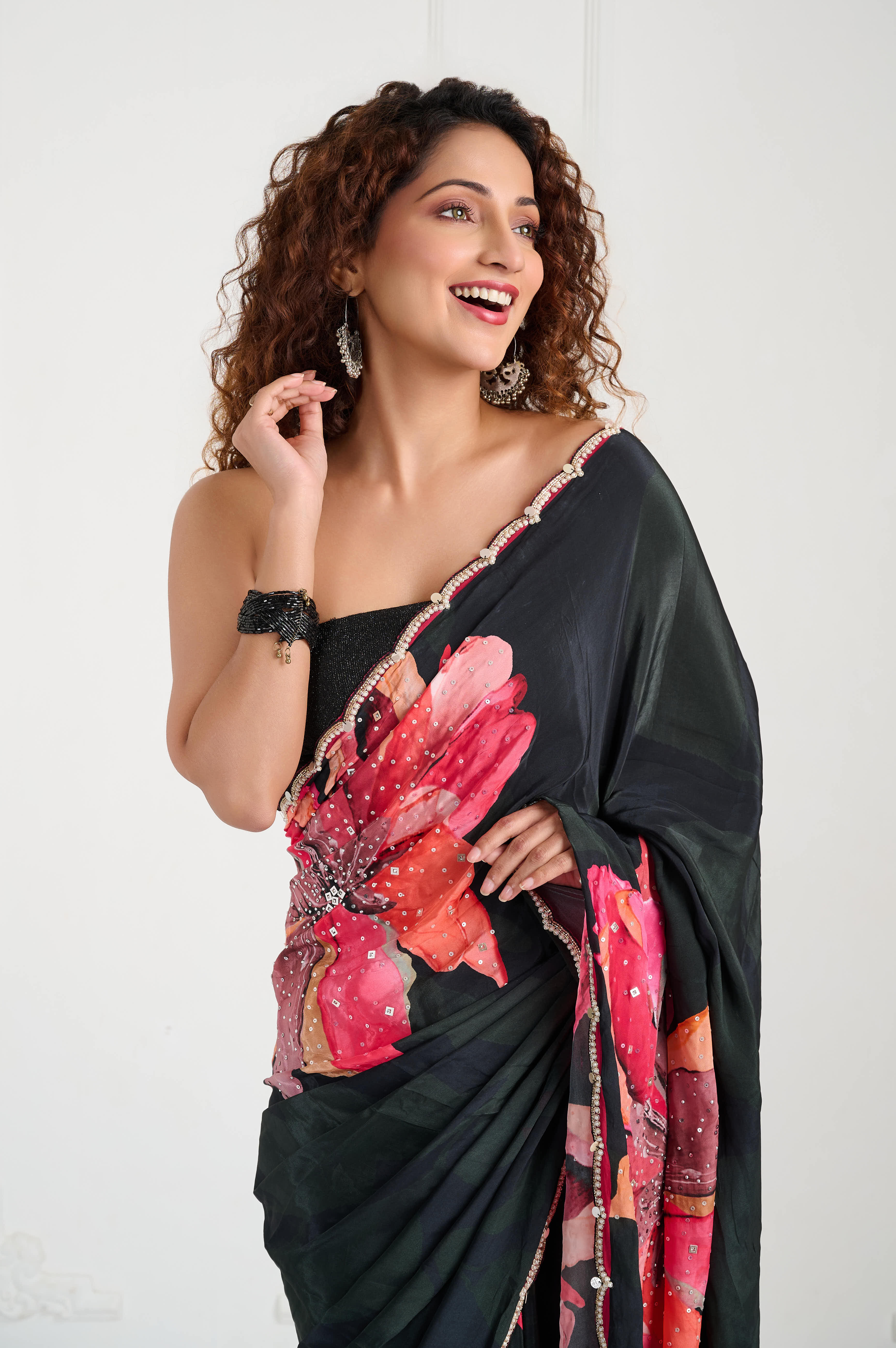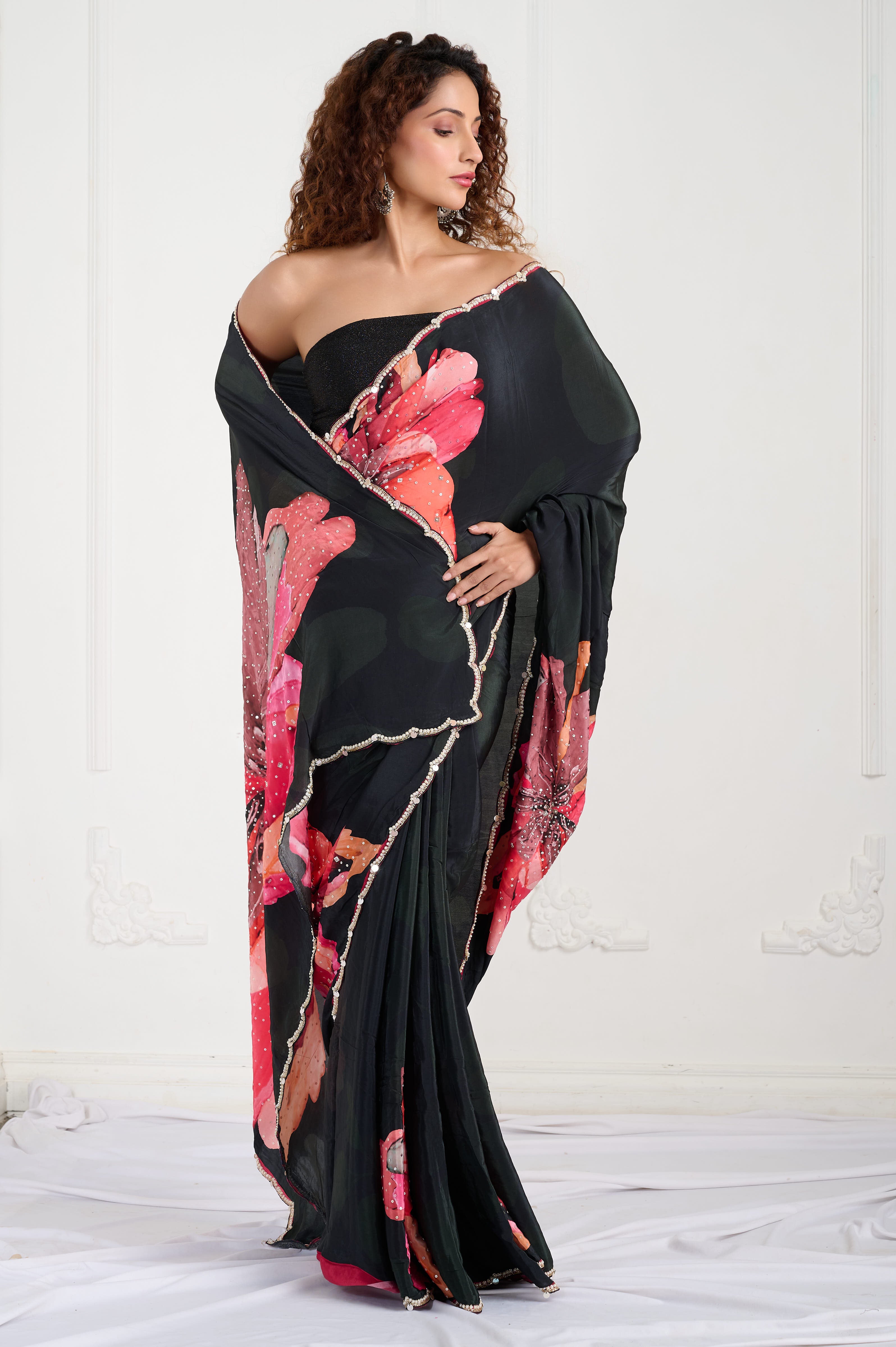 A striking crepe saree on an inky black base with oversized coral-pink floral placements. Accented with a flowing pearl-scallop border and a hand-embellished hip motif (sequins, stones, cut-dana) with fine dotted highlights across the petals. Soft, fluid fall that pleats crisply. Perfect for cocktail nights and modern festive looks.