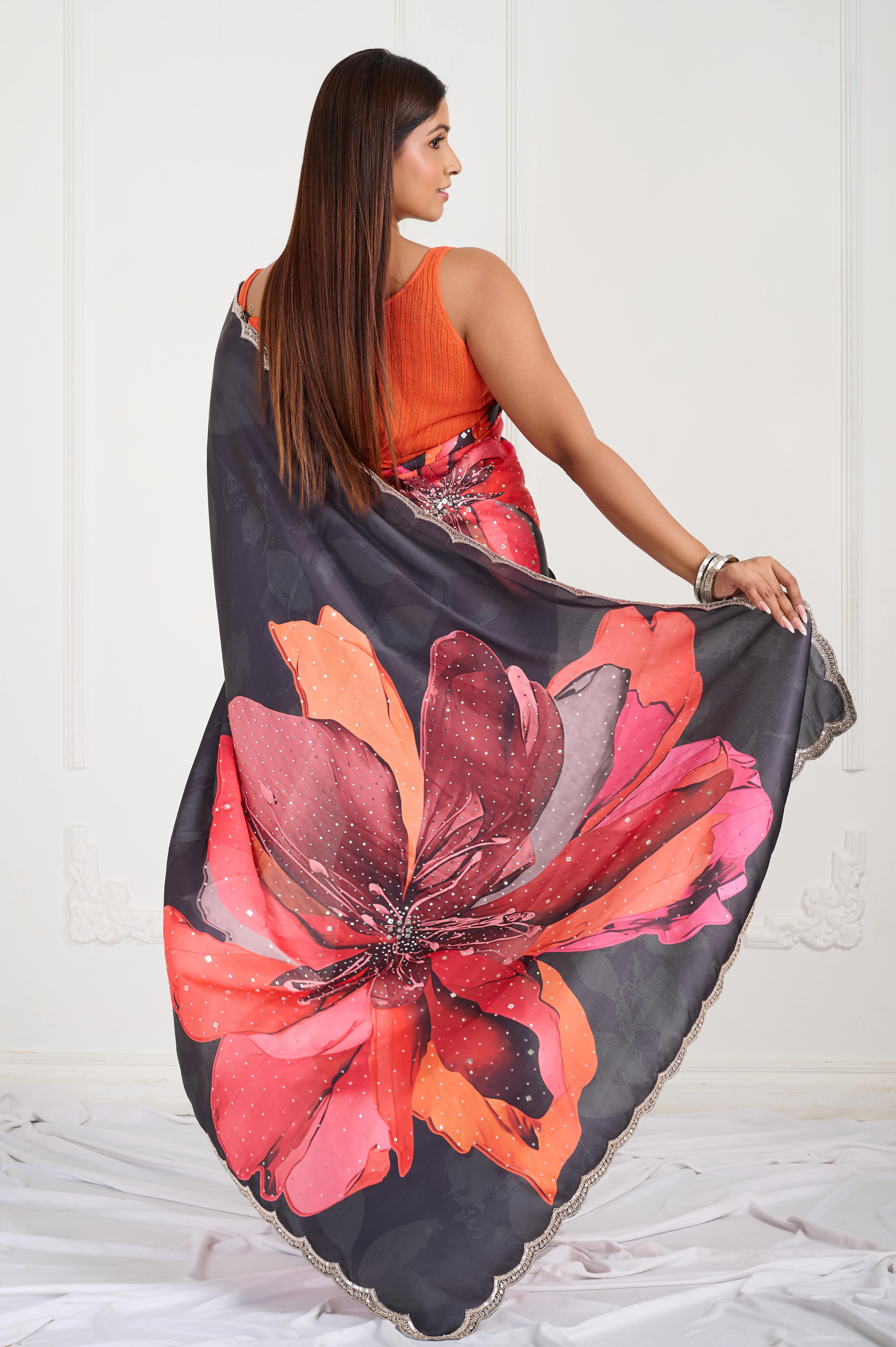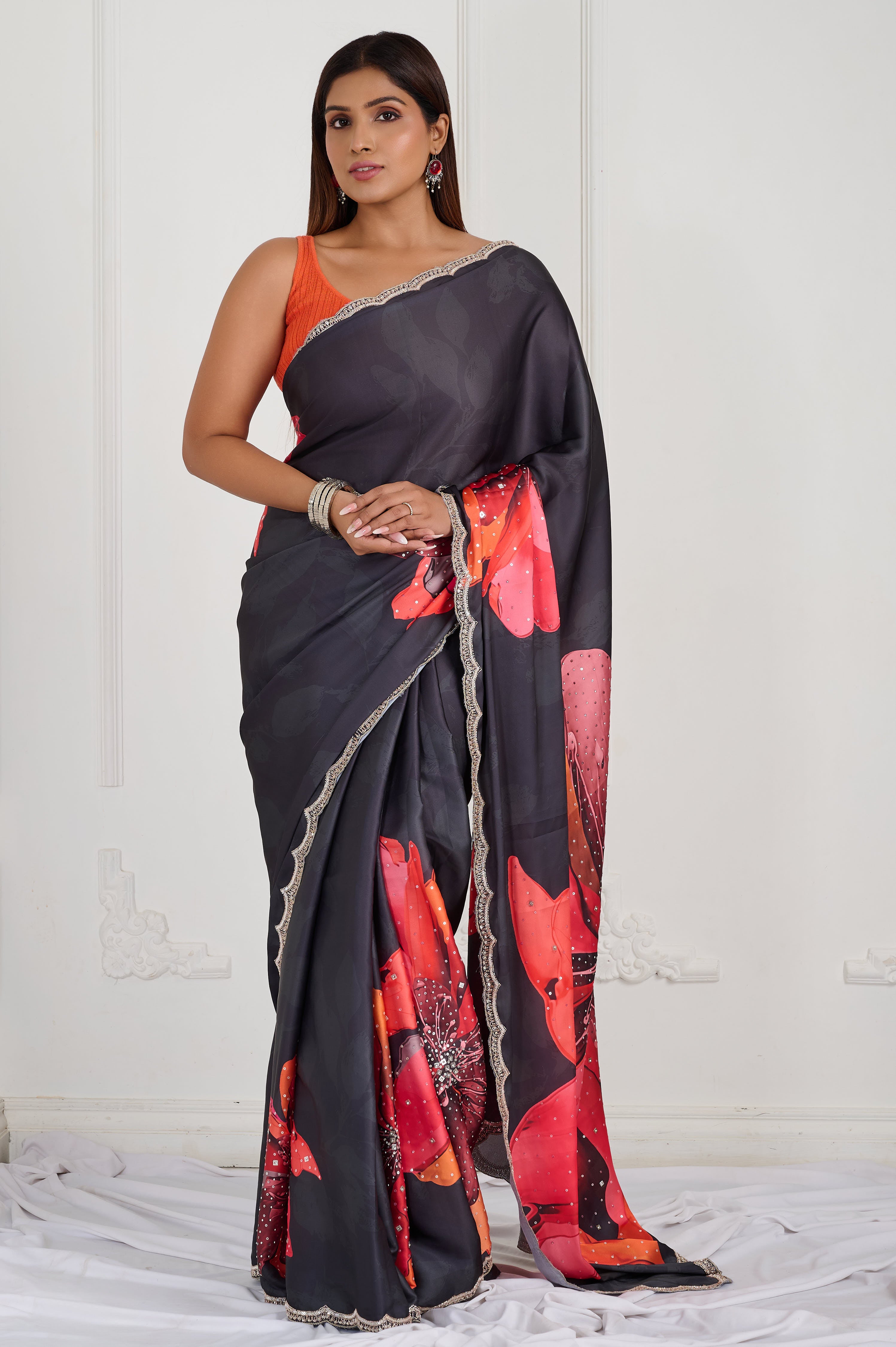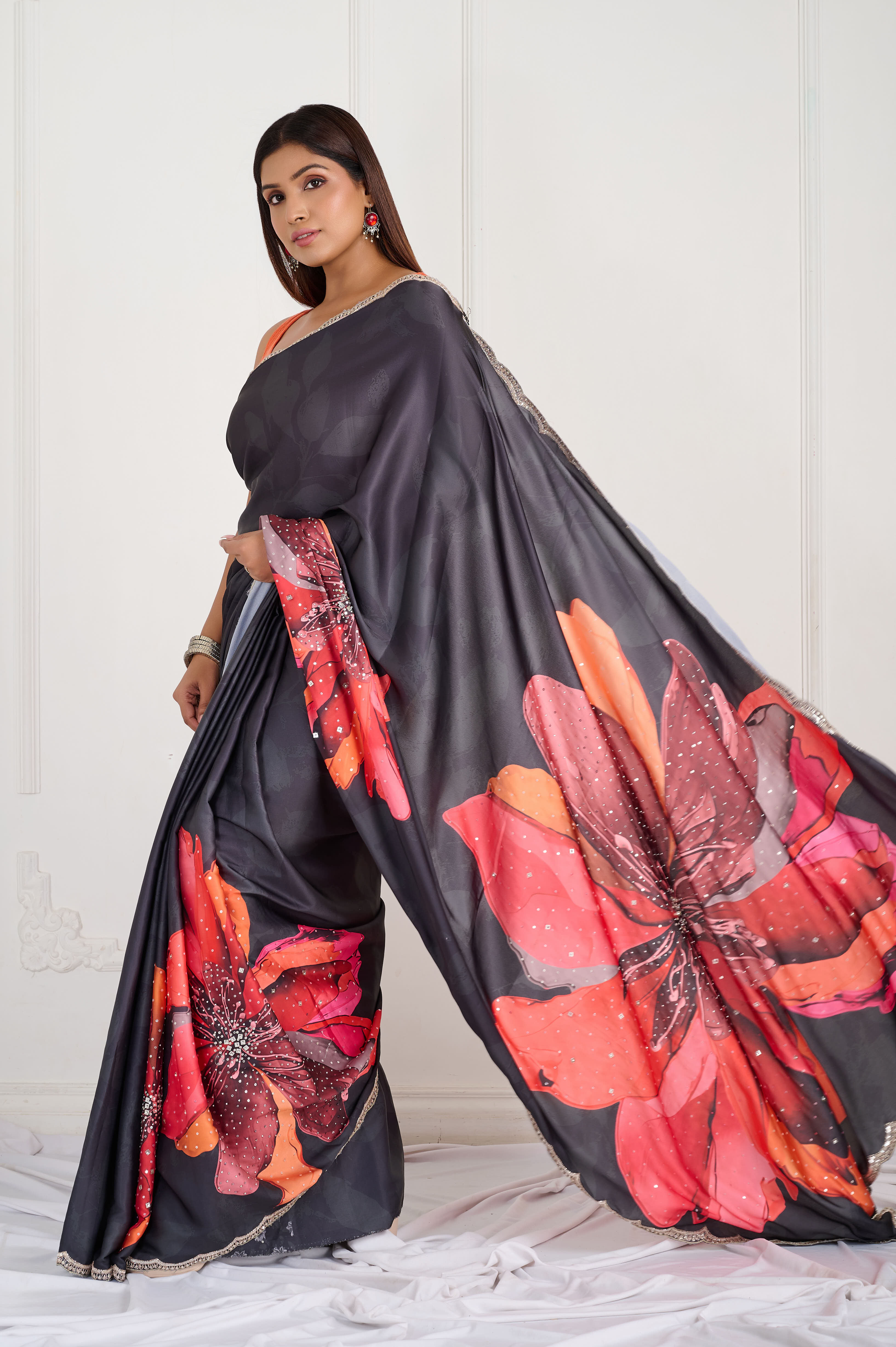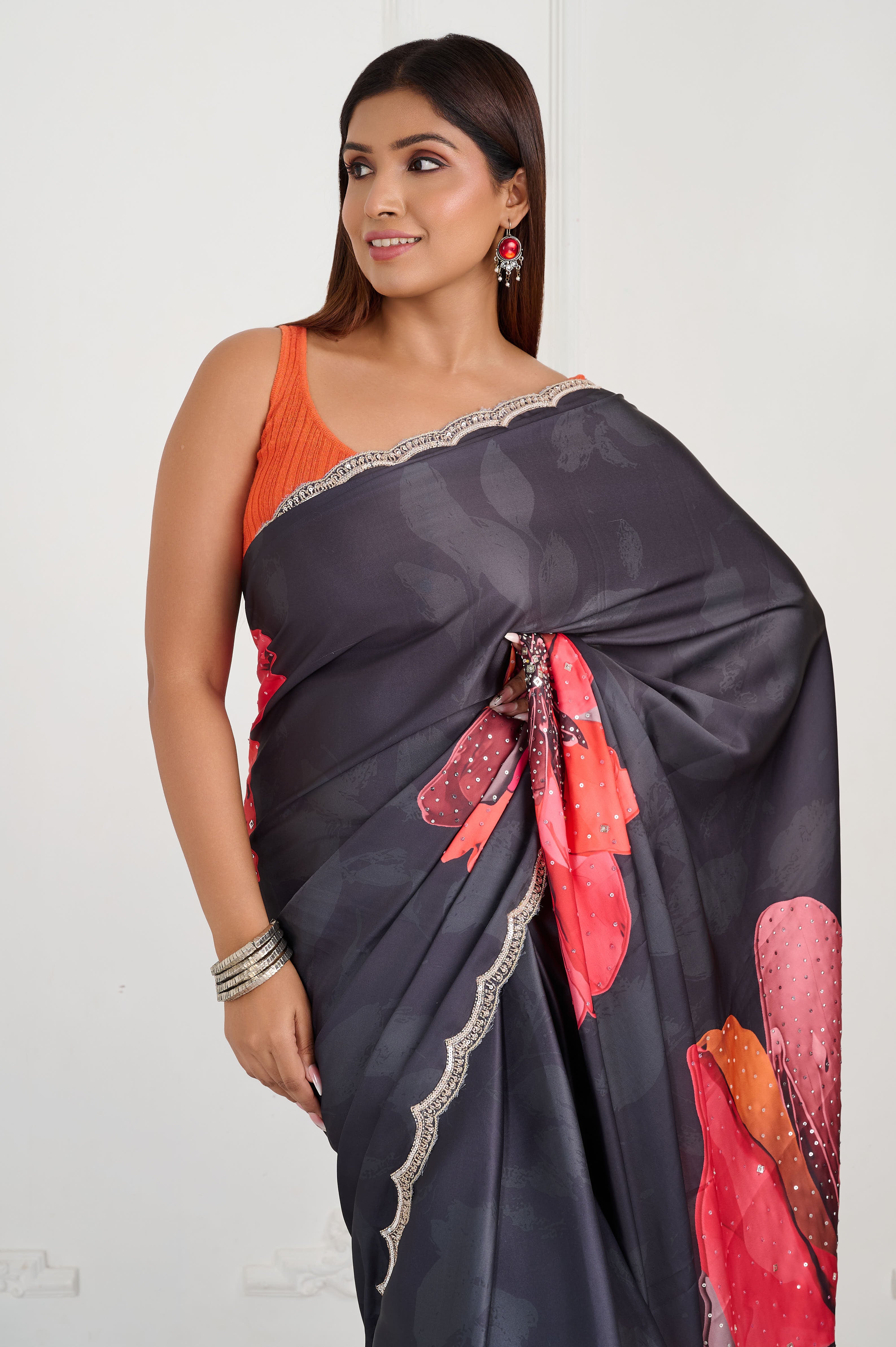A luxe satin crepe saree in deep onyx black with a subtle tonal shadow print and bold coral-pink petal placements at the pallu and border. Finished with a champagne scallop lace edged in fine cut-dana/sequin work and soft dotted highlights across the blooms. Smooth sheen, fluid drape and crisp pleatsÑperfect for cocktail nights and modern festive looks.