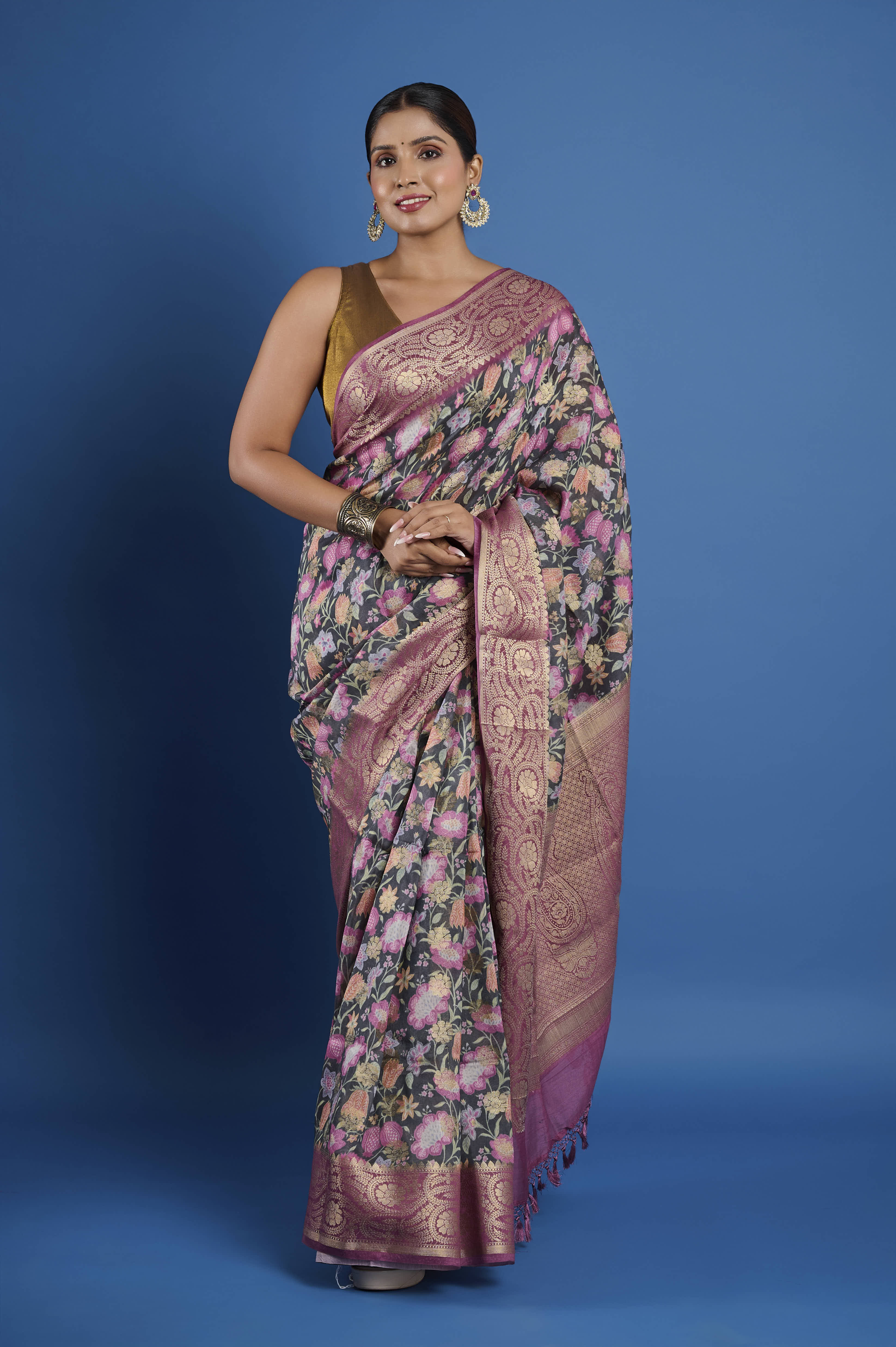 This pure Chanderi saree features a graceful digital floral print in soft pink, lavender, and pastel hues over a deep black base, elevated by a rich muted rose gold zari border and ornate pallu. The signature lightweight, sheer texture of Chanderi ensures a breezy, elegant drape with a subtle sheen, perfect for summer celebrations, semi-formal occasions, and festive gatherings. A matching unstitched blouse piece is included for easy custom tailoring.