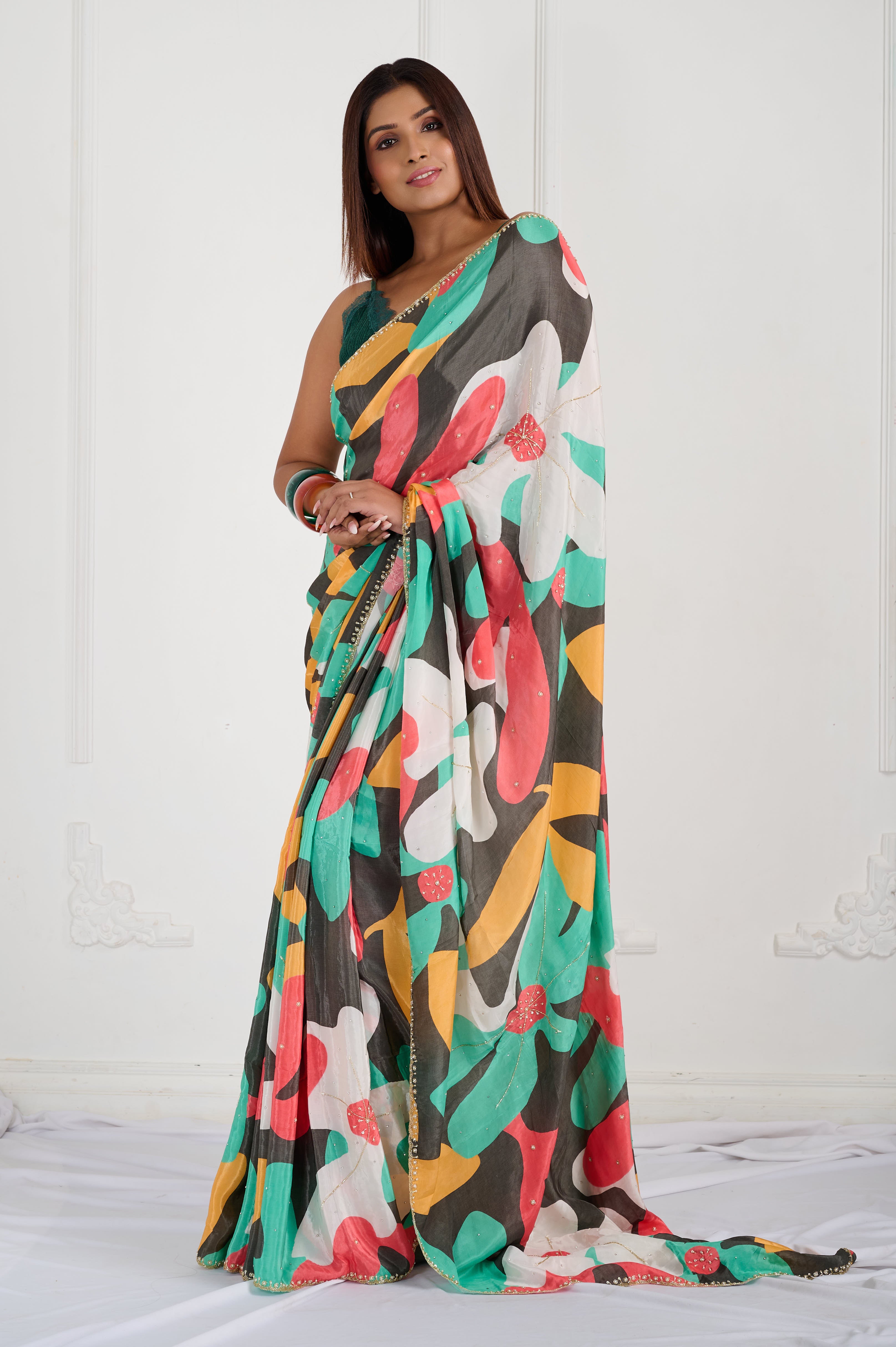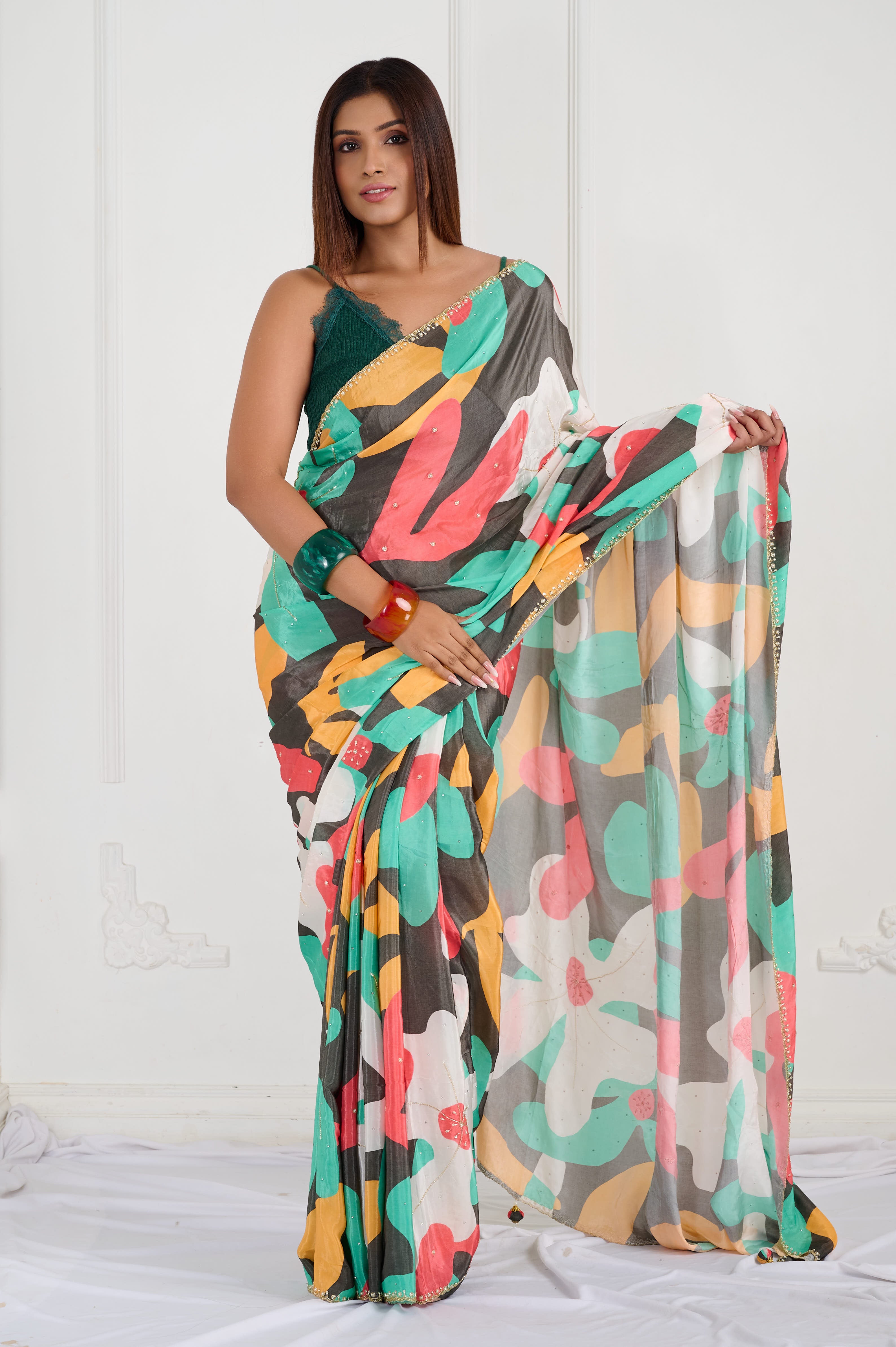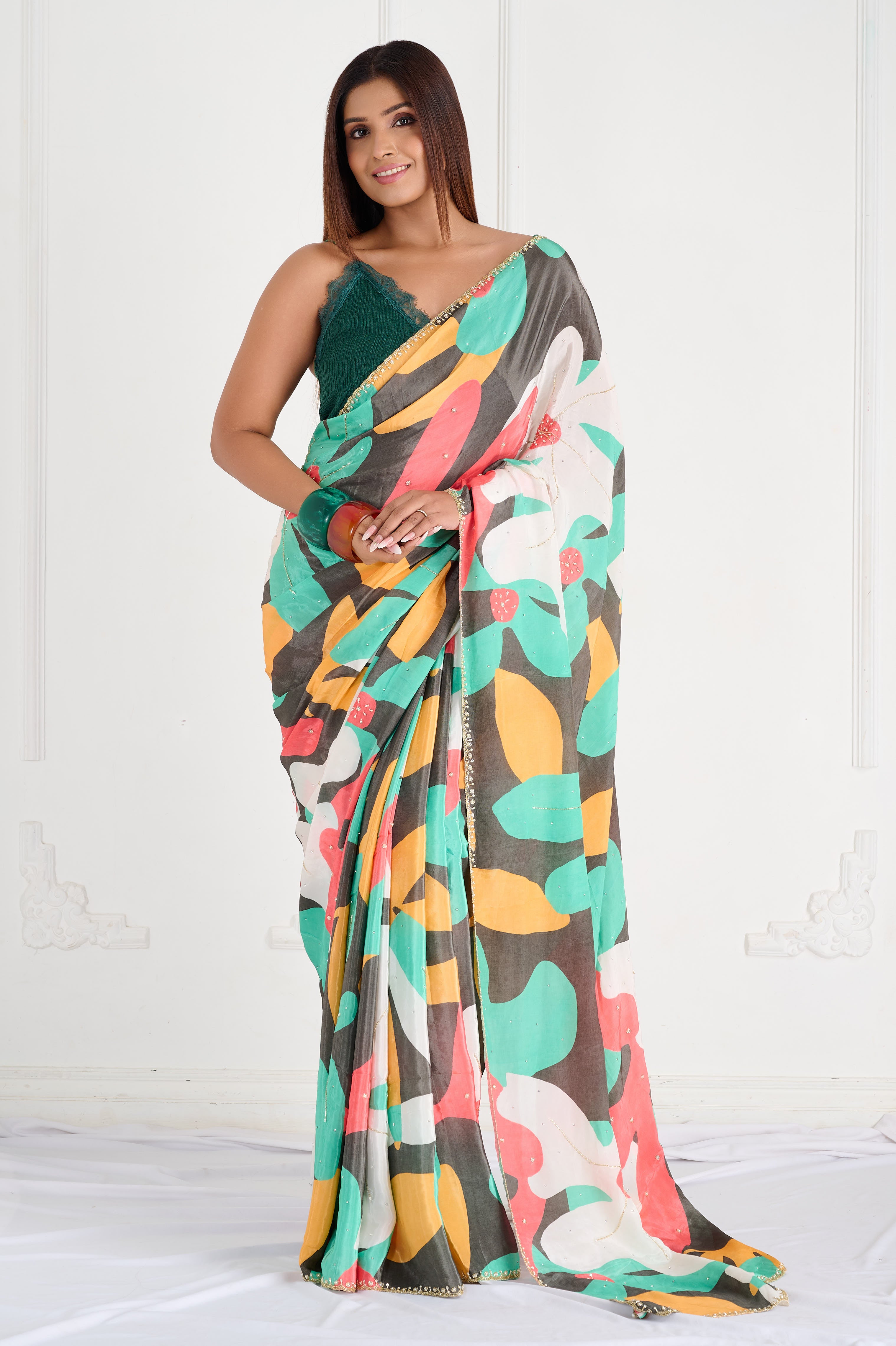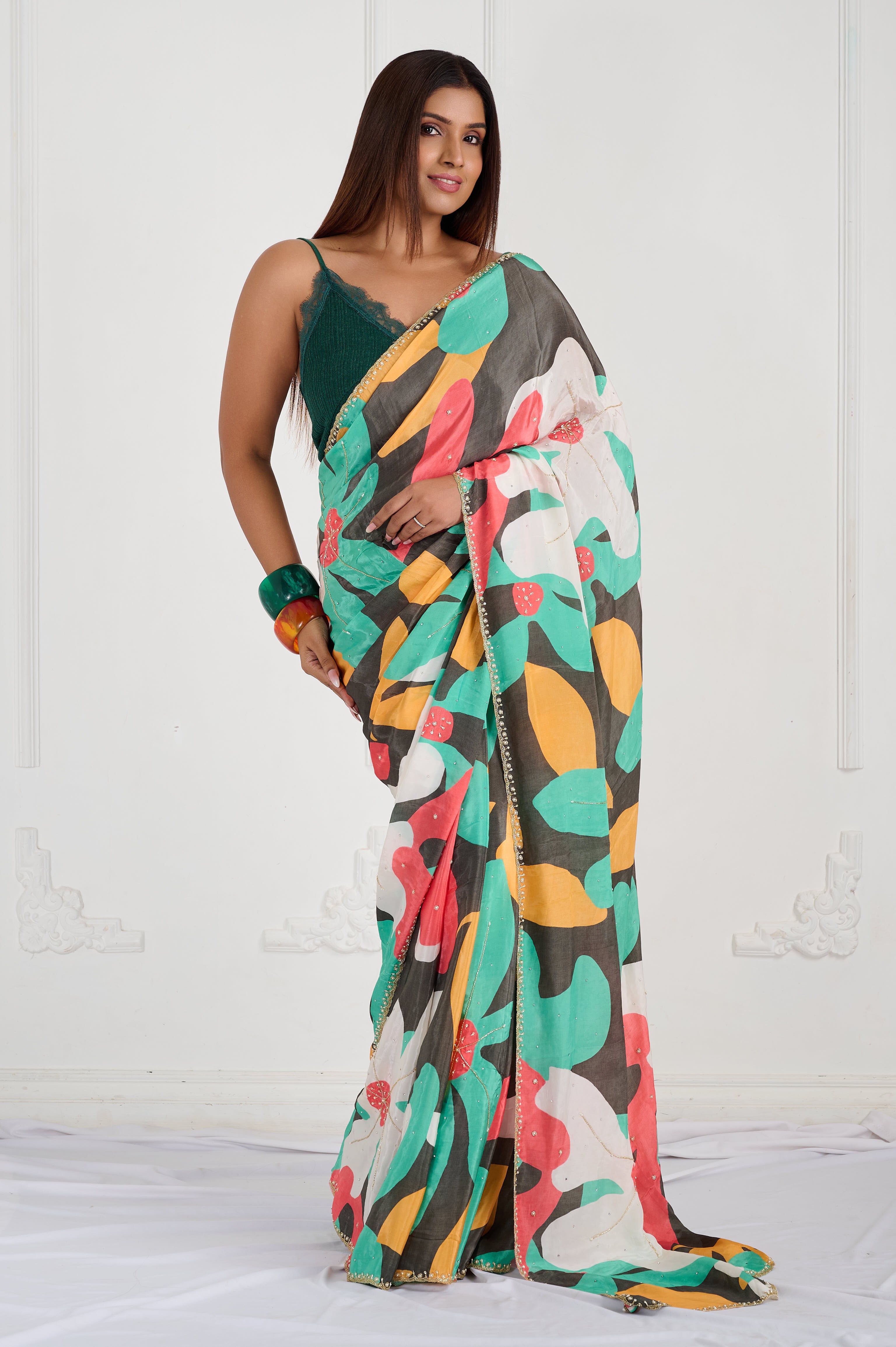 This vibrant Bamber Crepe saree features a dynamic multicolor abstract print with bold leafy and berry-inspired shapes in green, mustard, coral, and cream over a striking black base. The fabric is lightweight, silky, and soft to the touch, offering a fluid drape and comfortable wear even in warm climates. This saree is ideal for statement day events, casual gatherings, or creative outings, with a contemporary palette that stands out effortlessly. It comes with a matching unstitched blouse piece for custom tailoring.
