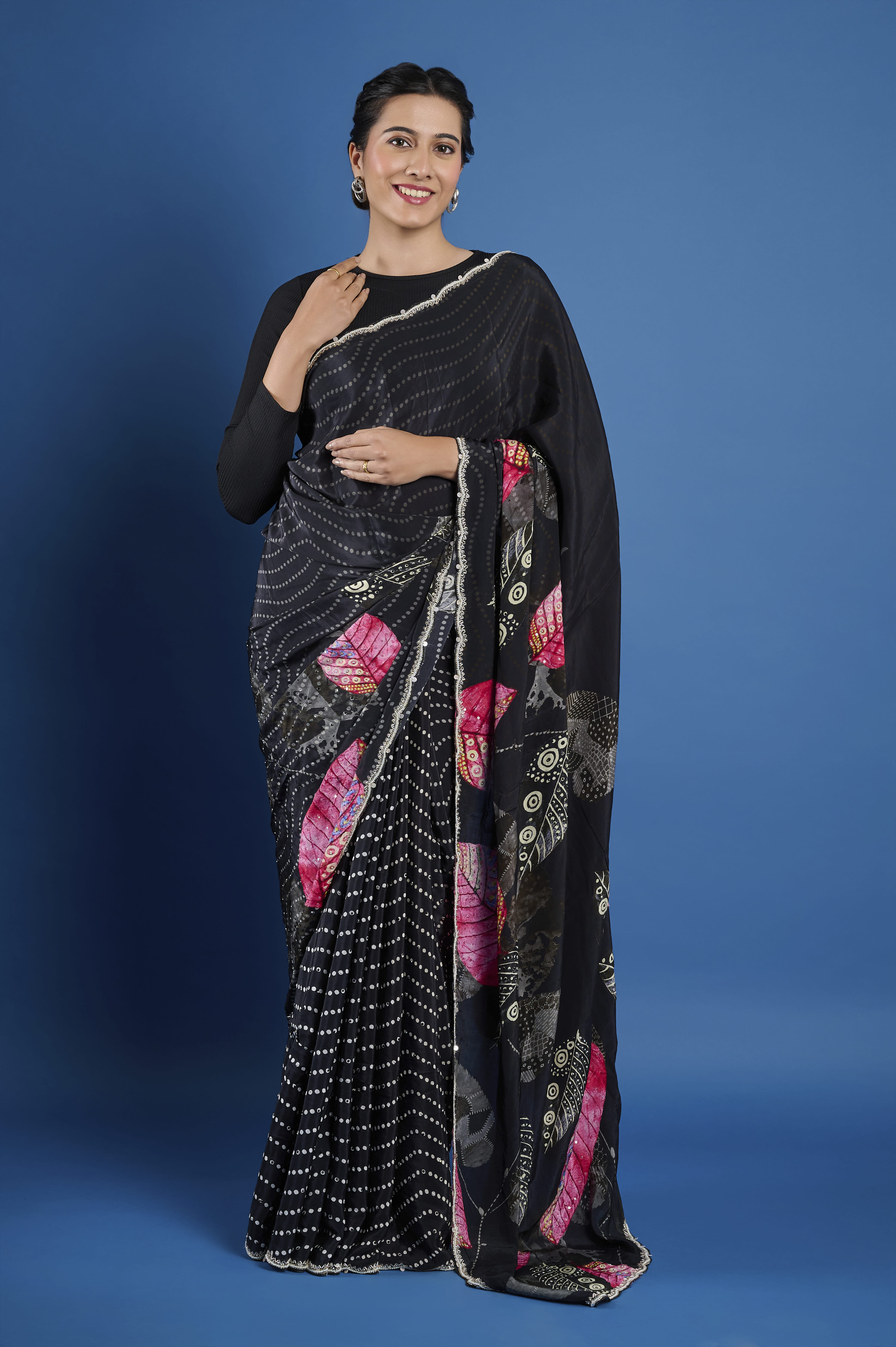 This striking black crepe saree features all-over bandhani-inspired dotted prints and is accented with colorful applique leaf motifs that add artisanal flair to the pallu and pleats. The soft, lightweight crepe fabric provides a fluid drape, while delicate hand-finished touches elevate the border with subtle beaded accents. Timeless and contemporary, this saree is perfect for festive occasions, day-to-evening wear, or bold celebrations. An unstitched matching blouse piece is included for easy customization.