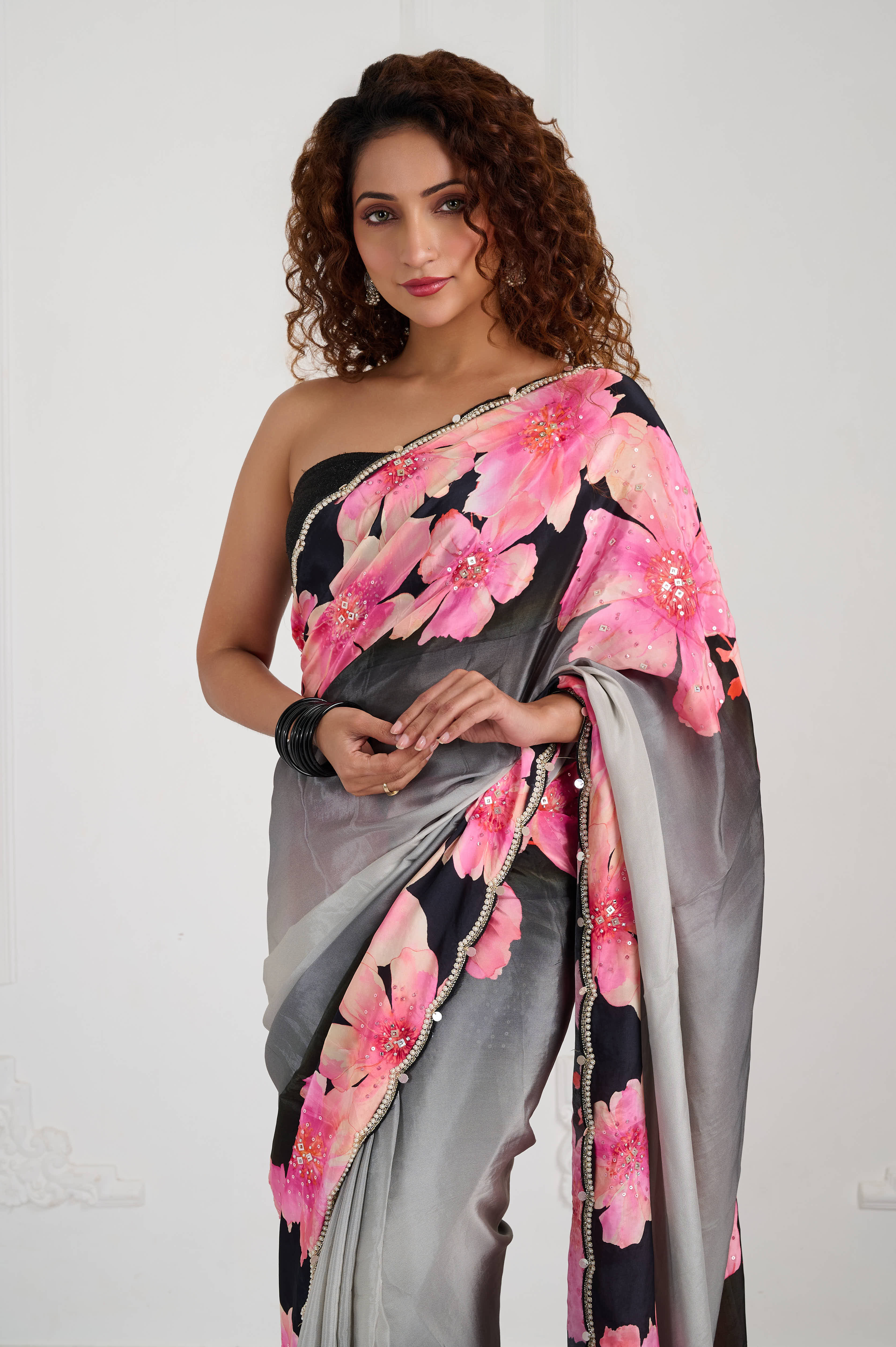 A statement crepe saree with a dramatic grey-black ombre base and oversized pink floral placements. Finished with a flowing pearl-scallop border and hand highlights (sequins/stone clusters) across the petals. Soft, fluid fall that pleats crisply. Ideal for cocktail evenings and modern festive wear.