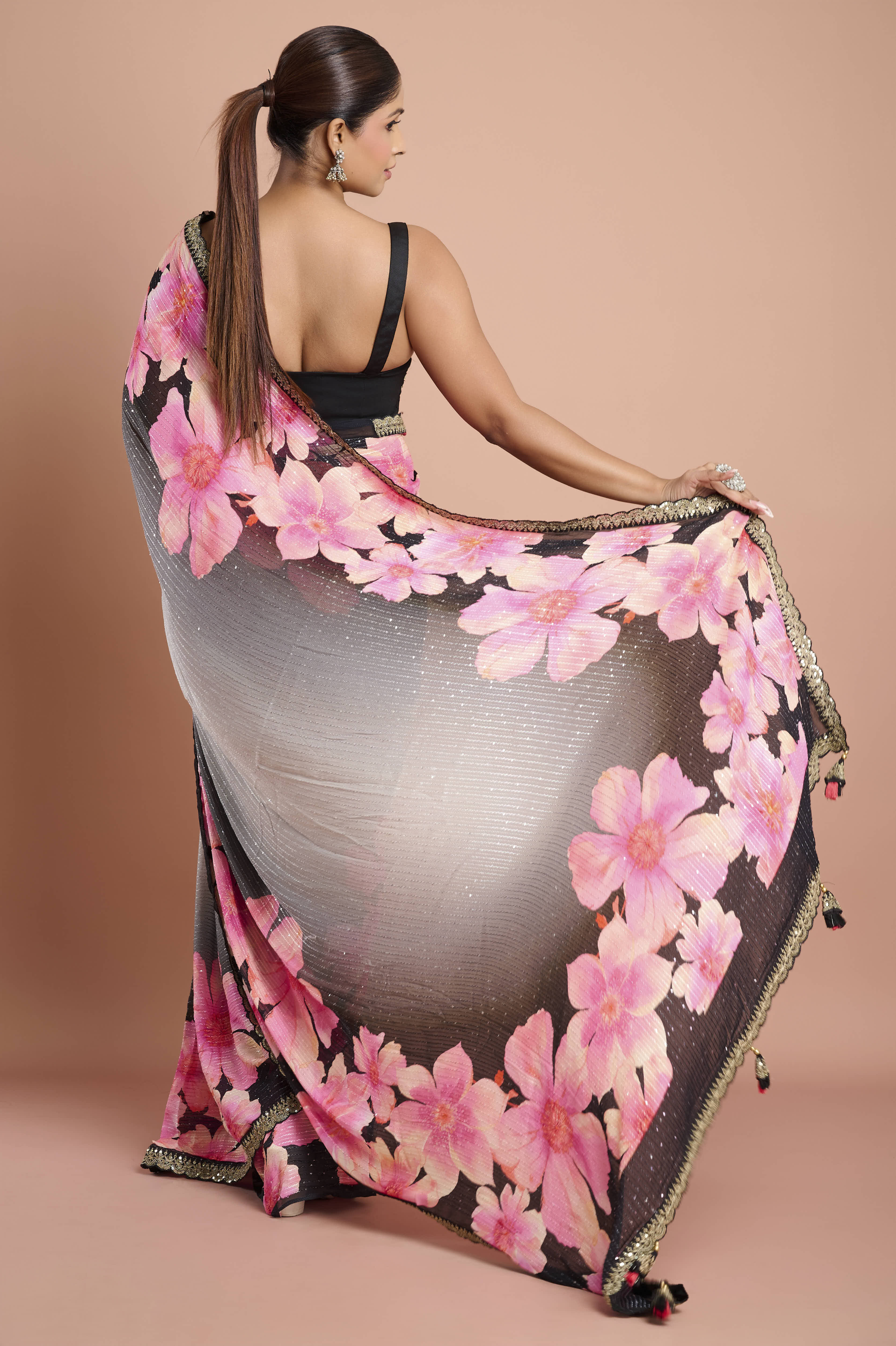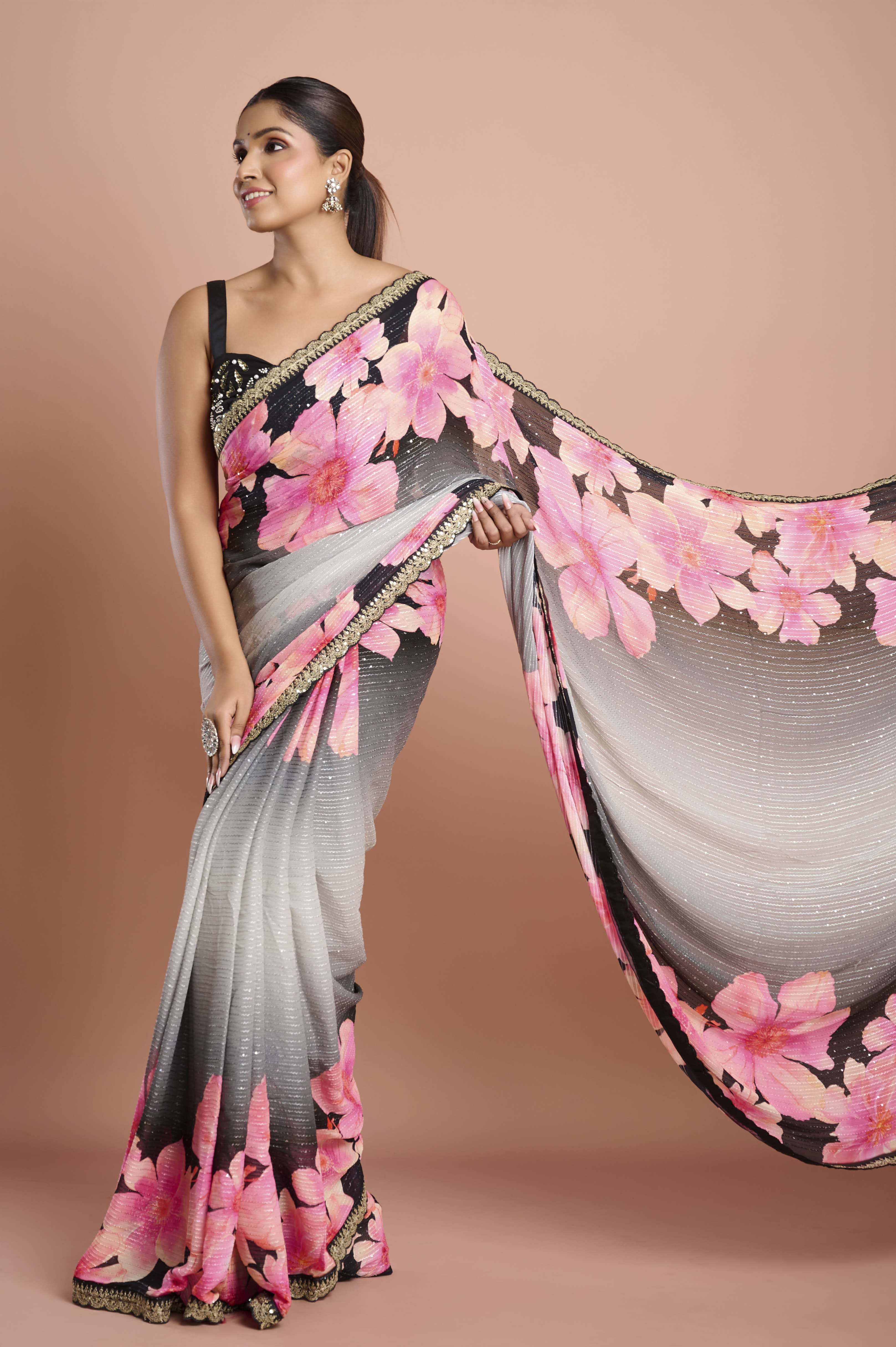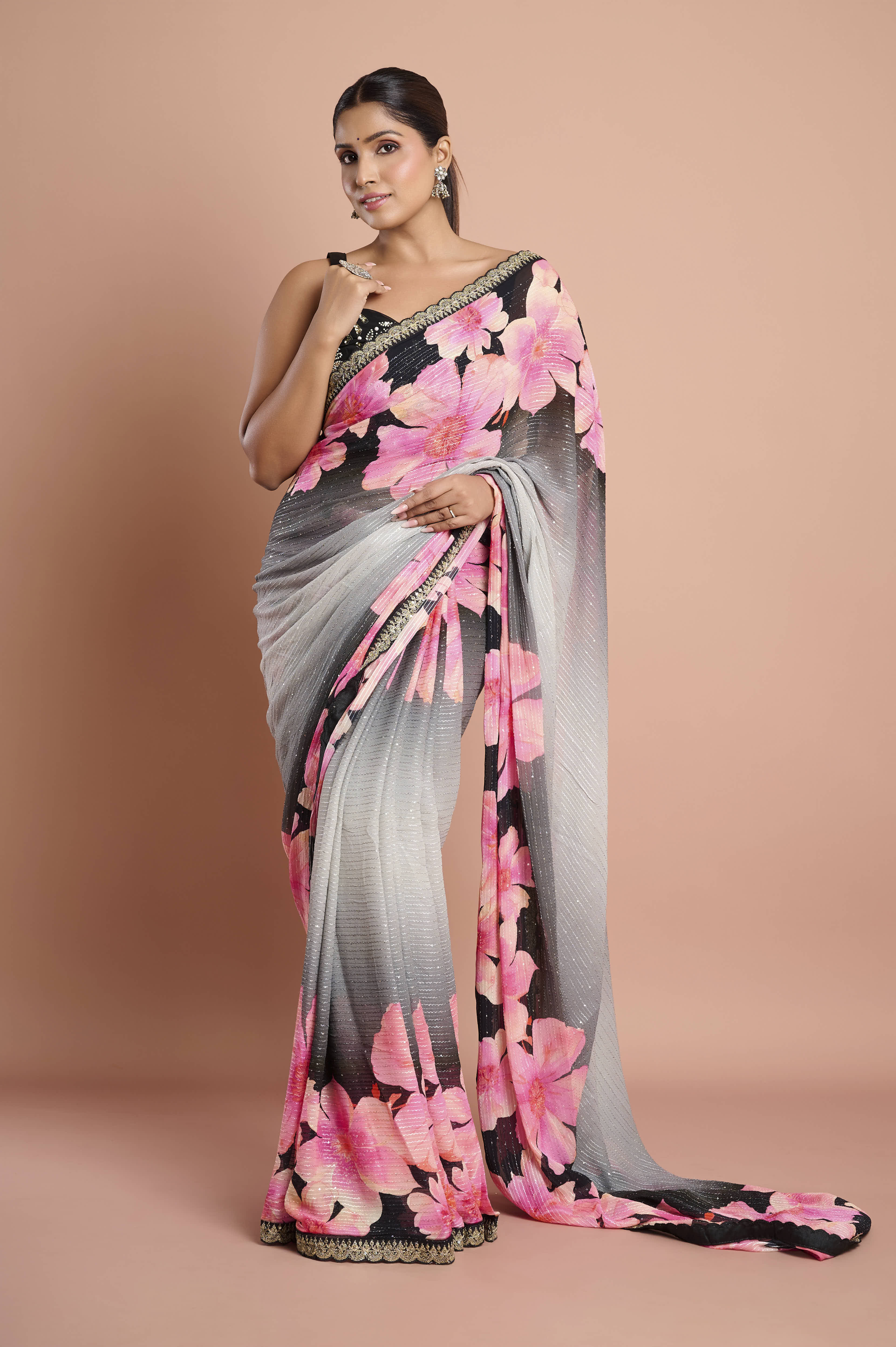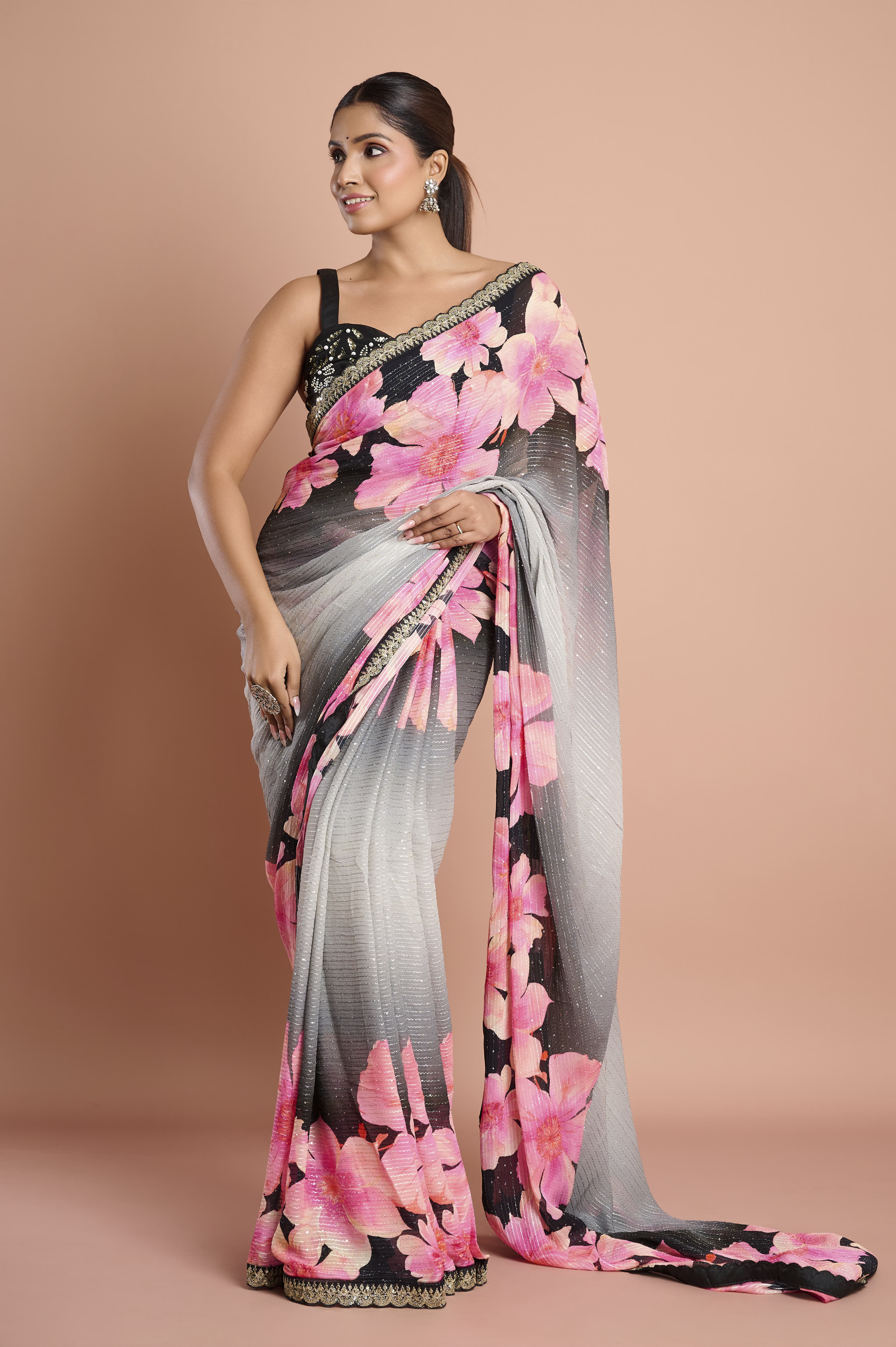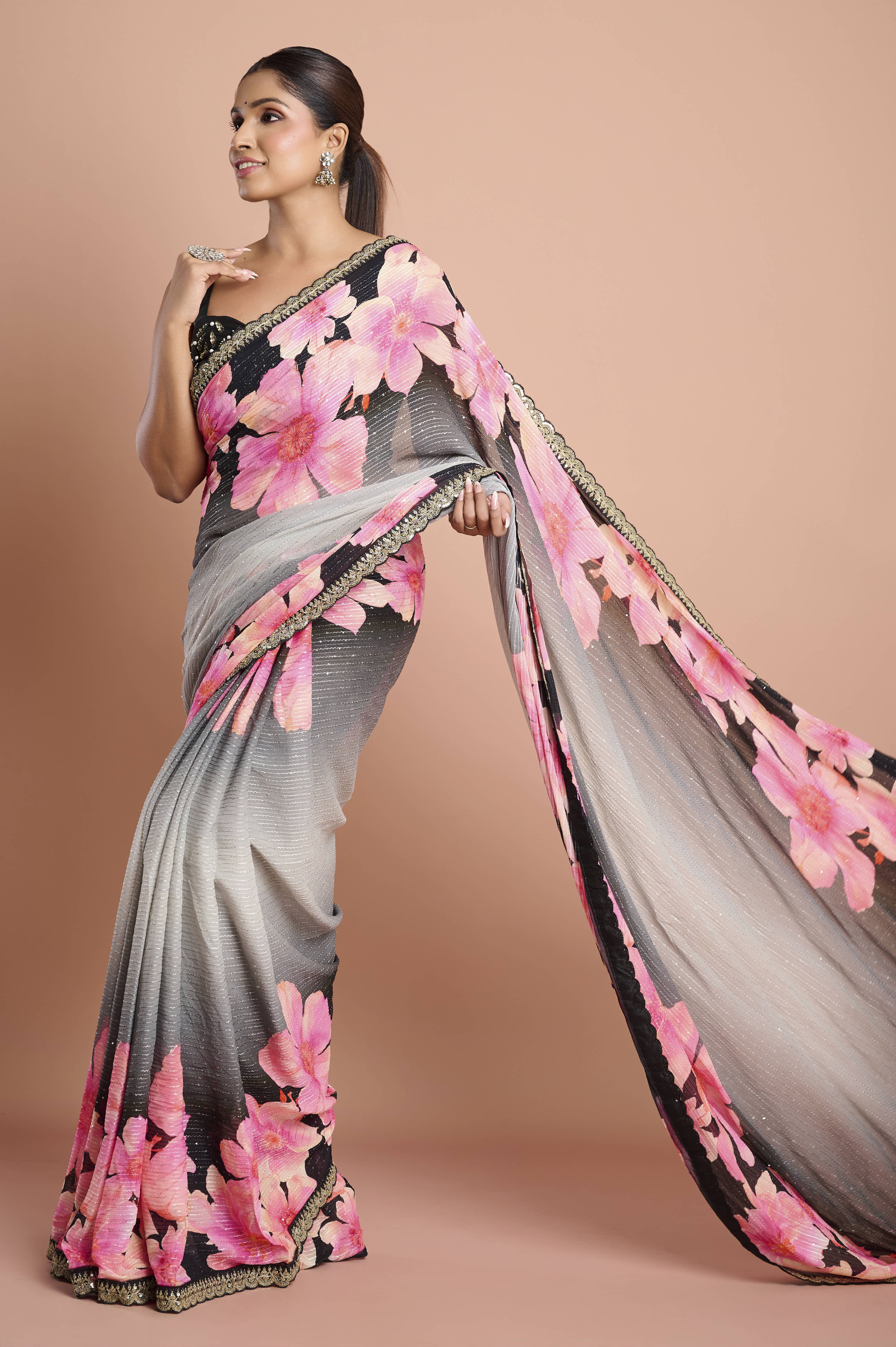A flowy Chinon saree with a soft ombre grey-to-black base and oversized pink blossom prints. The fabric features delicate lurex-style shimmer lines and a refined scallop lace border with bead/sequin accents. Lightweight, airy and elegantÑideal for evening cocktails, receptions and festive dinners.