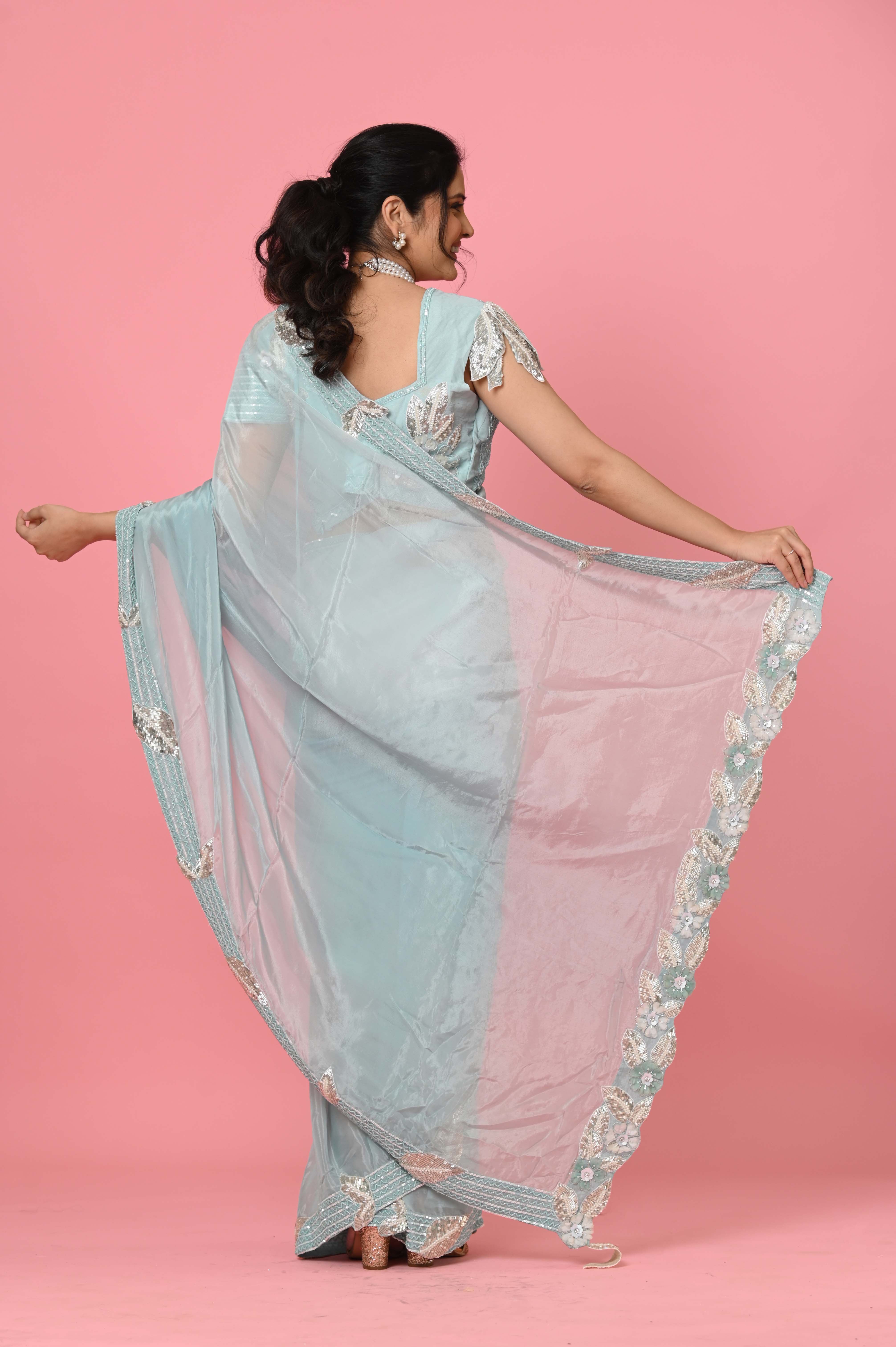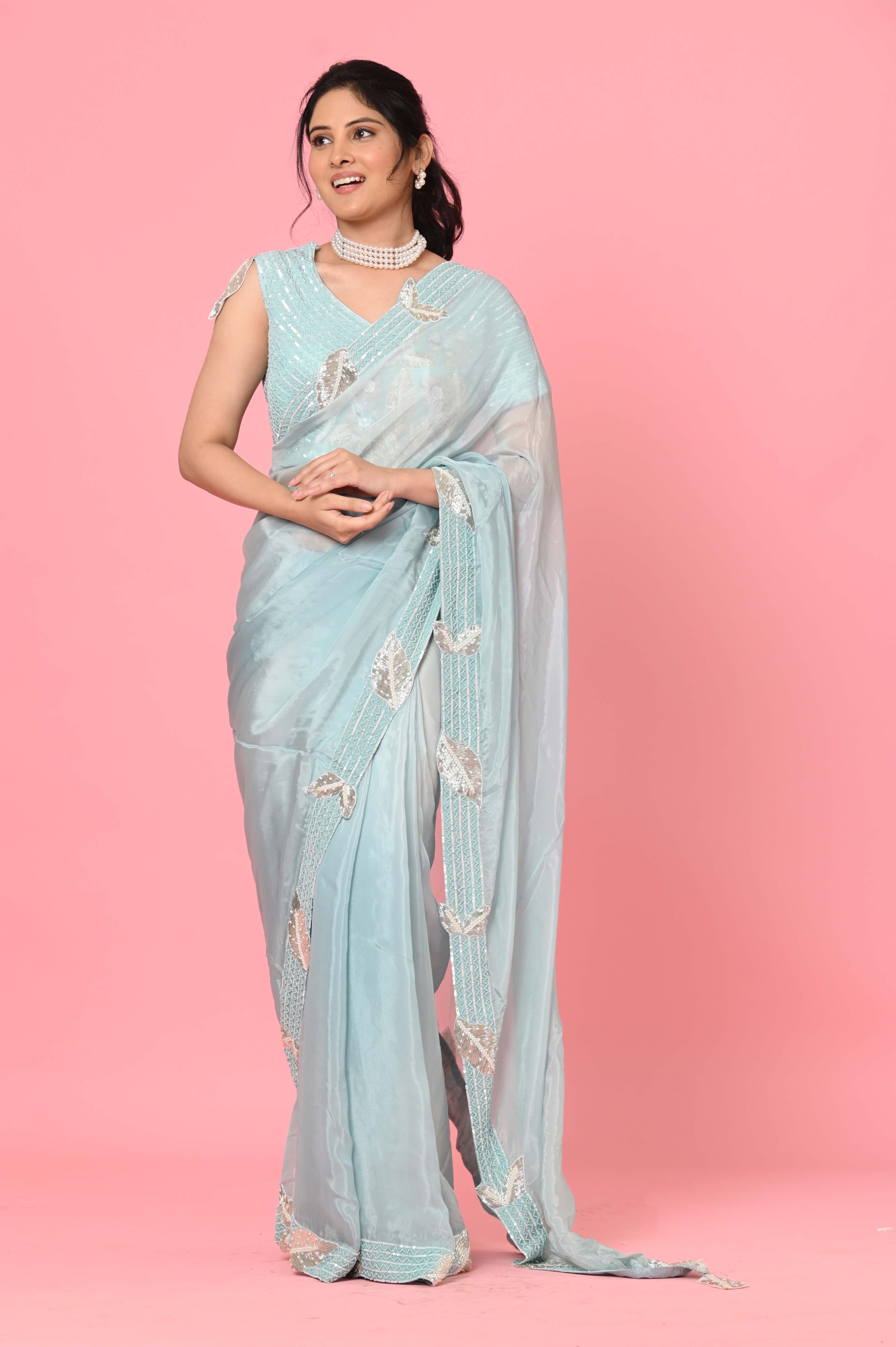 An organza saree with beadwork is a beautiful and elegant choice for those who appreciate delicate embellishments and the sheer, ethereal quality of organza fabric. Beadwork adds texture, sparkle, and intricate designs to the saree, making it a luxurious and stylish option for special occasions