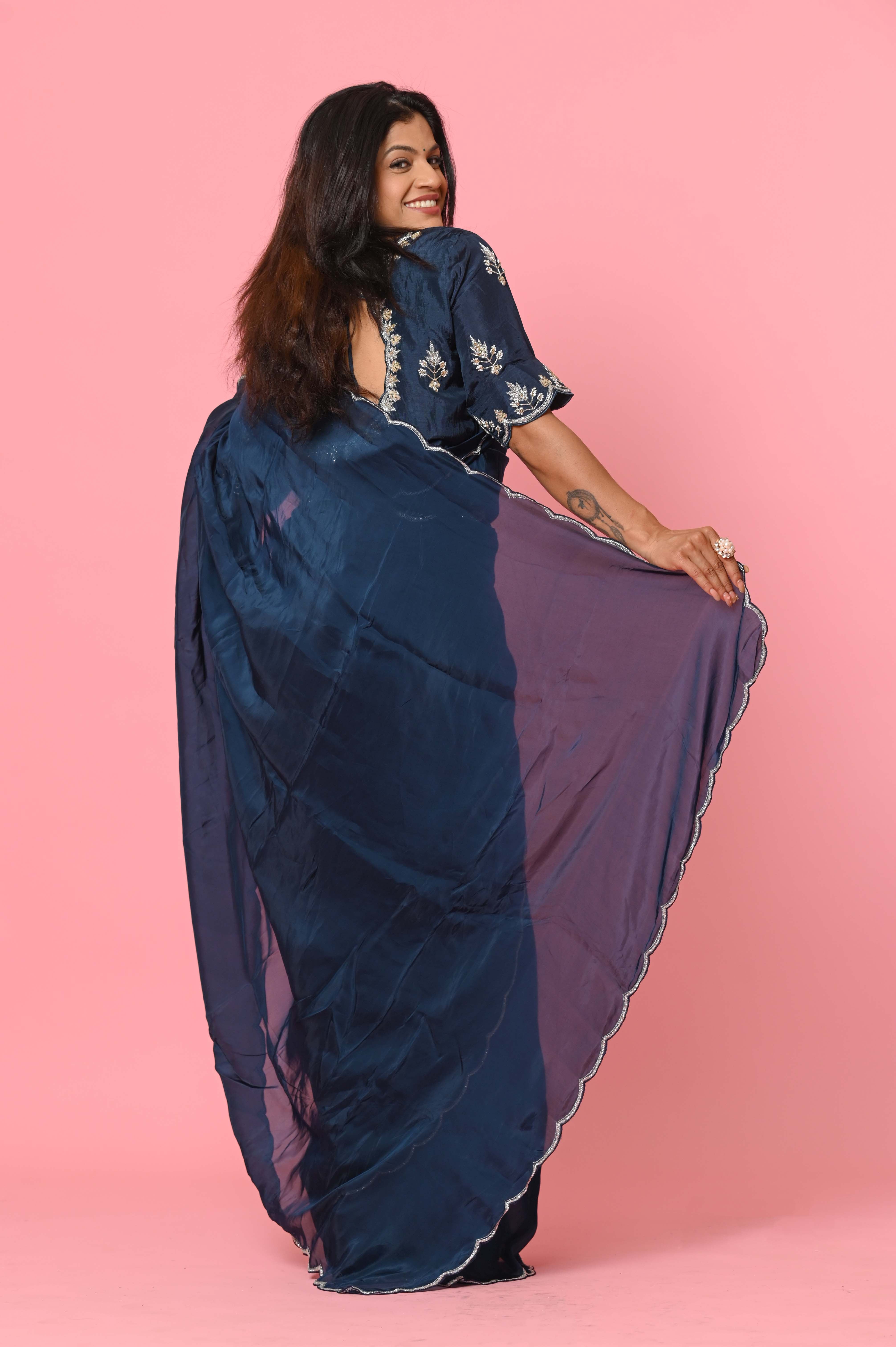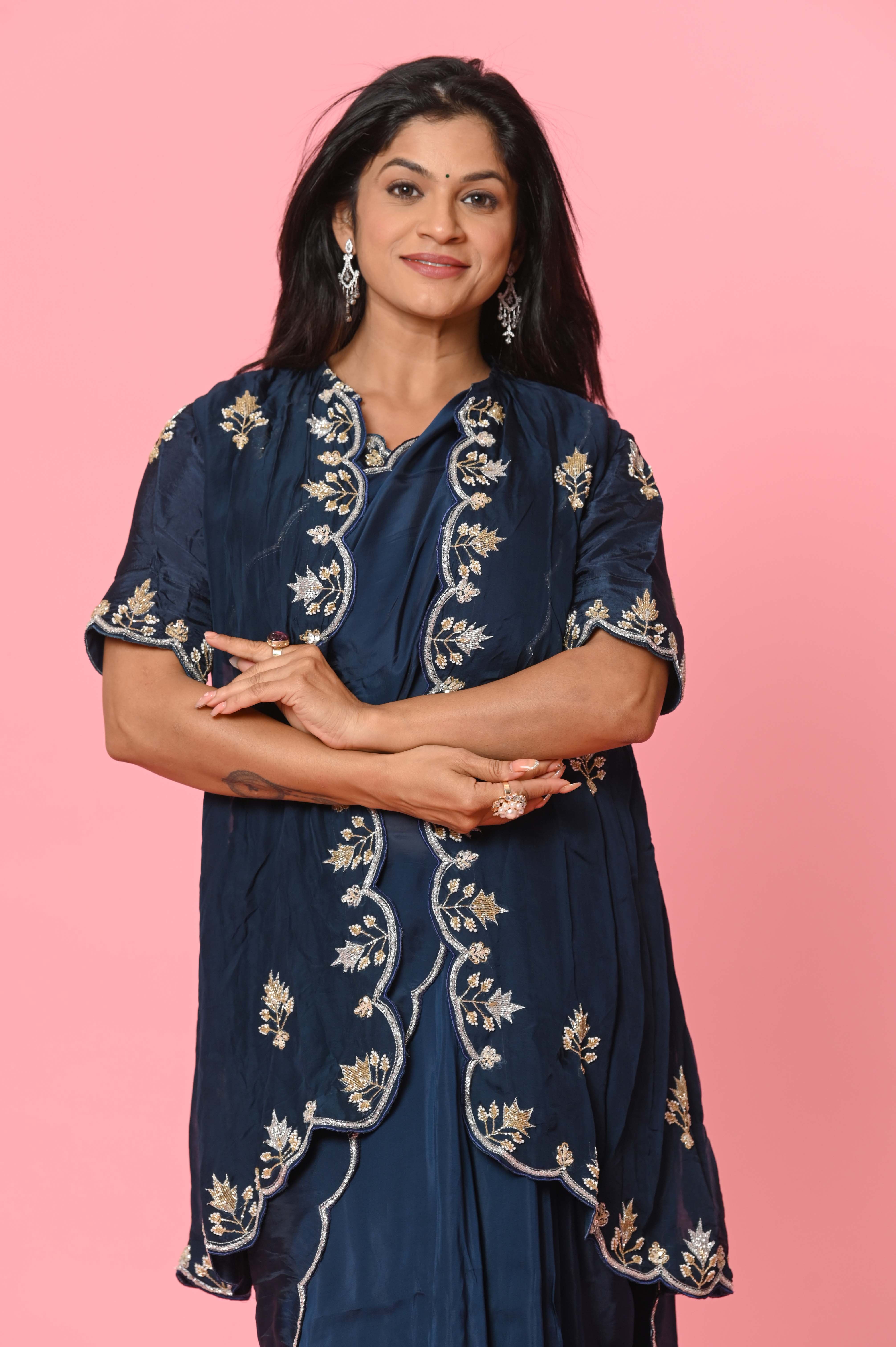 A crepe designer saree with a jacket is a stylish and contemporary ensemble that combines the elegance of a crepe saree with the fashion-forward addition of a designer jacket. This fusion of traditional and modern elements creates a unique and sophisticated look