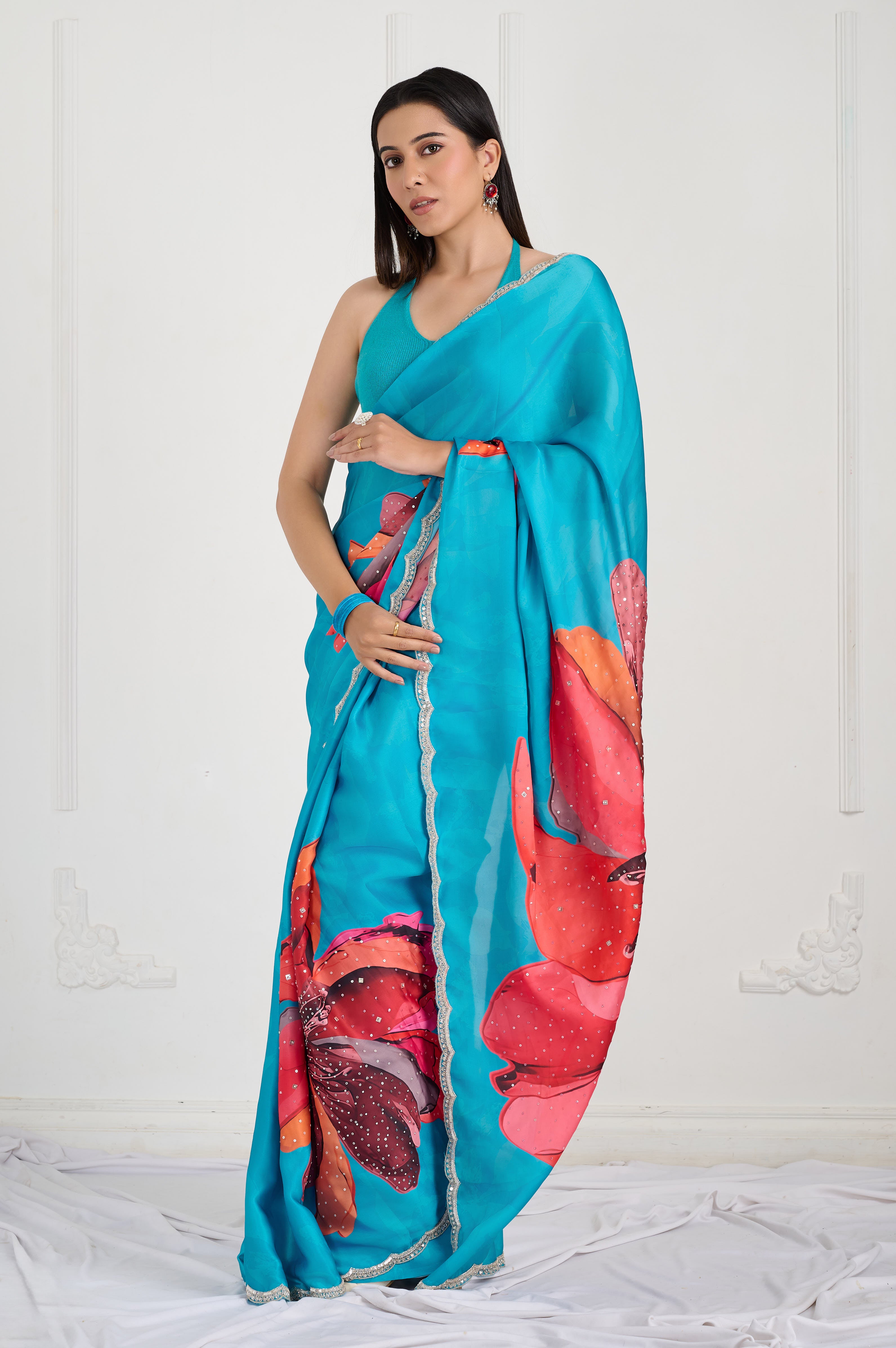 A vibrant satin crepe saree in luminous turquoise with oversized coral-pink petal placements and a subtle tonal shadow. Finished with a silver-champagne scallop lace edged in cut-dana/sequin work and fine dotted highlights on the blooms. Smooth sheen, fluid fall and crisp pleatsÑperfect for sangeet nights, receptions and cocktail evenings.