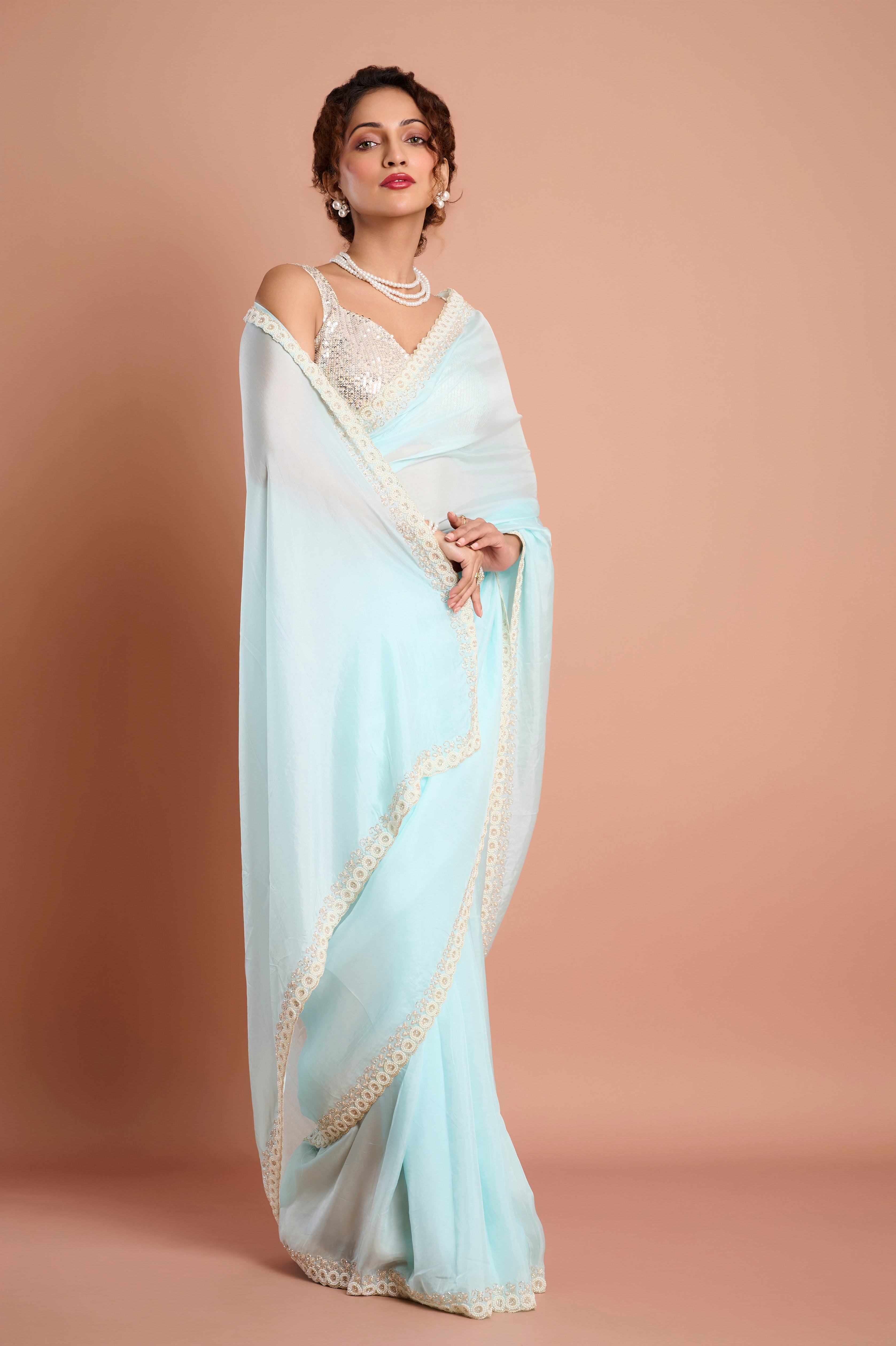 This saree is made from powder blue HO silk, featuring a soft, lustrous drape and a cool, elegant sheen. The border is beautifully accented with intricate moti (pearl) work and delicate embroidery, creating a graceful and sophisticated finish. The minimal, monochrome palette makes it ideal for daytime occasions, summer festivities, or intimate celebrations, with the lightweight HO silk ensuring easy comfort throughout the day. Each saree is paired with an unstitched blouse piece, allowing for customizable styling.