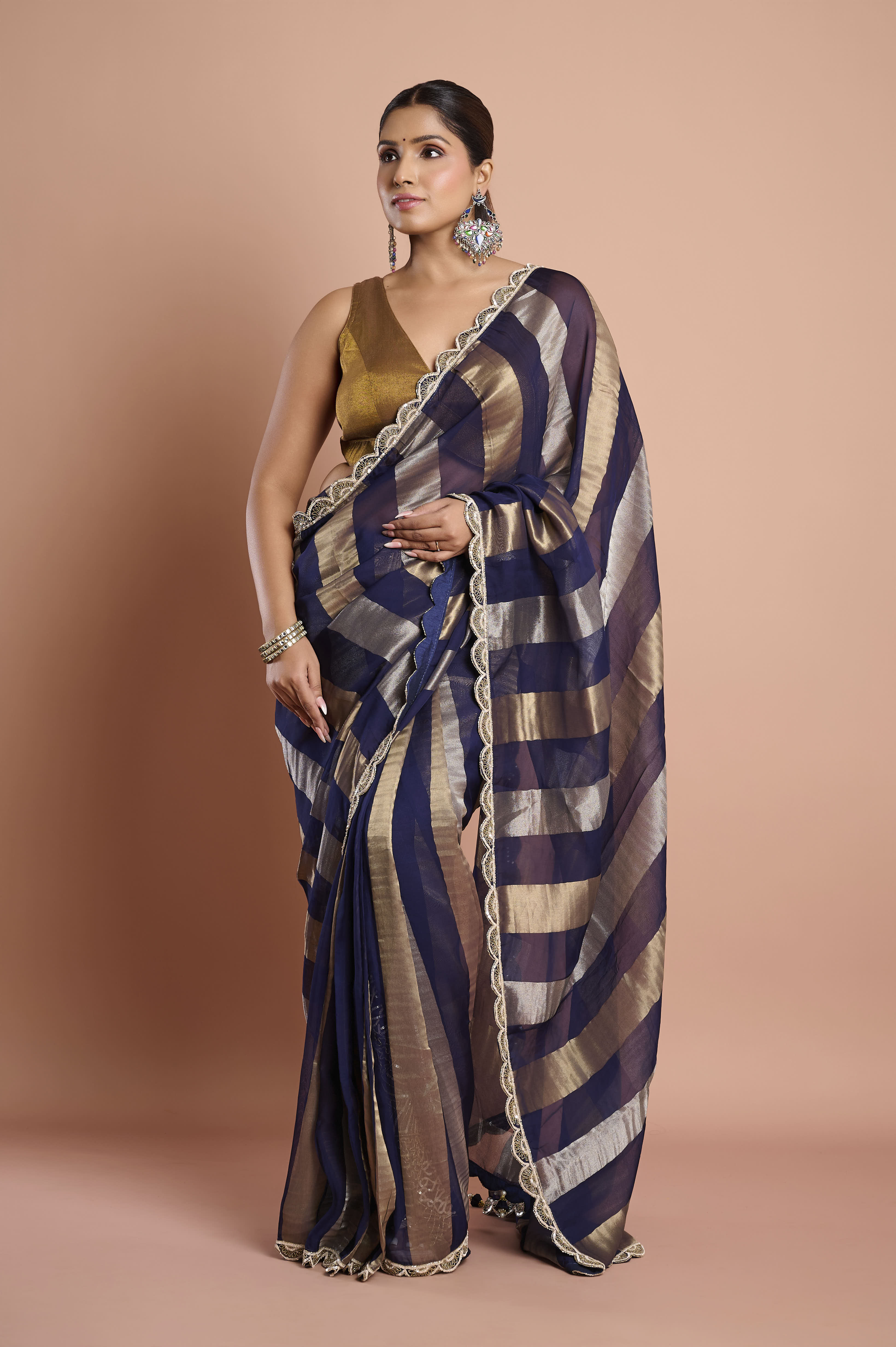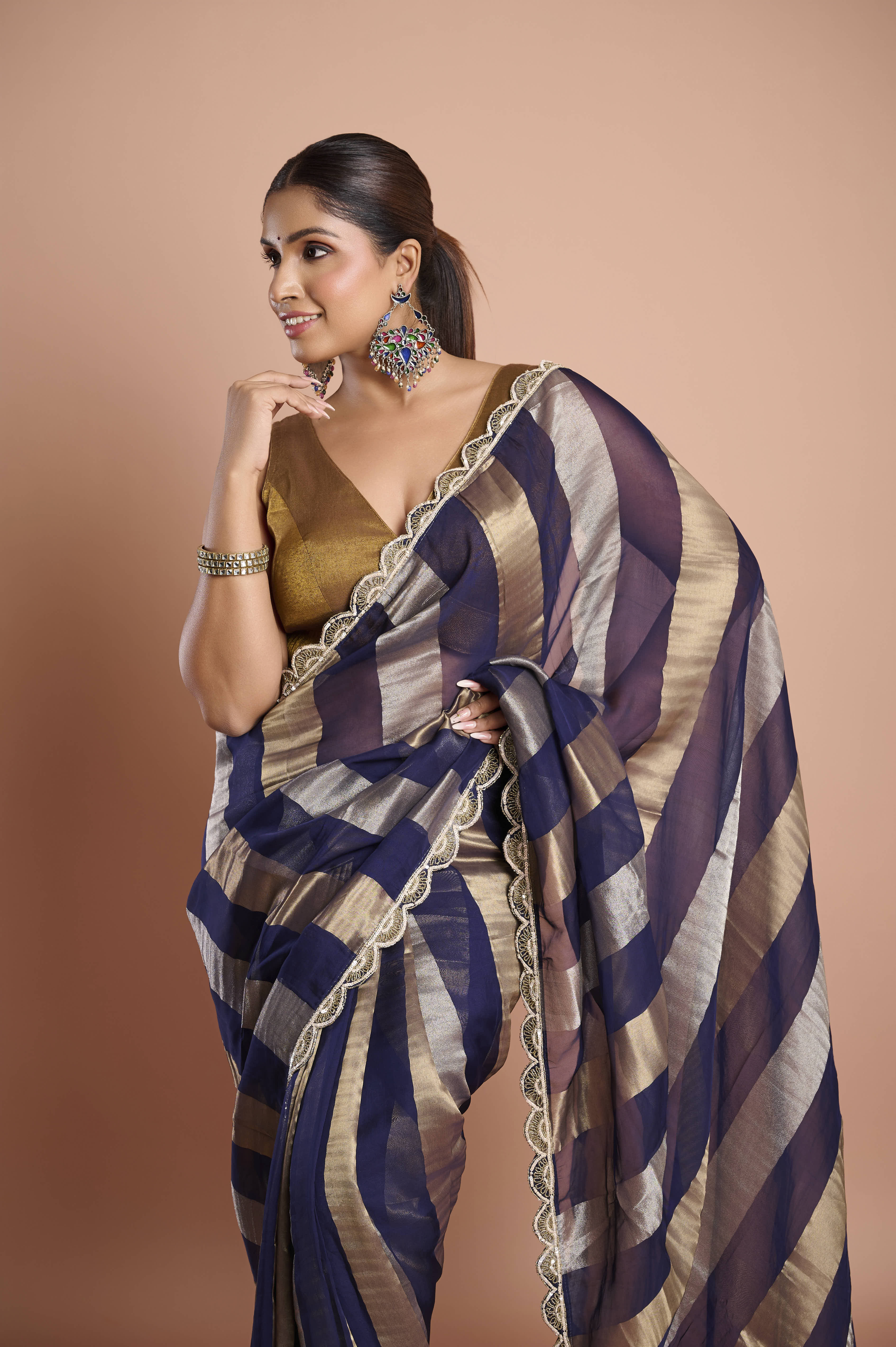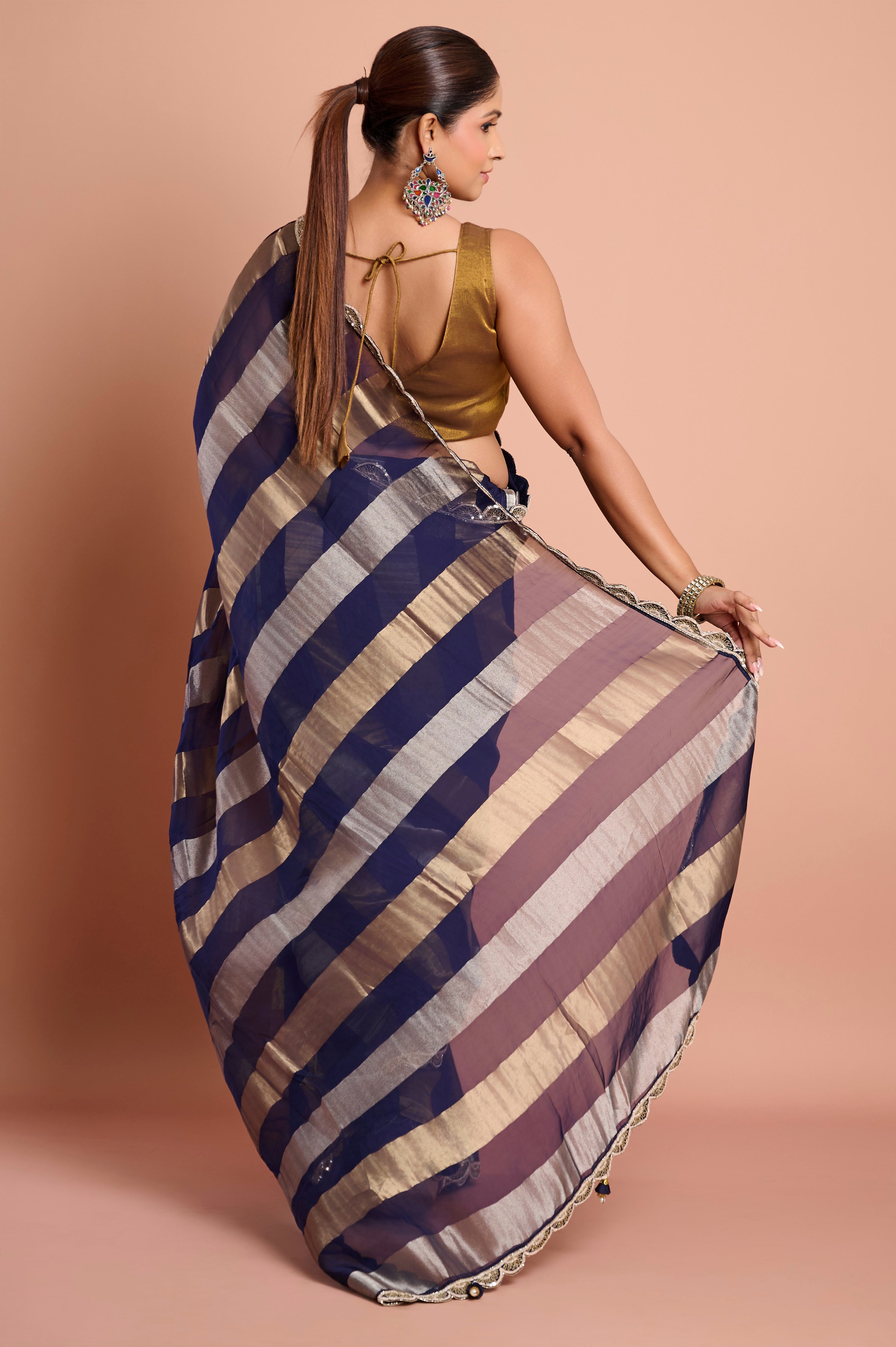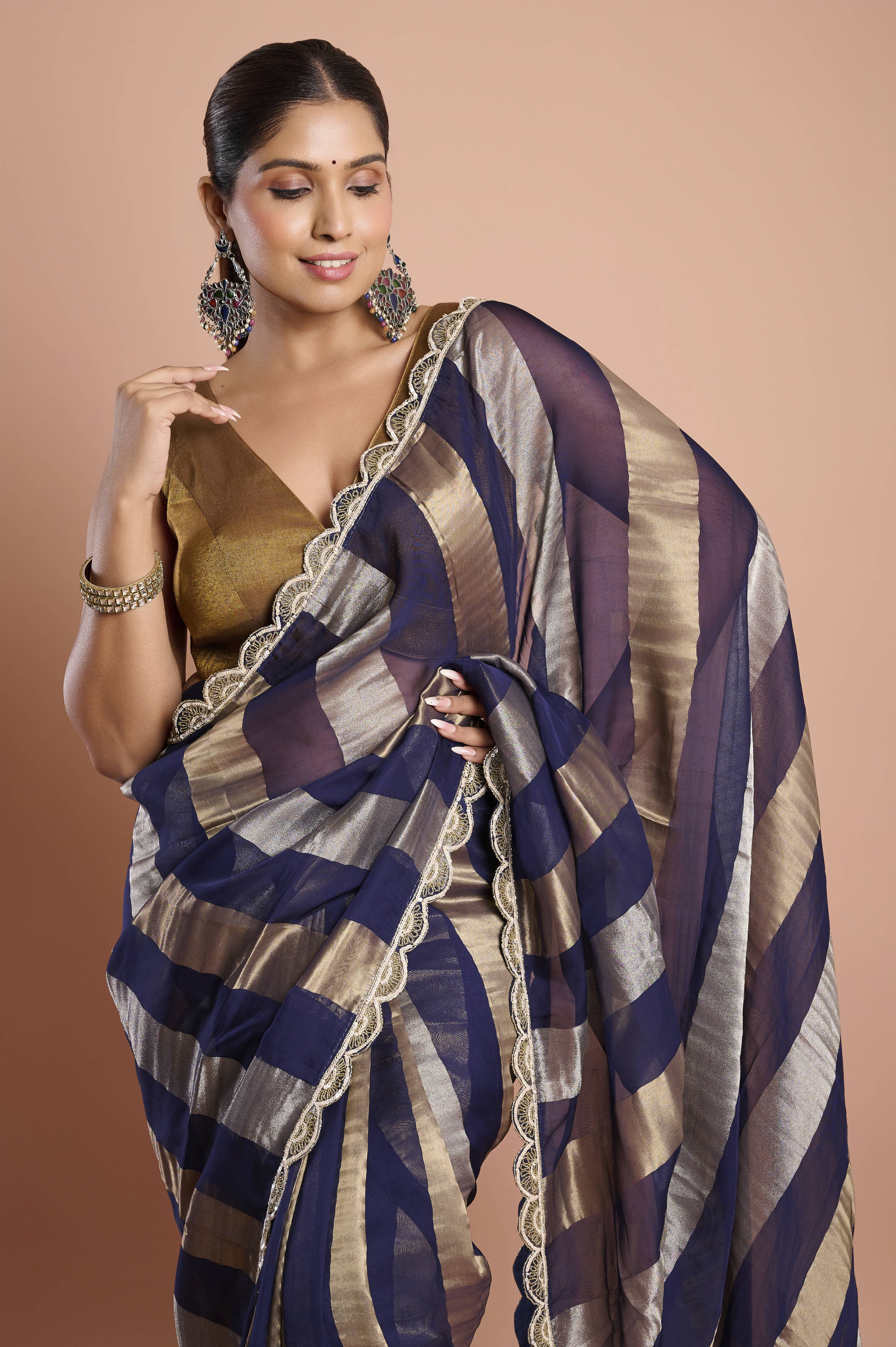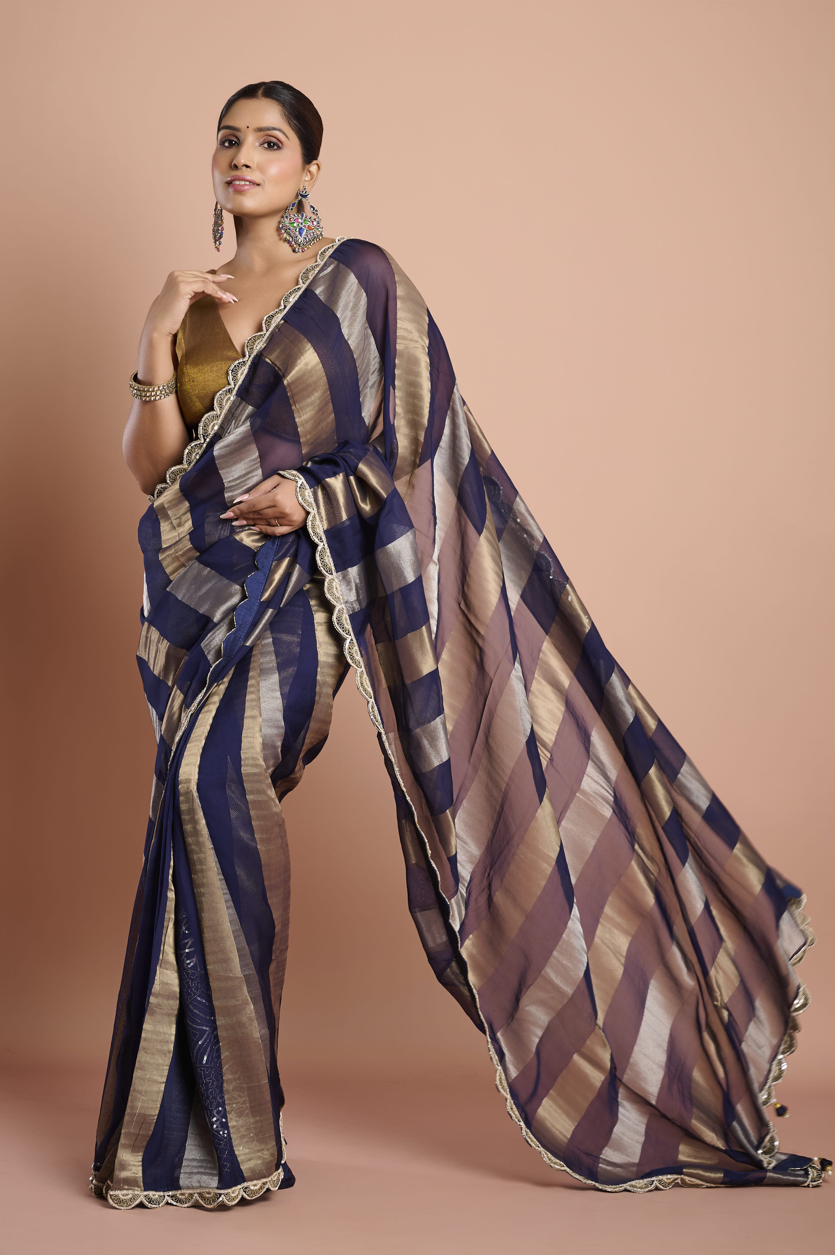 This sophisticated saree features a striking combination of deep navy blue and metallic gold stripes in a contemporary pattern on premium organza fabric. The saree showcases bold horizontal stripes with varying widths that create a modern geometric appeal, enhanced by the lustrous sheen of the organza material. It is beautifully finished with an intricate golden scalloped lace border that adds a refined traditional touch to the contemporary design. The lightweight organza fabric provides an elegant structured drape with subtle transparency, making it perfect for evening events, cocktail parties, and formal celebrations.