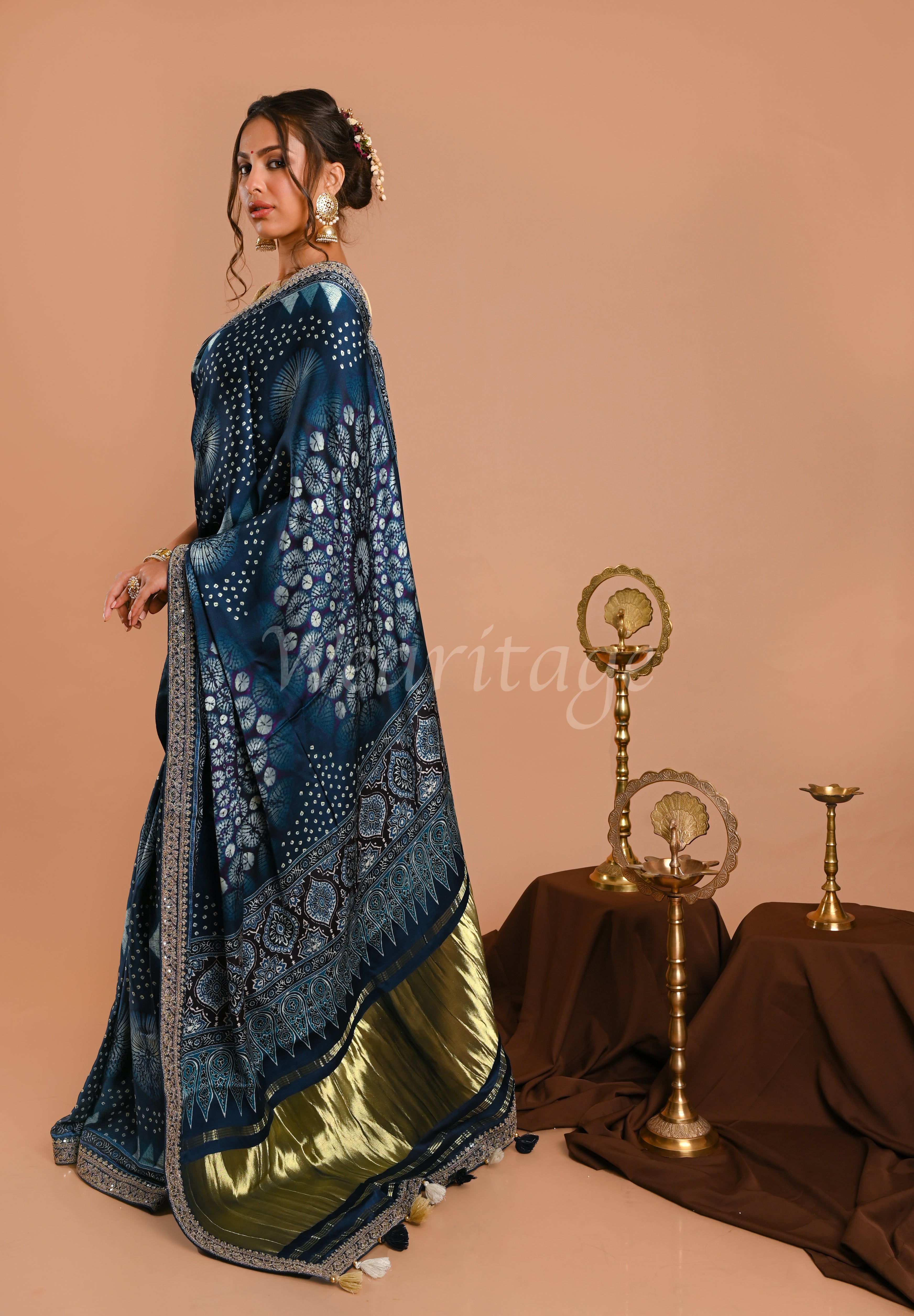This beautiful digital printed patola saree has a regal appeal to it. The patola weave, common to Gujarat, is usually made from silk. It is a double Ikat fabric that combines the techniques of tye-dye and weaving. Many consider Patola as the ultimate of weaving perfection because the displacement of even one thread can result in a deformed pattern. These sarees are handspun with a lot of expertise and care. The special Zari and sequins work on the border are done by Rajasthan artisans.