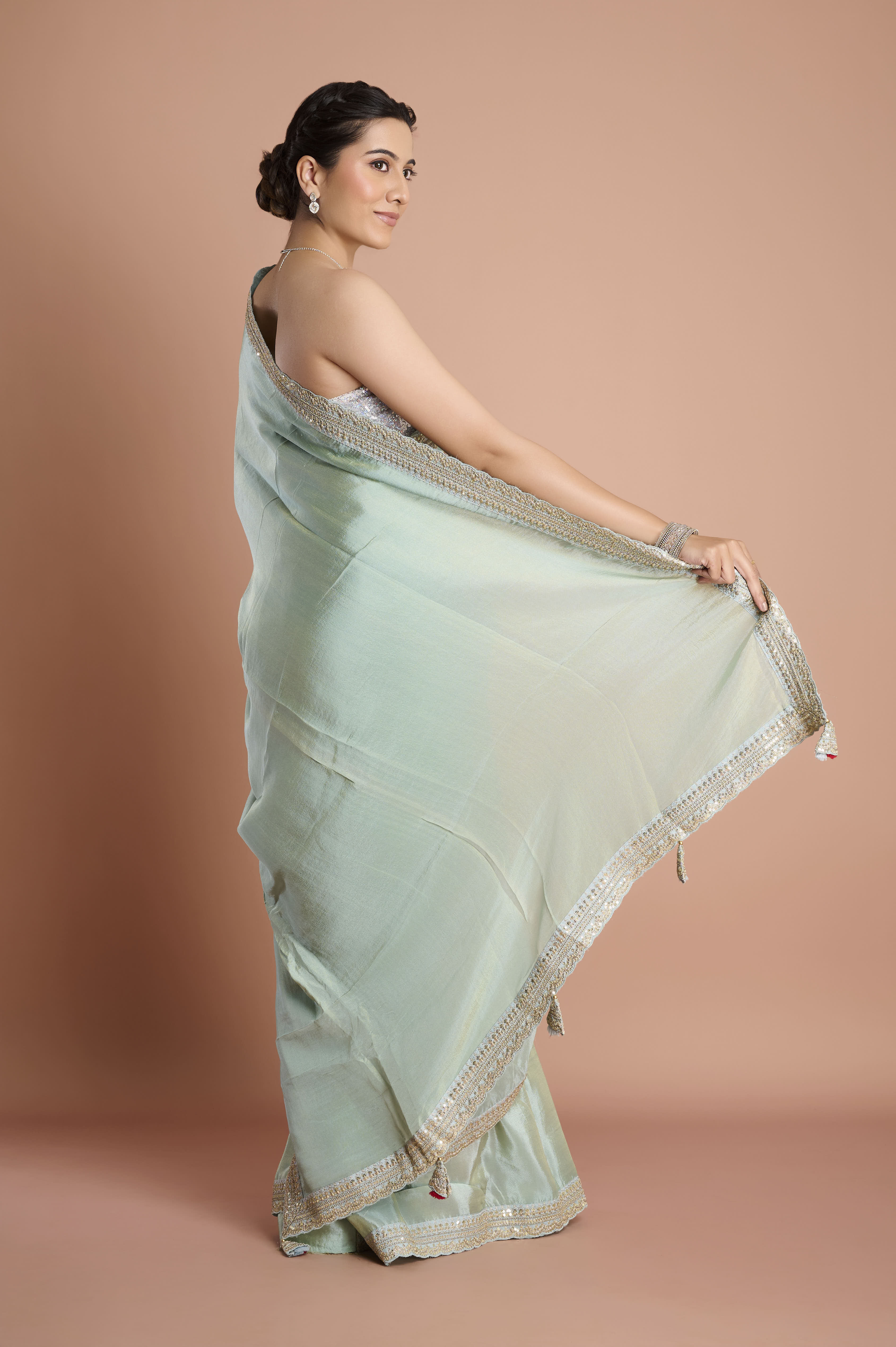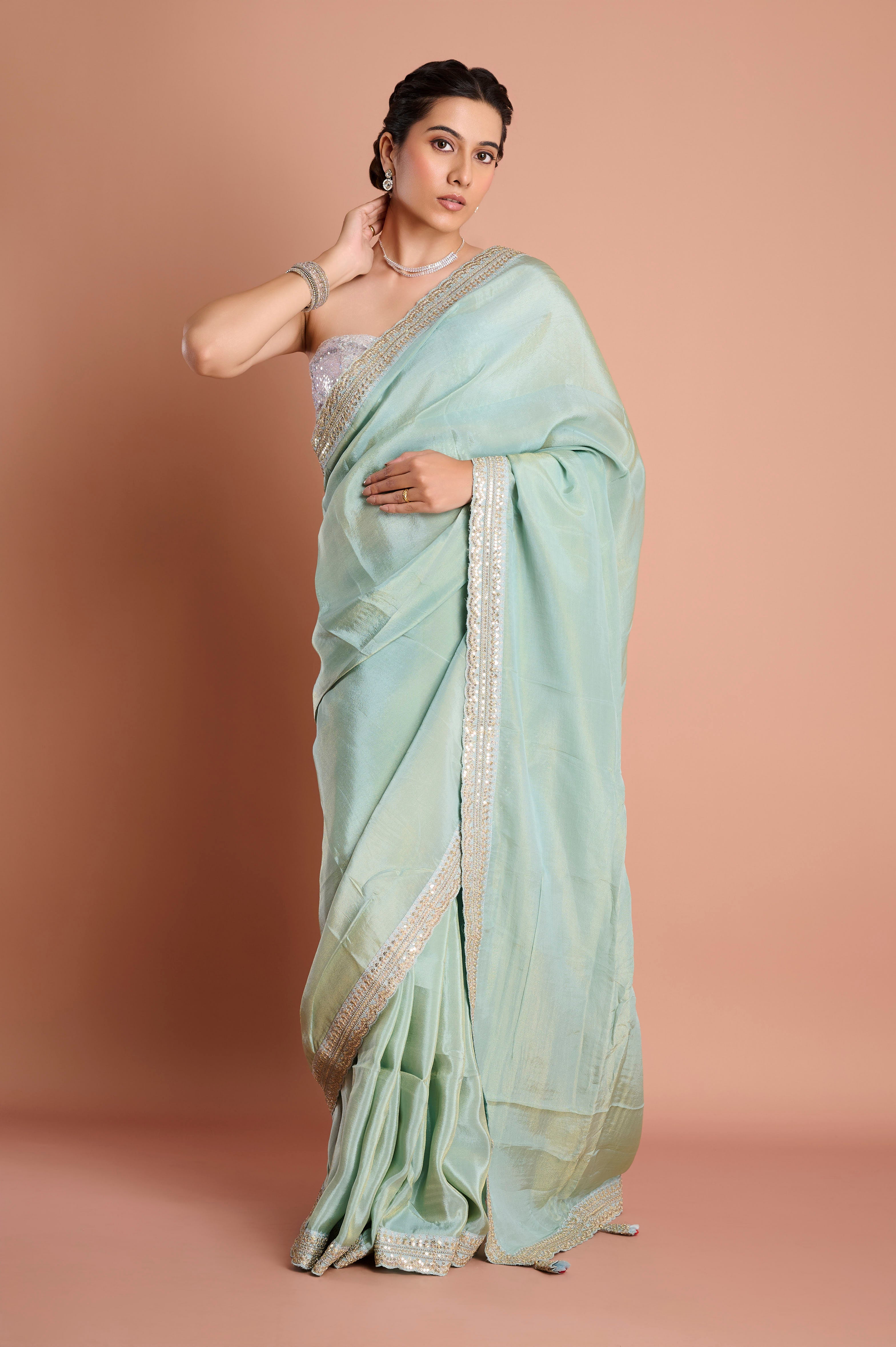 Glide into sophistication with this pastel blue tissue saree, glowing with a luminous sheen and finished with an exquisitely hand-embellished silver border. The featherlight tissue fabric offers effortless drape and elegant structure, perfect for modern soirŽes, receptions, or festive gatherings. Delicate border detailing adds a touch of luxurious sparkle, while the lustrous, airy body gives the saree a subtle, ethereal shine. An unstitched blouse piece is provided for a personalized, contemporary look.