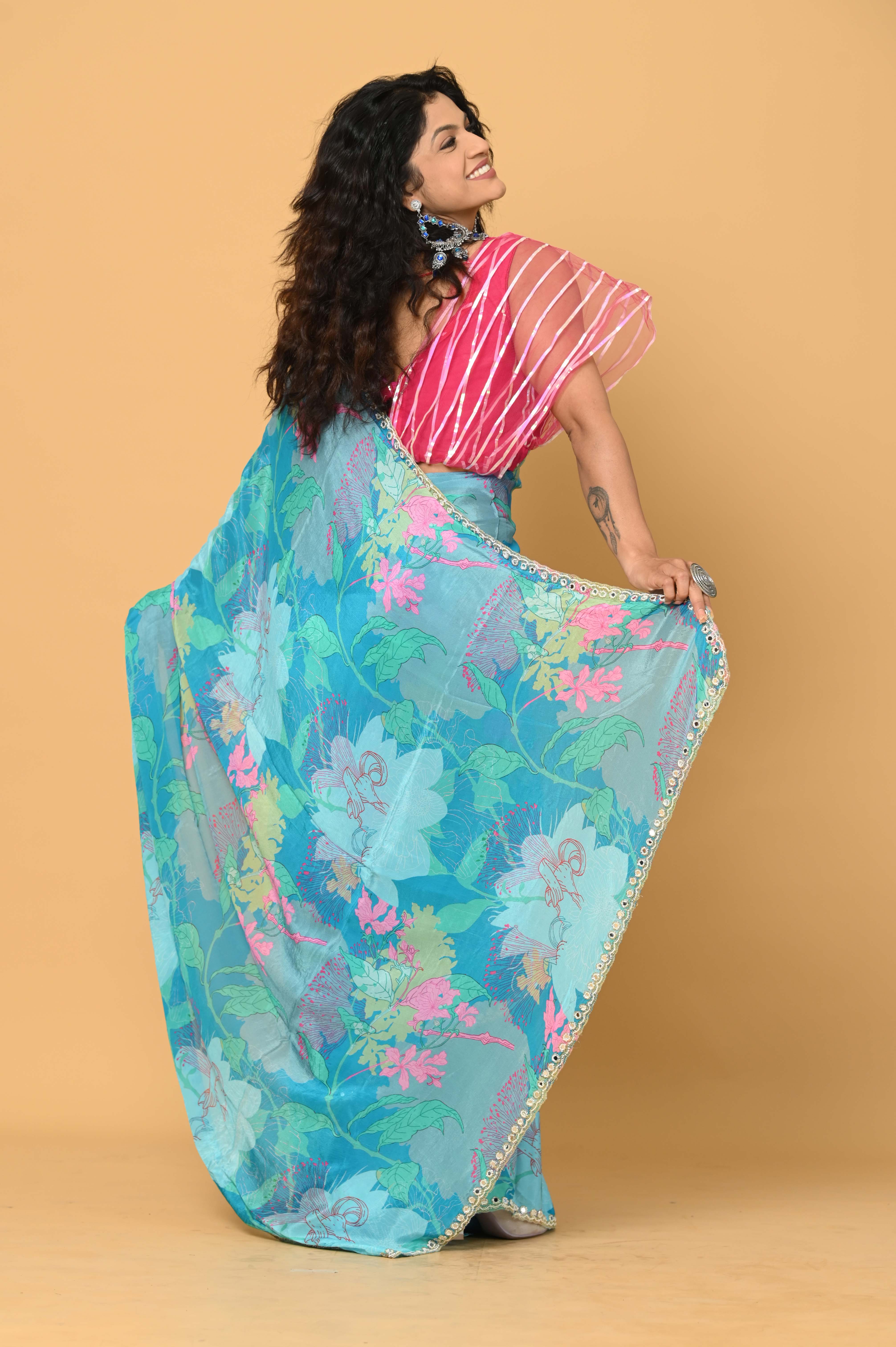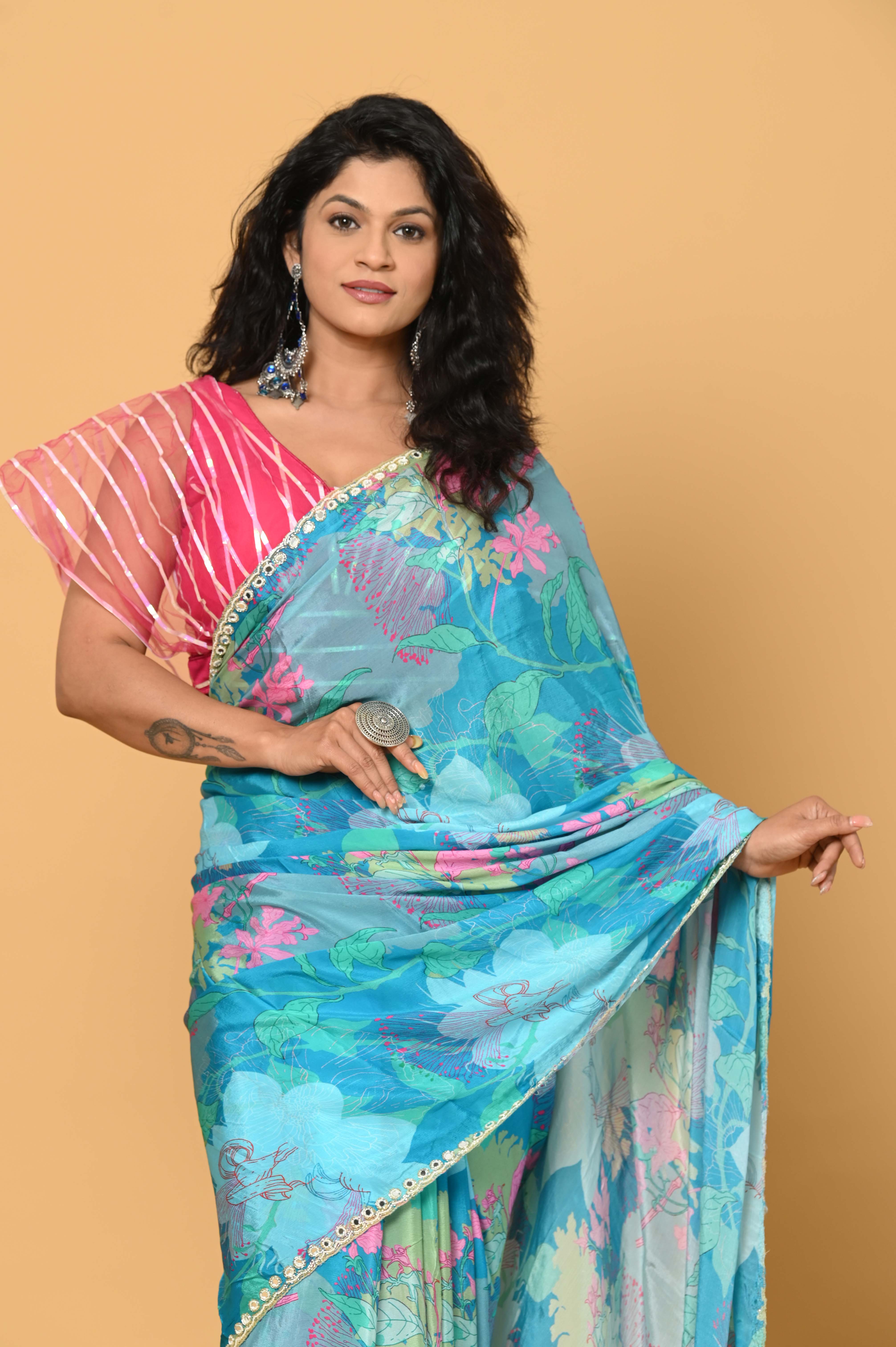 A Chinon printed saree is a stylish and contemporary Indian outfit that features a saree made from Chinon fabric adorned with printed designs. Chinon is a lightweight and flowing fabric with a soft and luxurious texture, making it a comfortable choice for various occasions.