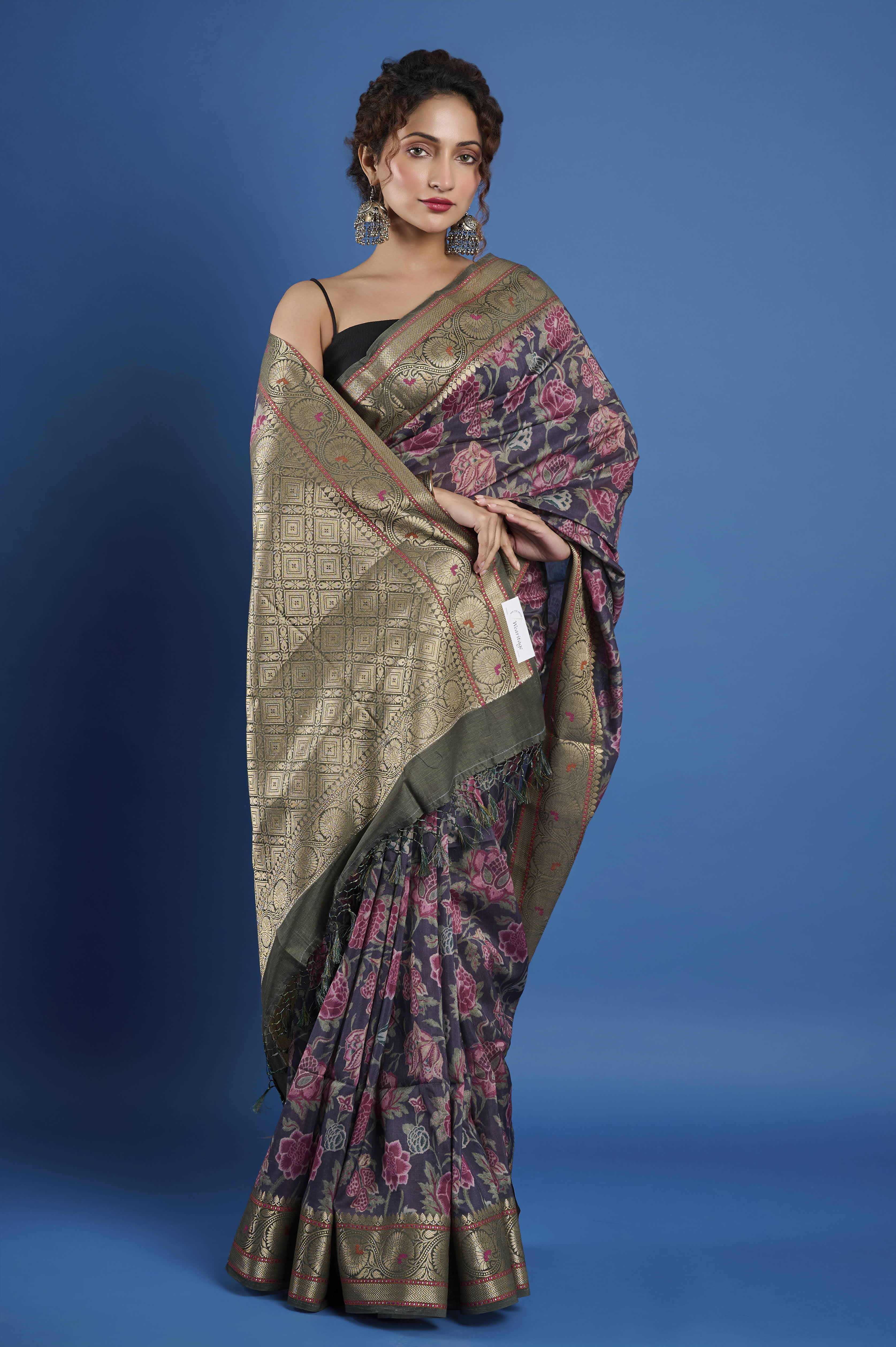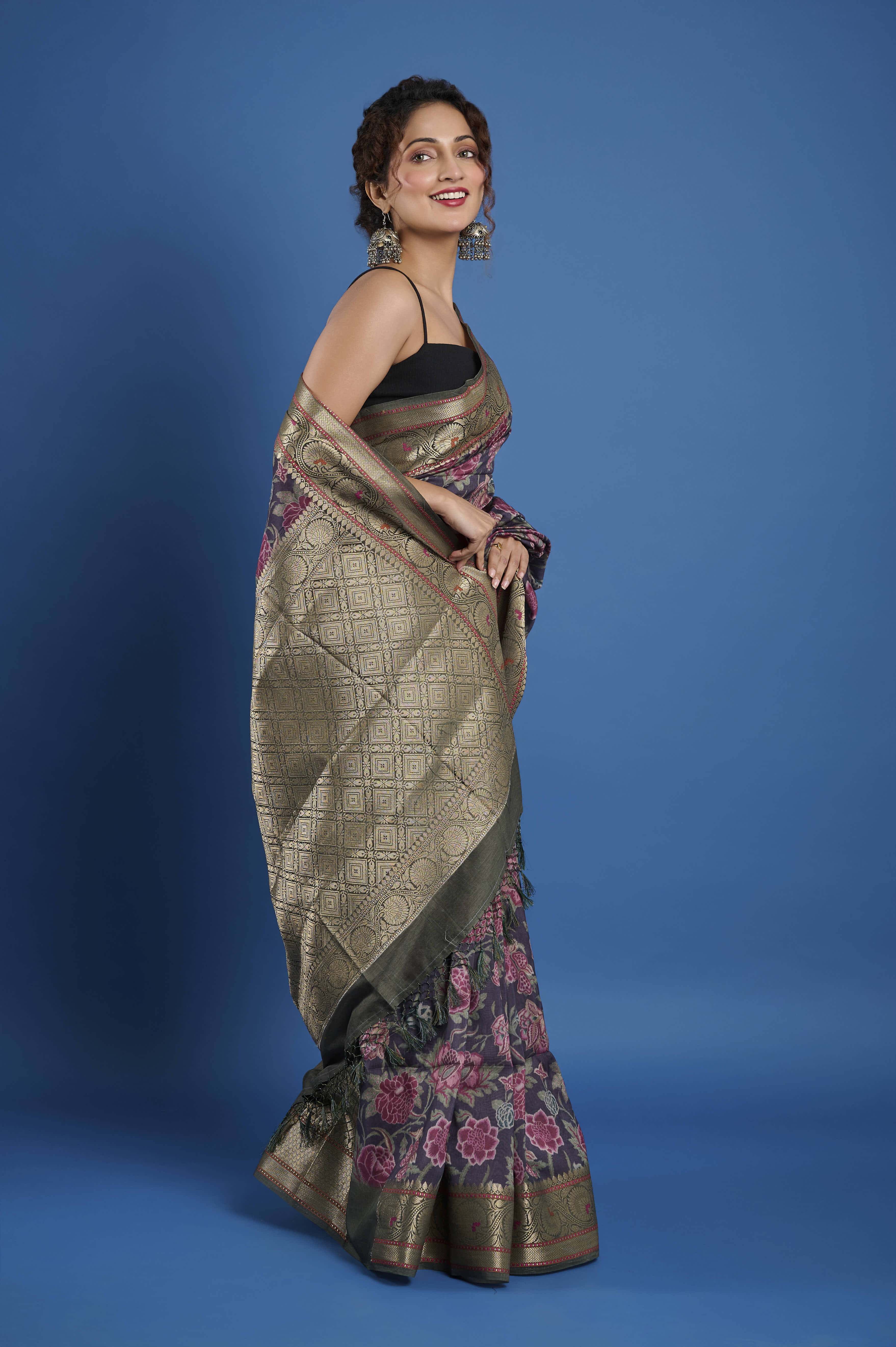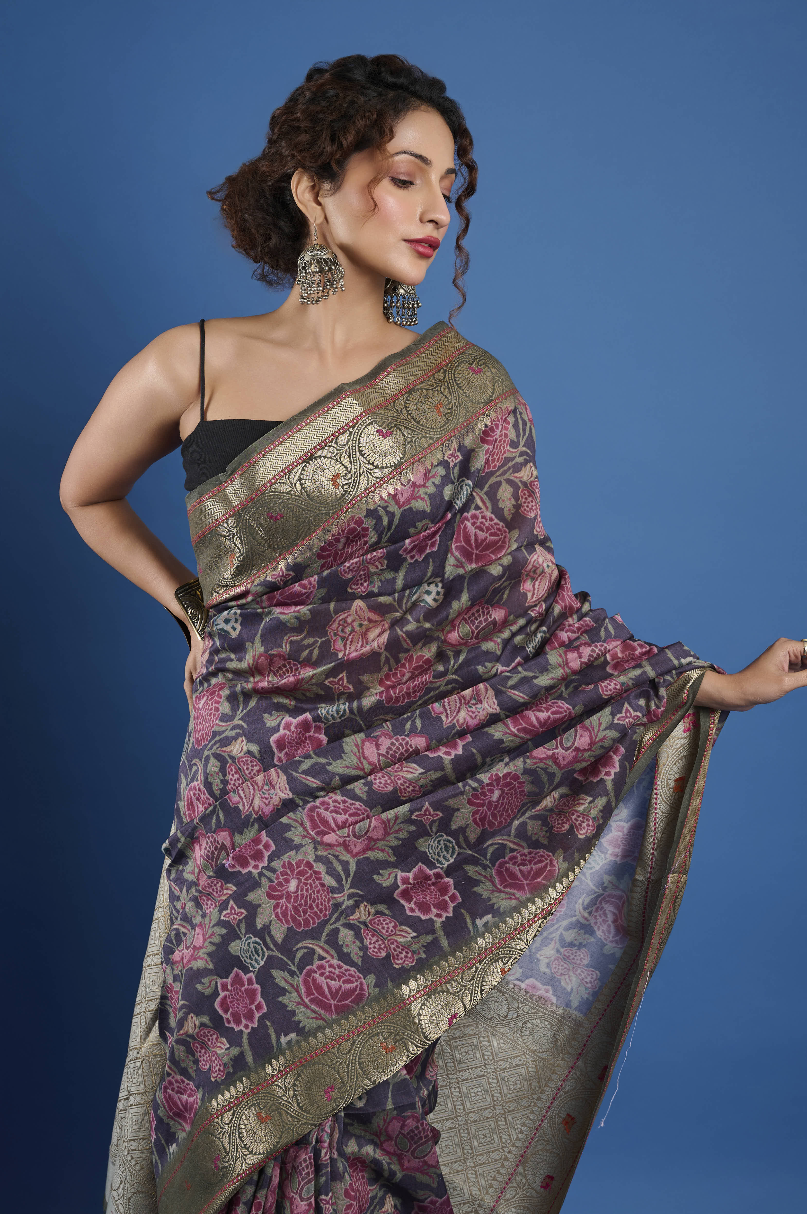 This pure Chanderi saree features a dark base overlaid with intricate digital floral motifs in berry and dusty rose, finished with a luxurious antique gold zari border and pallu. The lightweight, sheer texture of true Chanderi ensures an elegant drape, while the print and opulent border add a refined statement. This saree is perfect for festive gatherings, receptions, or formal daytime events and comes with a matching unstitched blouse piece for custom tailoring.