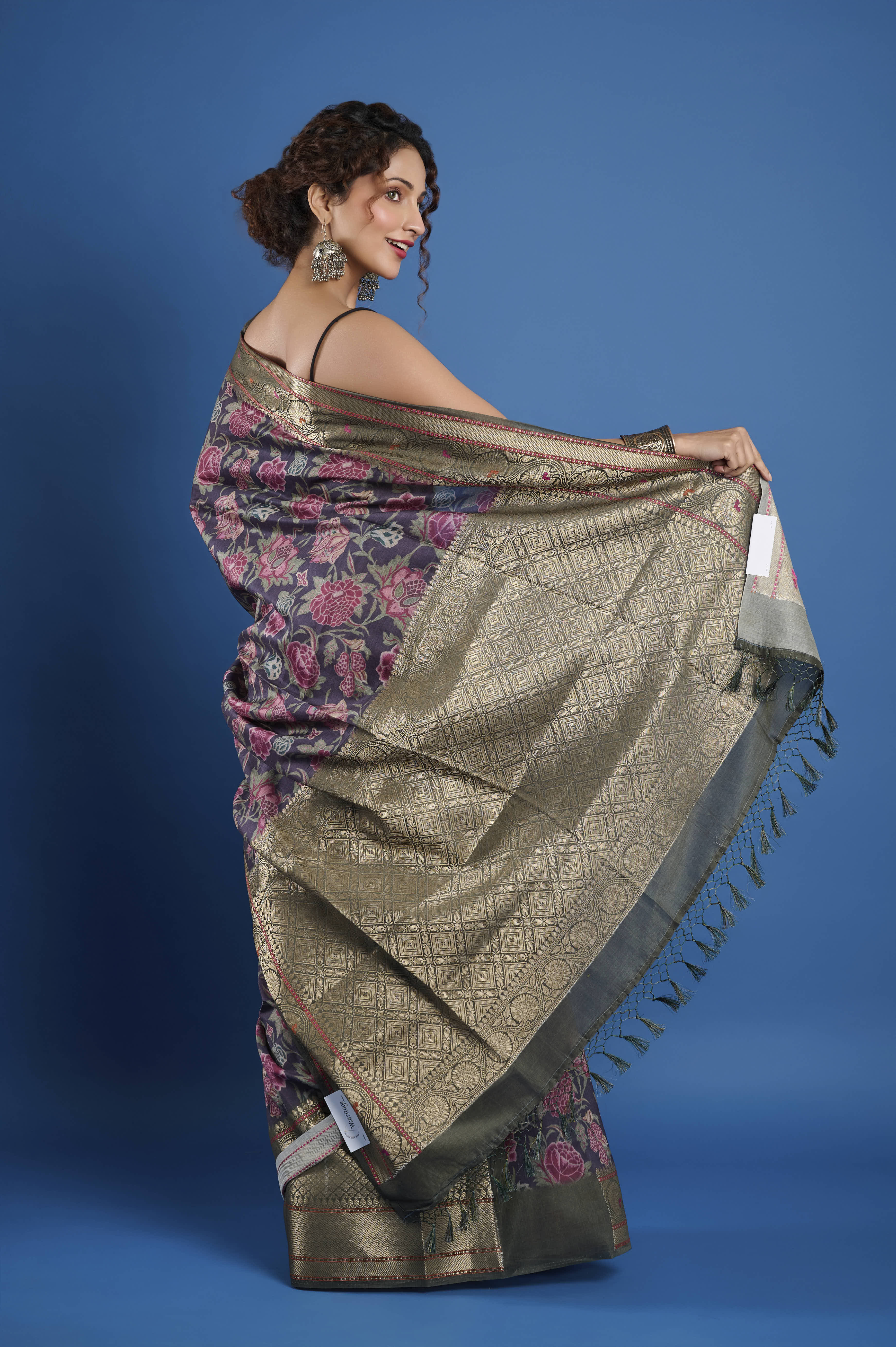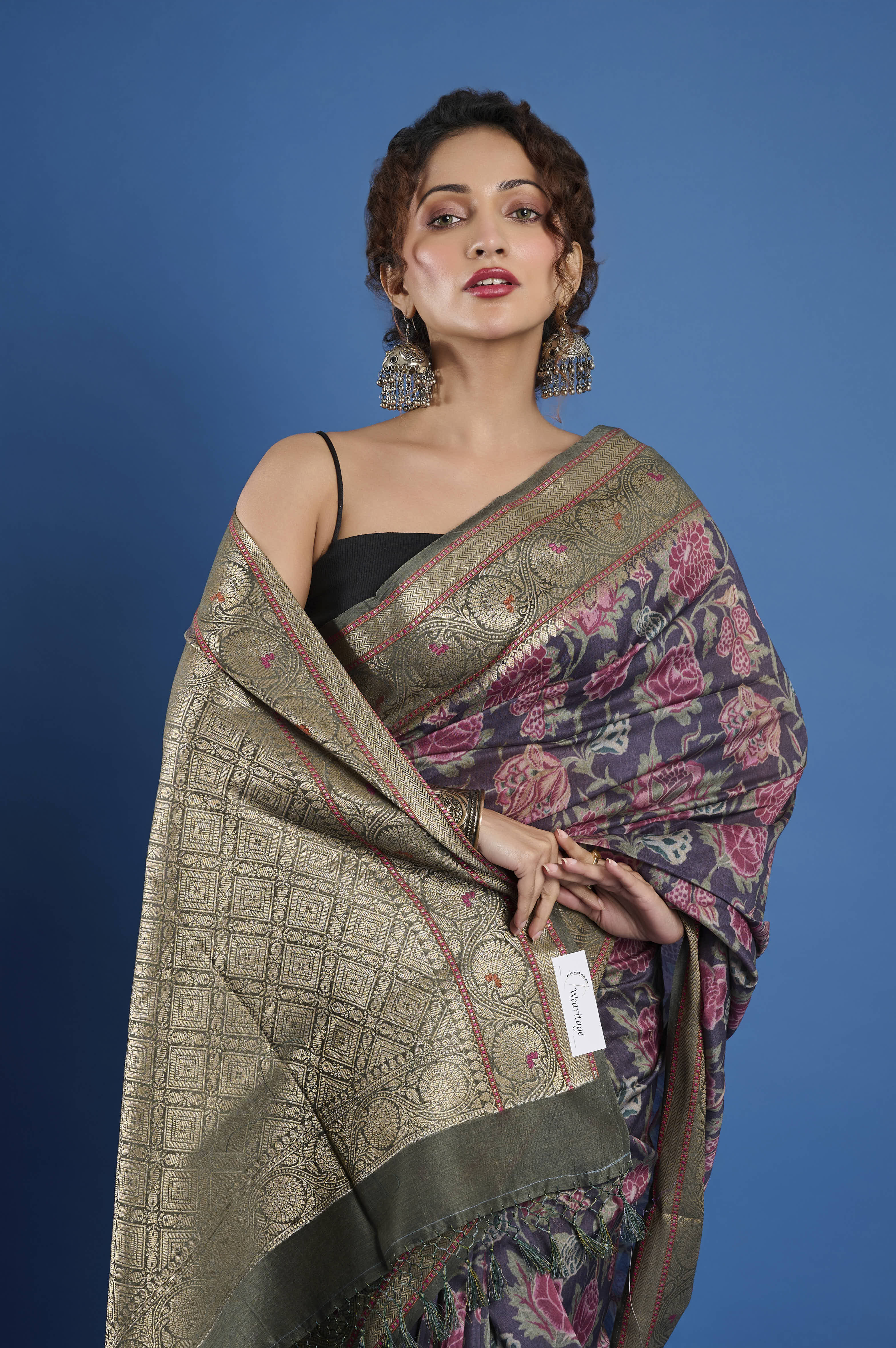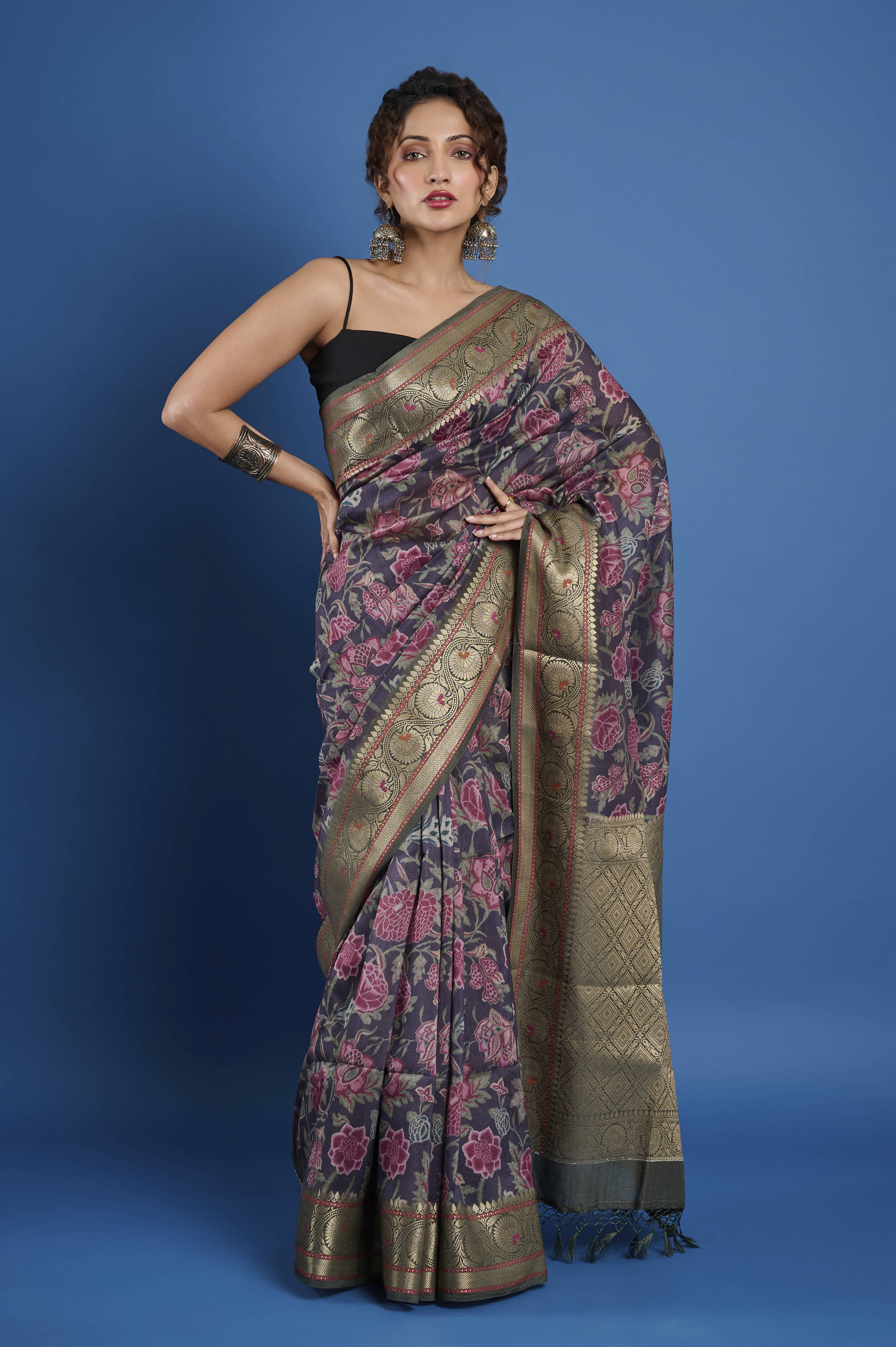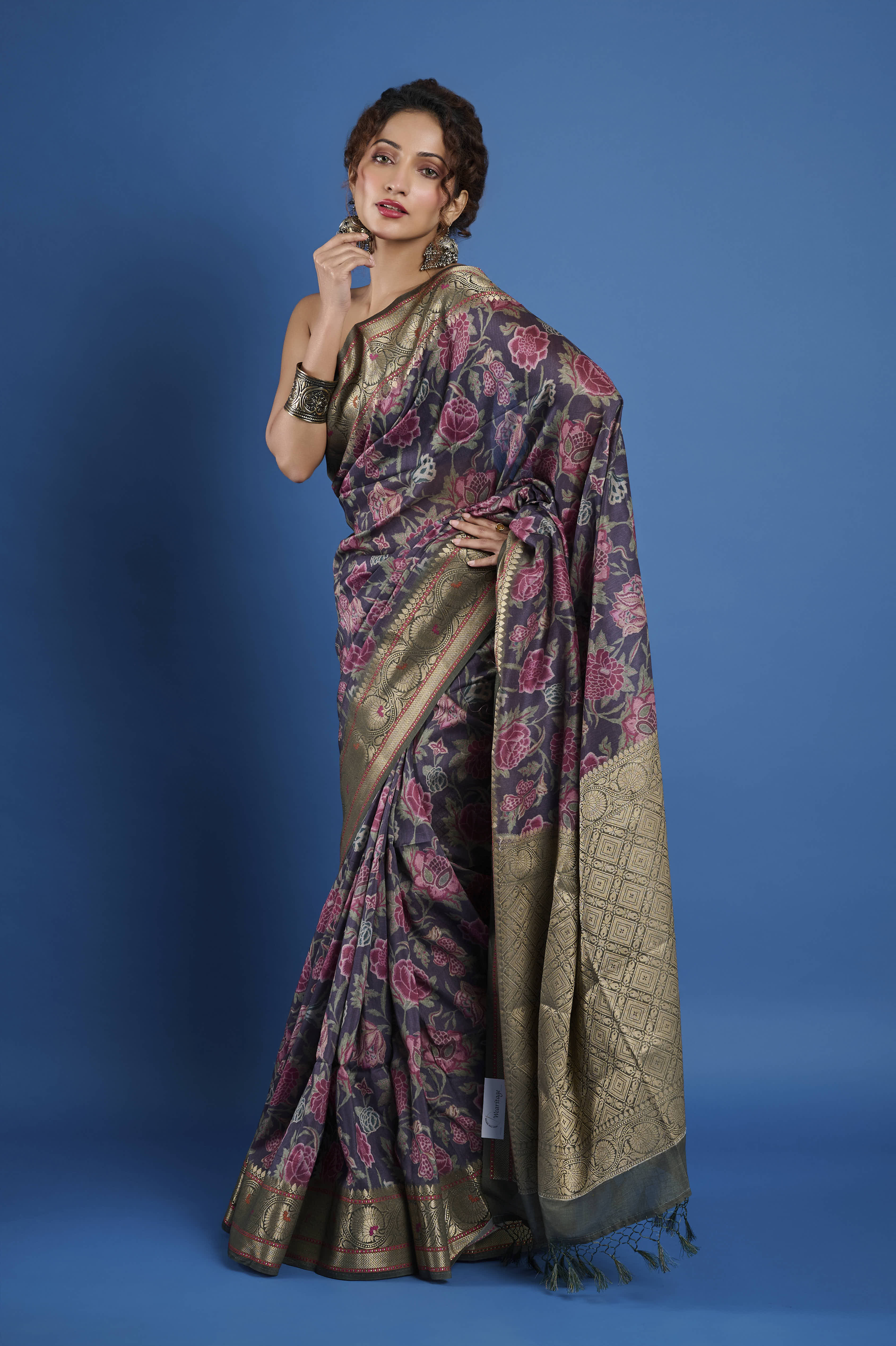 This pure Chanderi saree features a dark base overlaid with intricate digital floral motifs in berry and dusty rose, finished with a luxurious antique gold zari border and pallu. The lightweight, sheer texture of true Chanderi ensures an elegant drape, while the print and opulent border add a refined statement. This saree is perfect for festive gatherings, receptions, or formal daytime events and comes with a matching unstitched blouse piece for custom tailoring.
