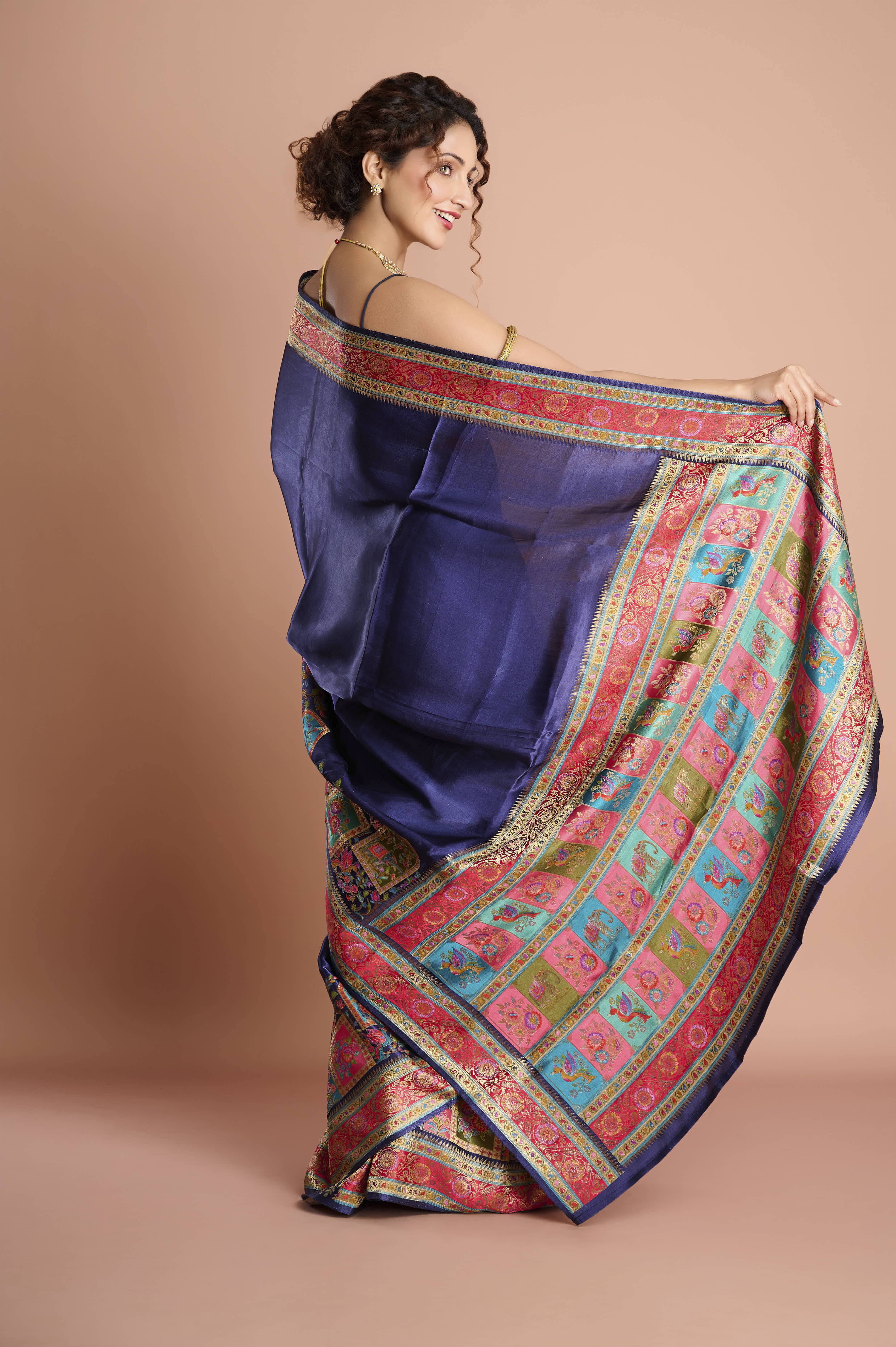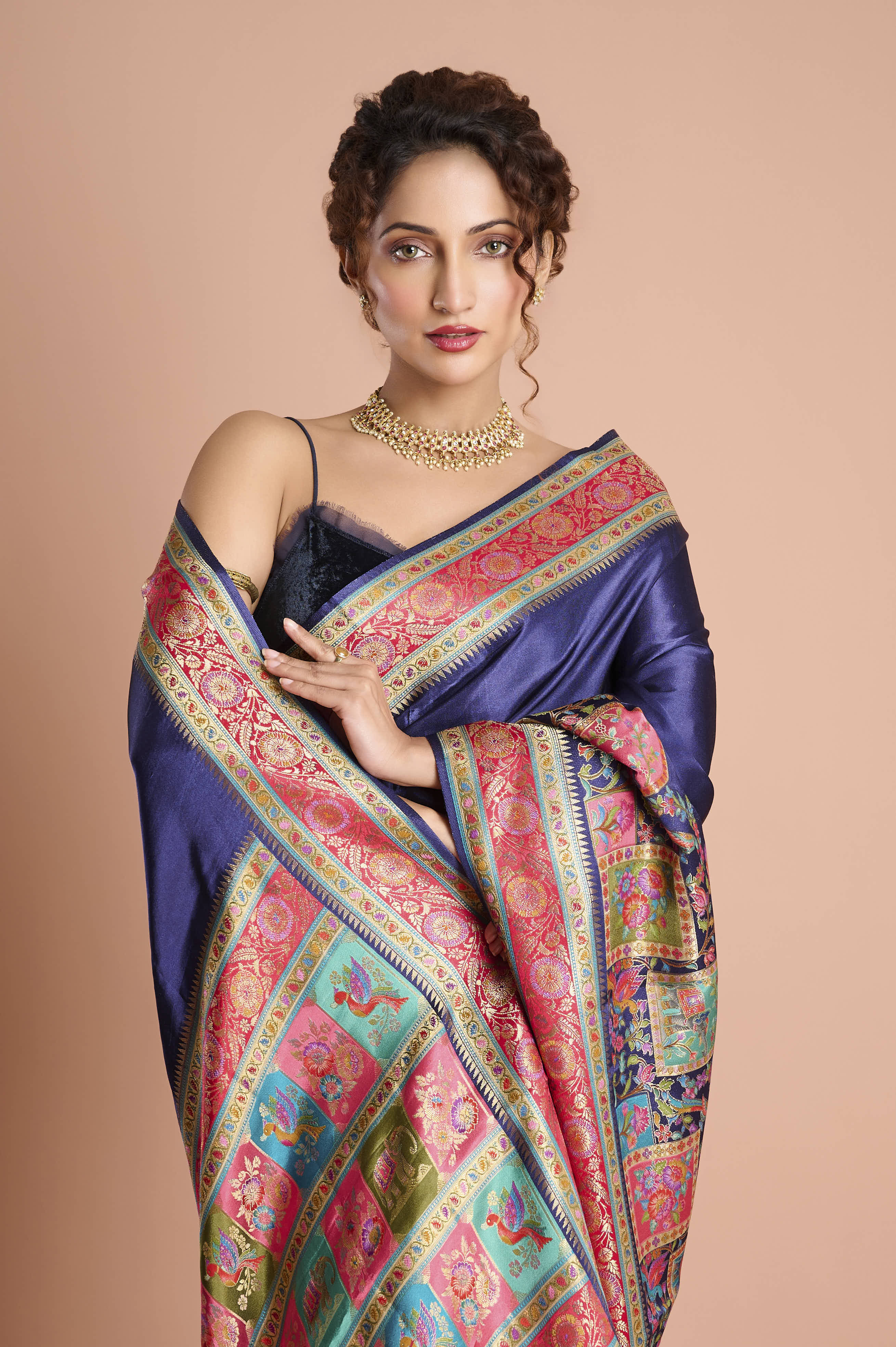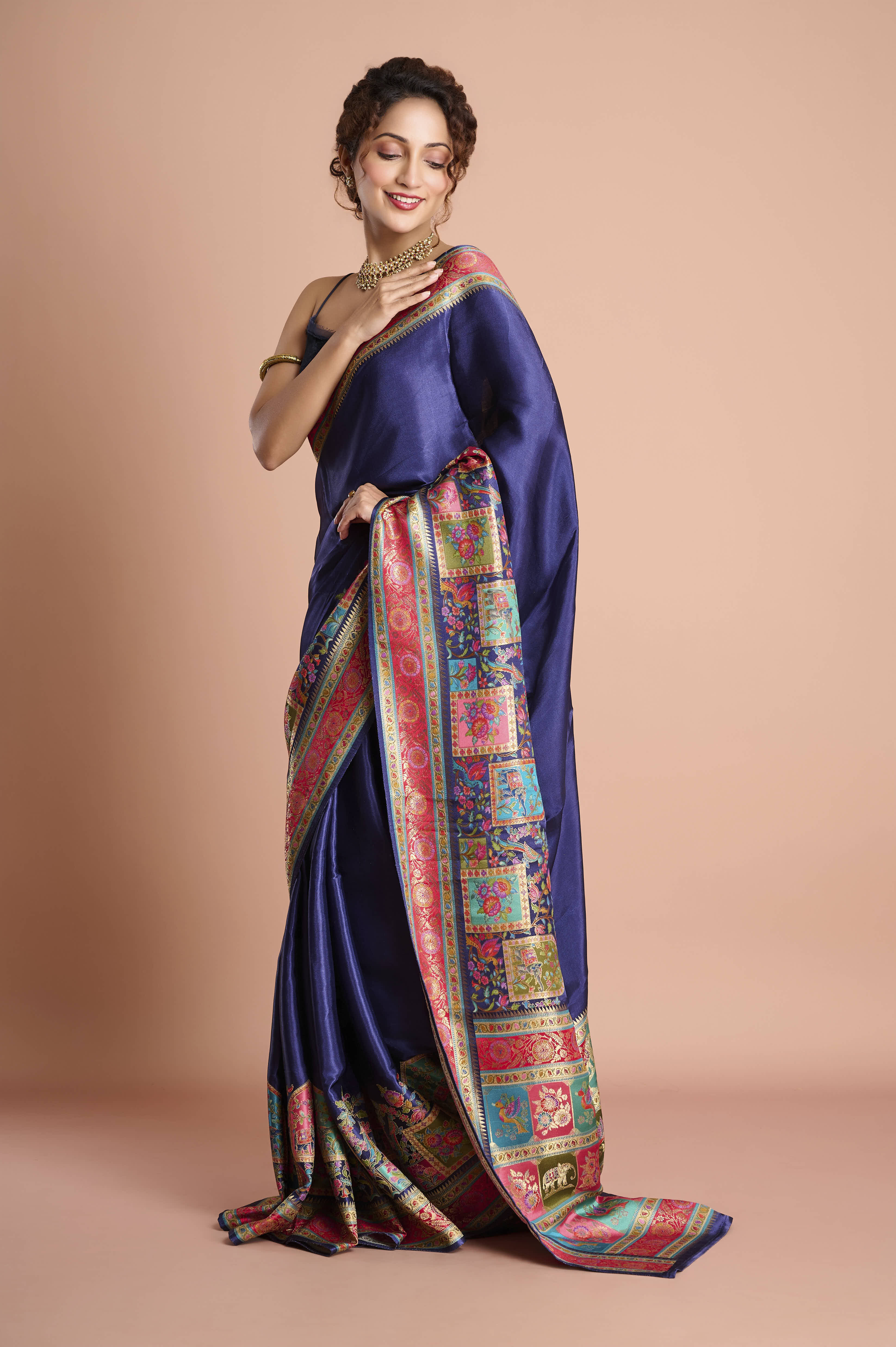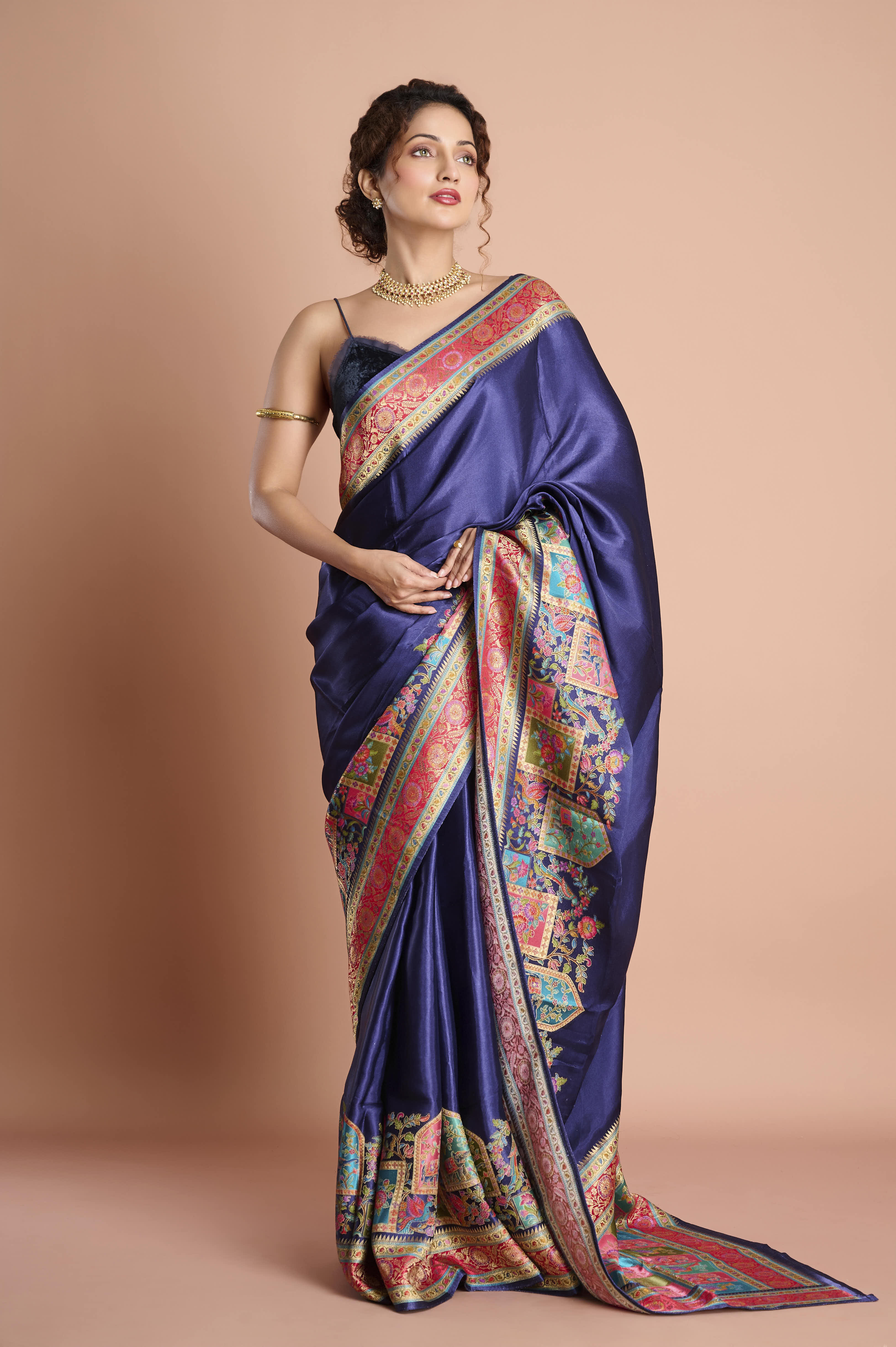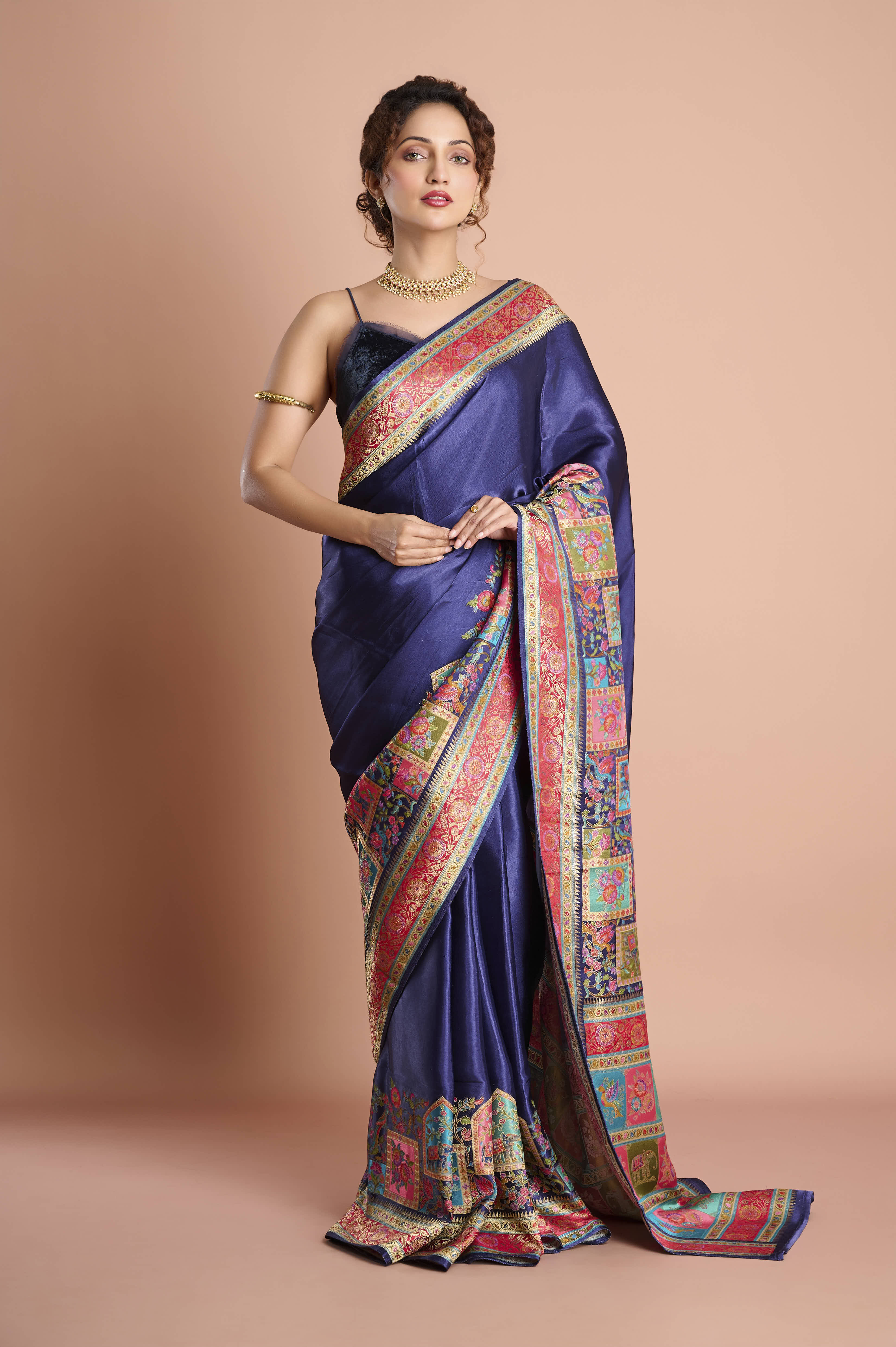 Command attention at any special event with this midnight blue satin saree, radiating luxury through a wide multicolour woven border. The rich blue silk is contrasted by vibrant pallu panels featuring traditional floral, paisley, and butta motifs in shades of pink, green, turquoise, and goldÑeach bordered delicately in zari for added drama. Its glossy satin finish gives the saree a sensuous drape and luminous sheen, perfect for grand soirees, weddings, or celebrations. This exquisite saree offers both comfort and visual opulence, accompanied by an unstitched blouse piece for personalization.