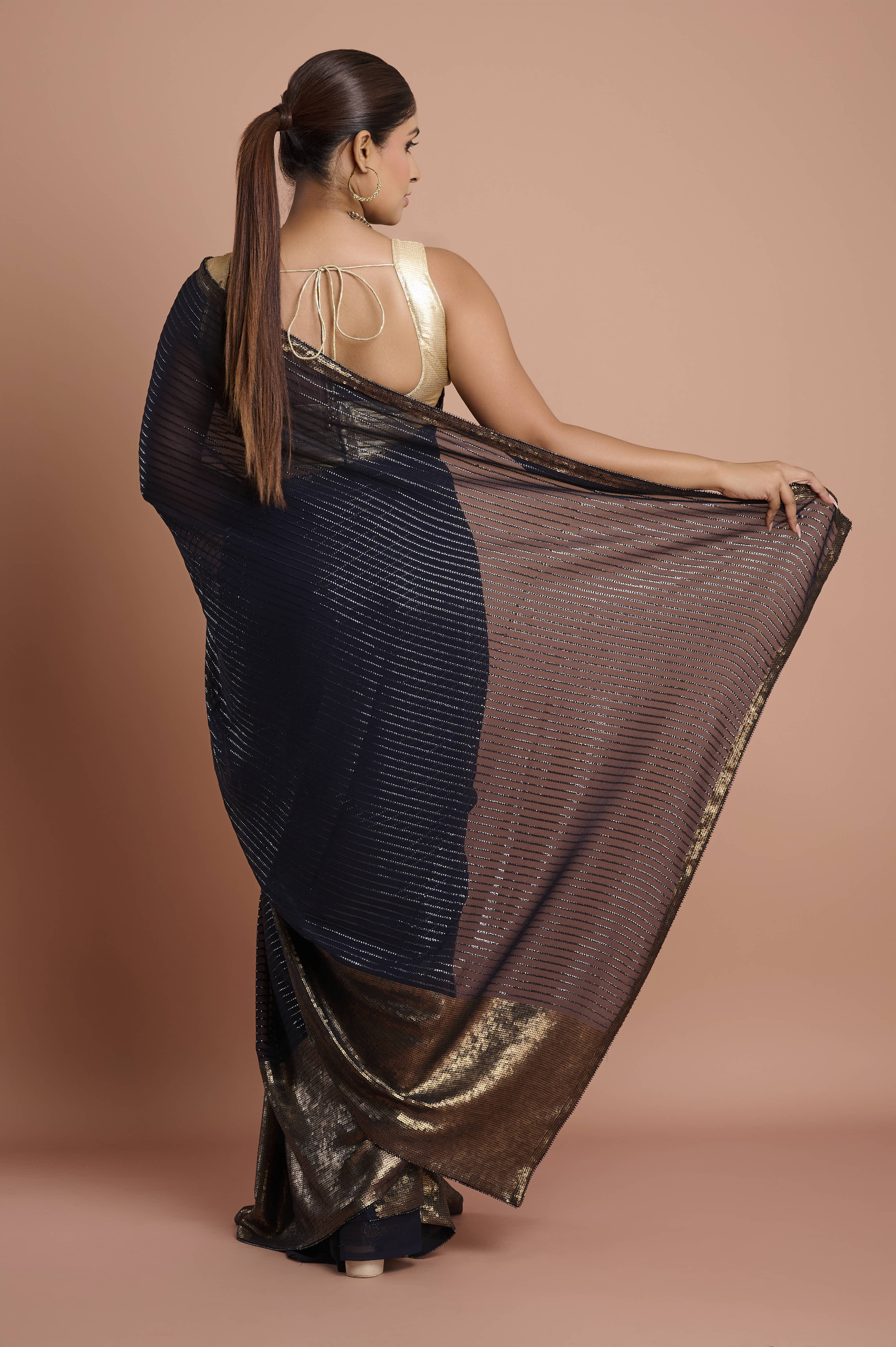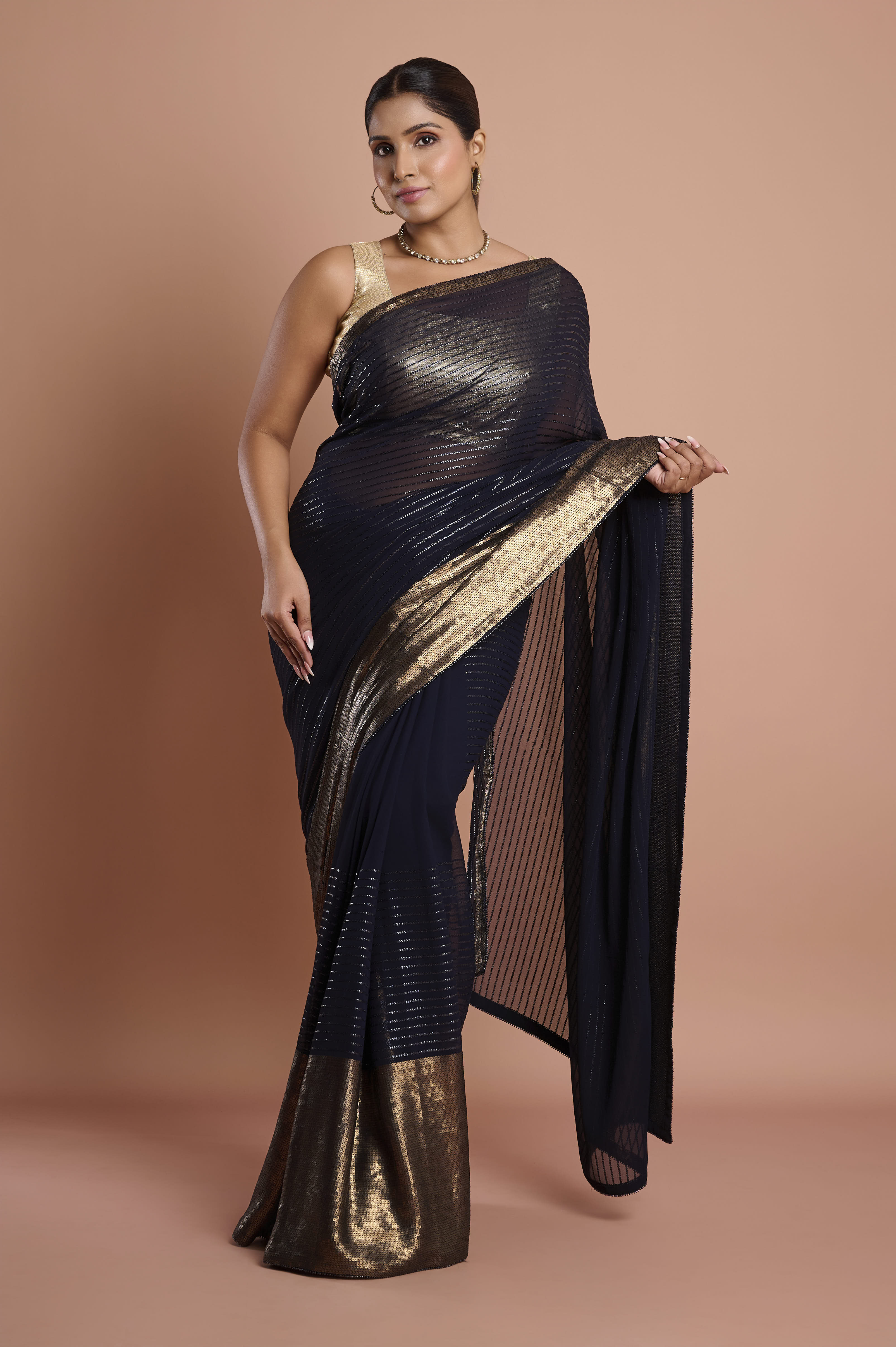 Elegant and timeless, this dark blue georgette saree features an intricate scattered floral pattern teamed with subtle metallic threadwork for a breezy yet sophisticated look. The sheer georgette fabric allows for graceful draping with effortless fluidity, while the scalloped border enhanced with meticulous embroidery gives a refined finishing touch. Perfect for evening affairs and formal occasions, this saree is completed with a matching unstitched blouse piece for personalized styling.