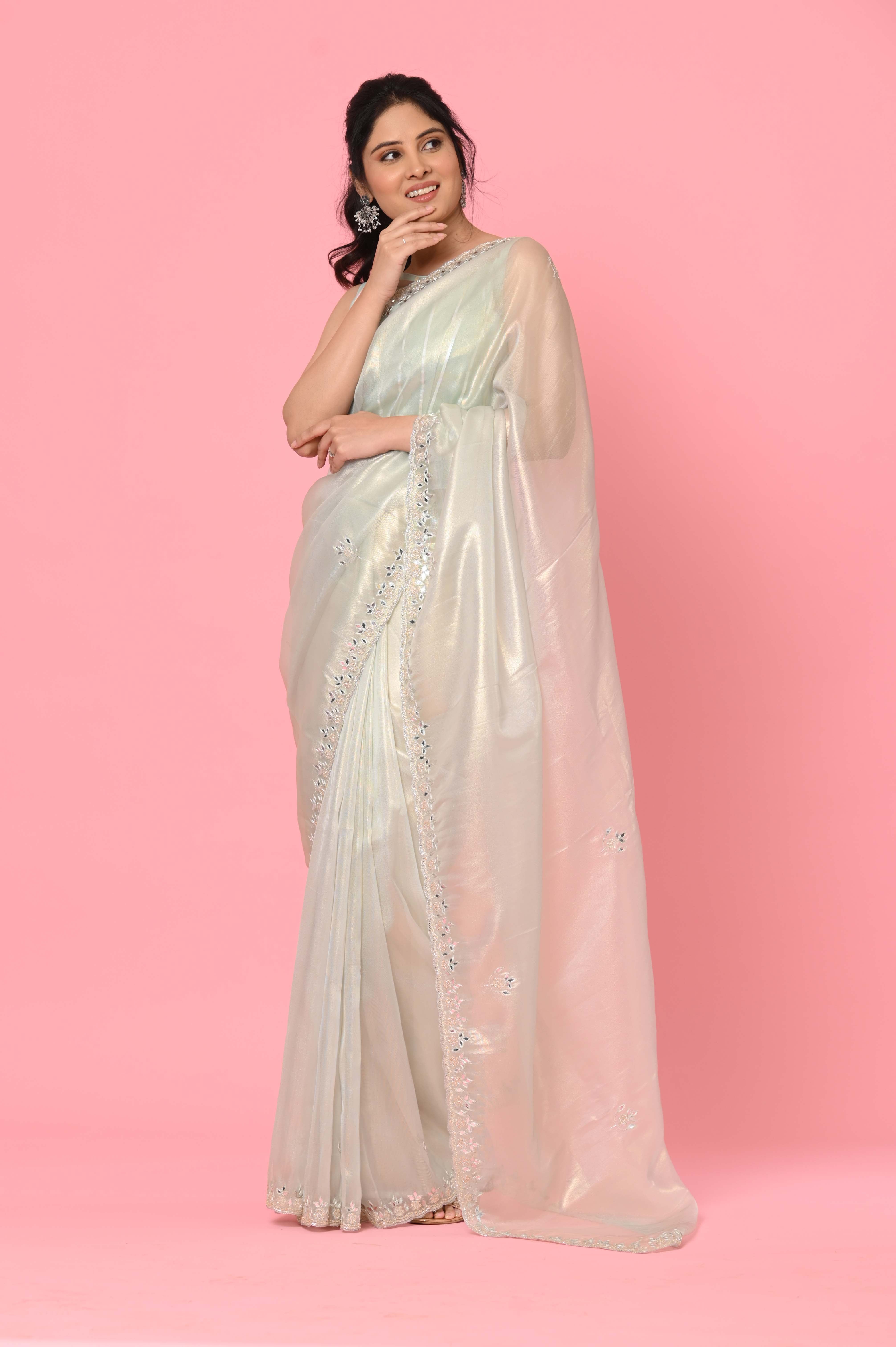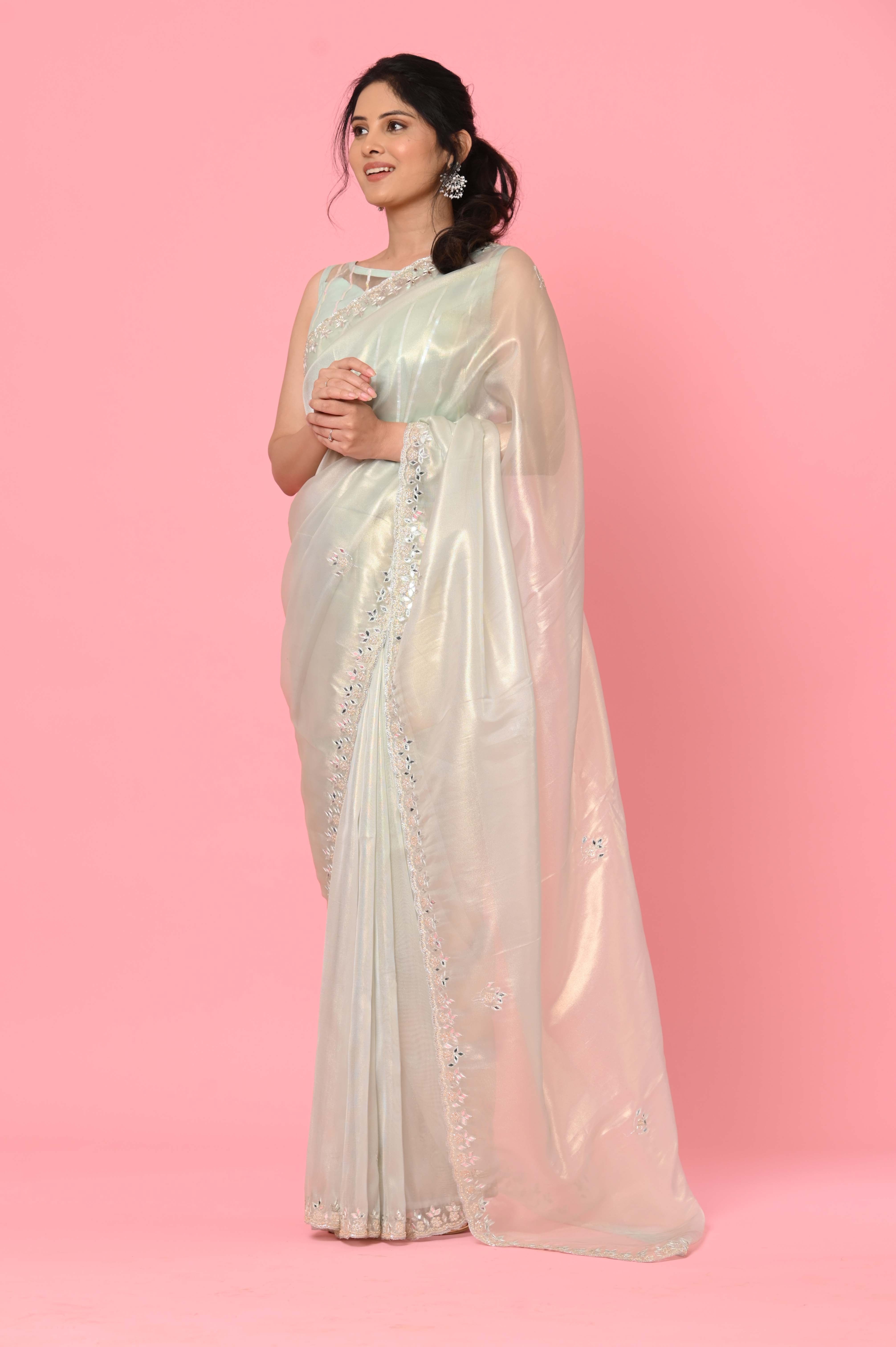 A tissue saree with mirror work is a stunning and glamorous choice for traditional Indian attire. Tissue fabric is known for its lightweight and translucent quality, which gives it a beautiful sheen and drape. When combined with mirror work, it adds a touch of sparkle and elegance to the saree.