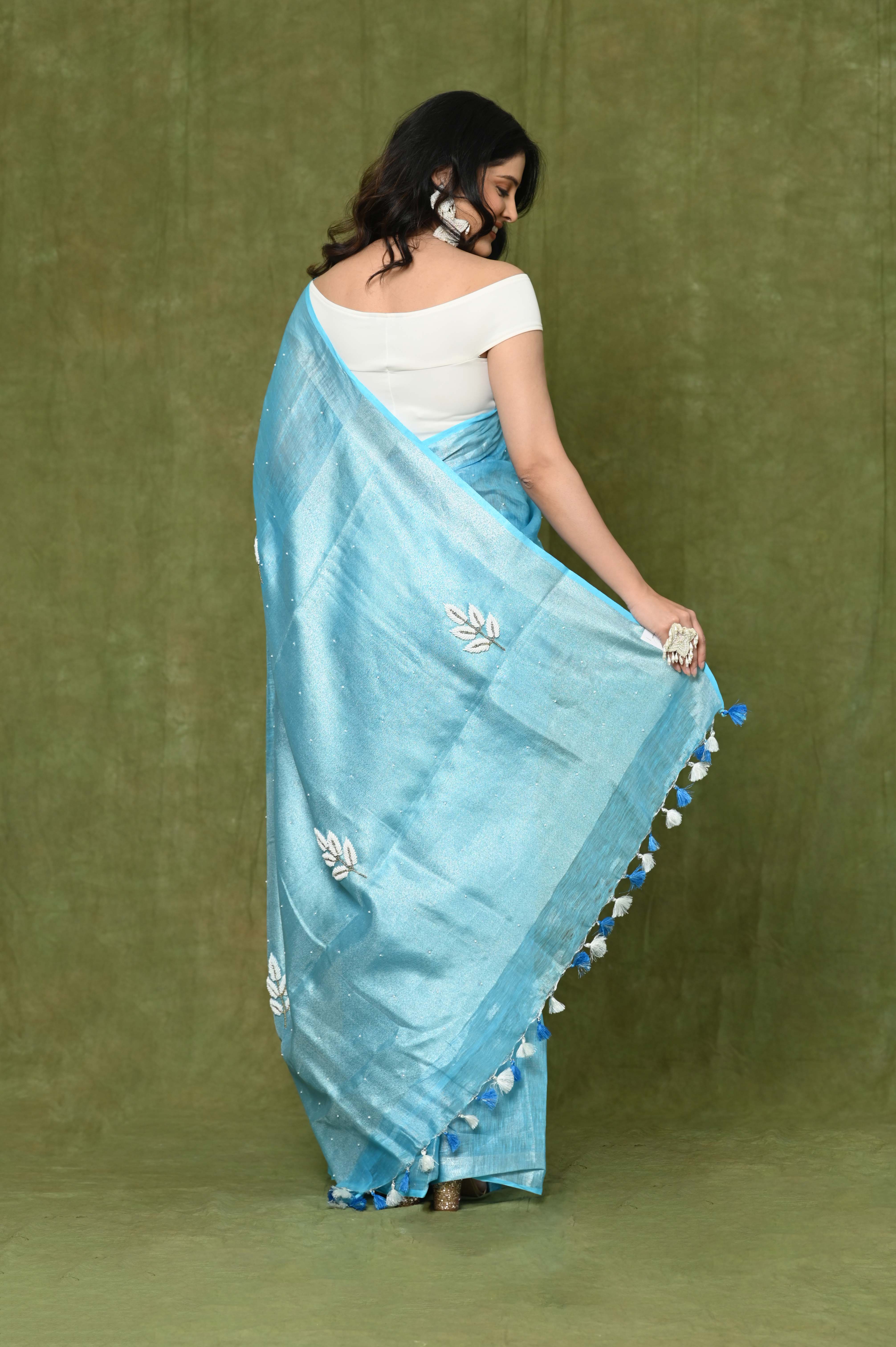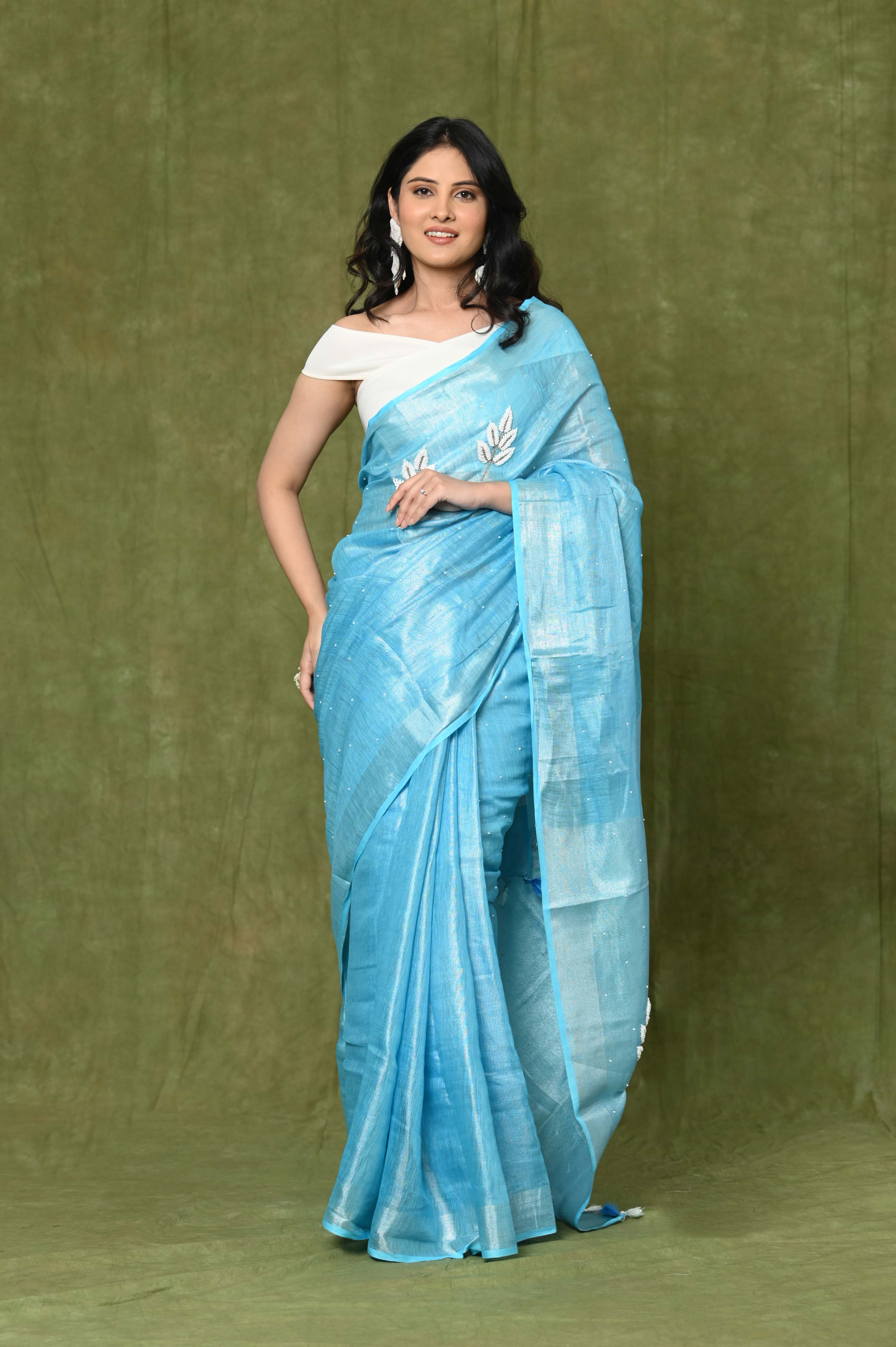 A linen tissue saree with handwork is a beautiful and elegant choice for various occasions. Linen tissue is a combination of linen, known for its breathability and texture, and tissue fabric, which adds a subtle sheen and transparency to the saree. Handwork can include various forms of intricate hand-embroidery, embellishments, or detailing.