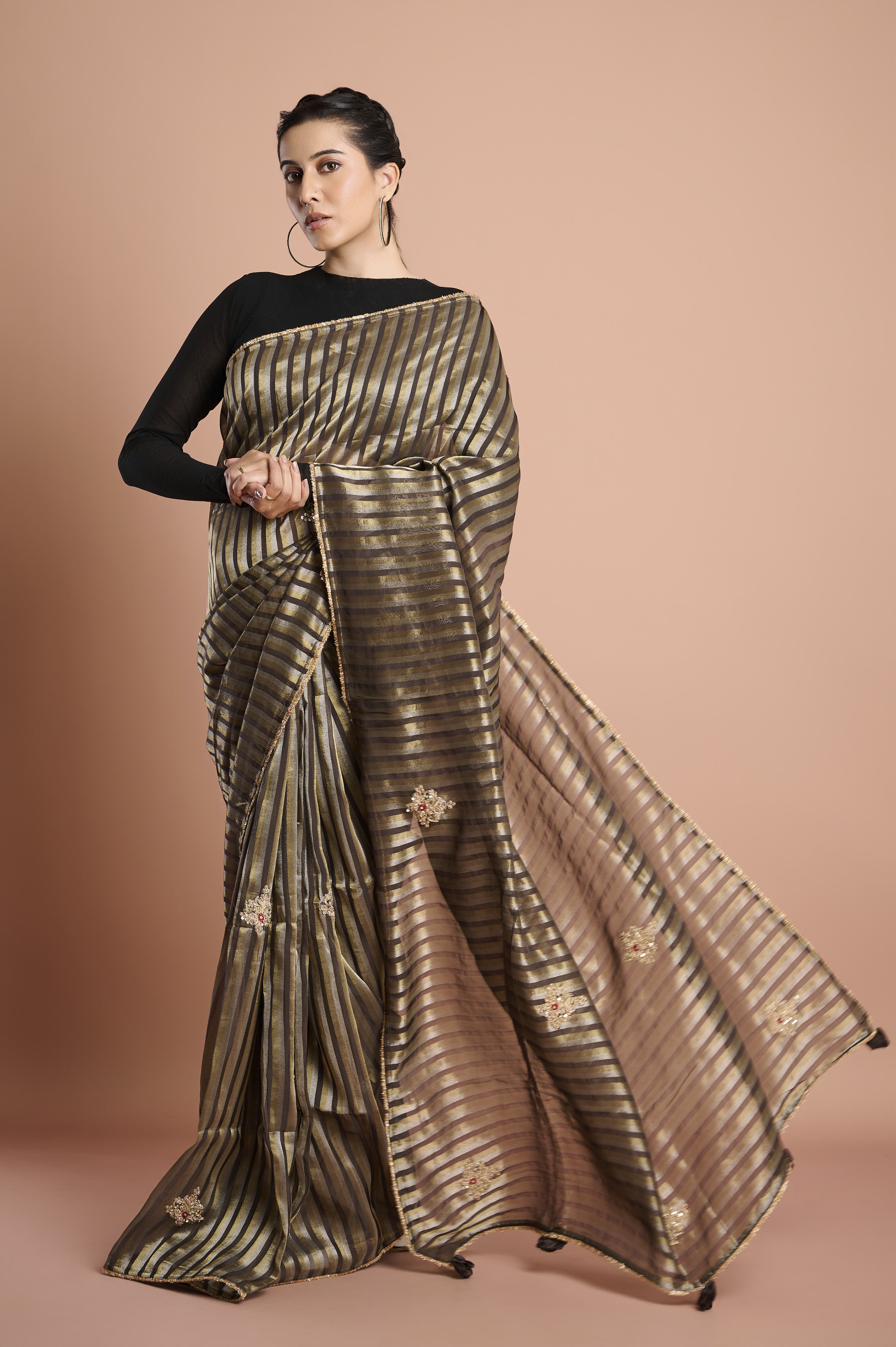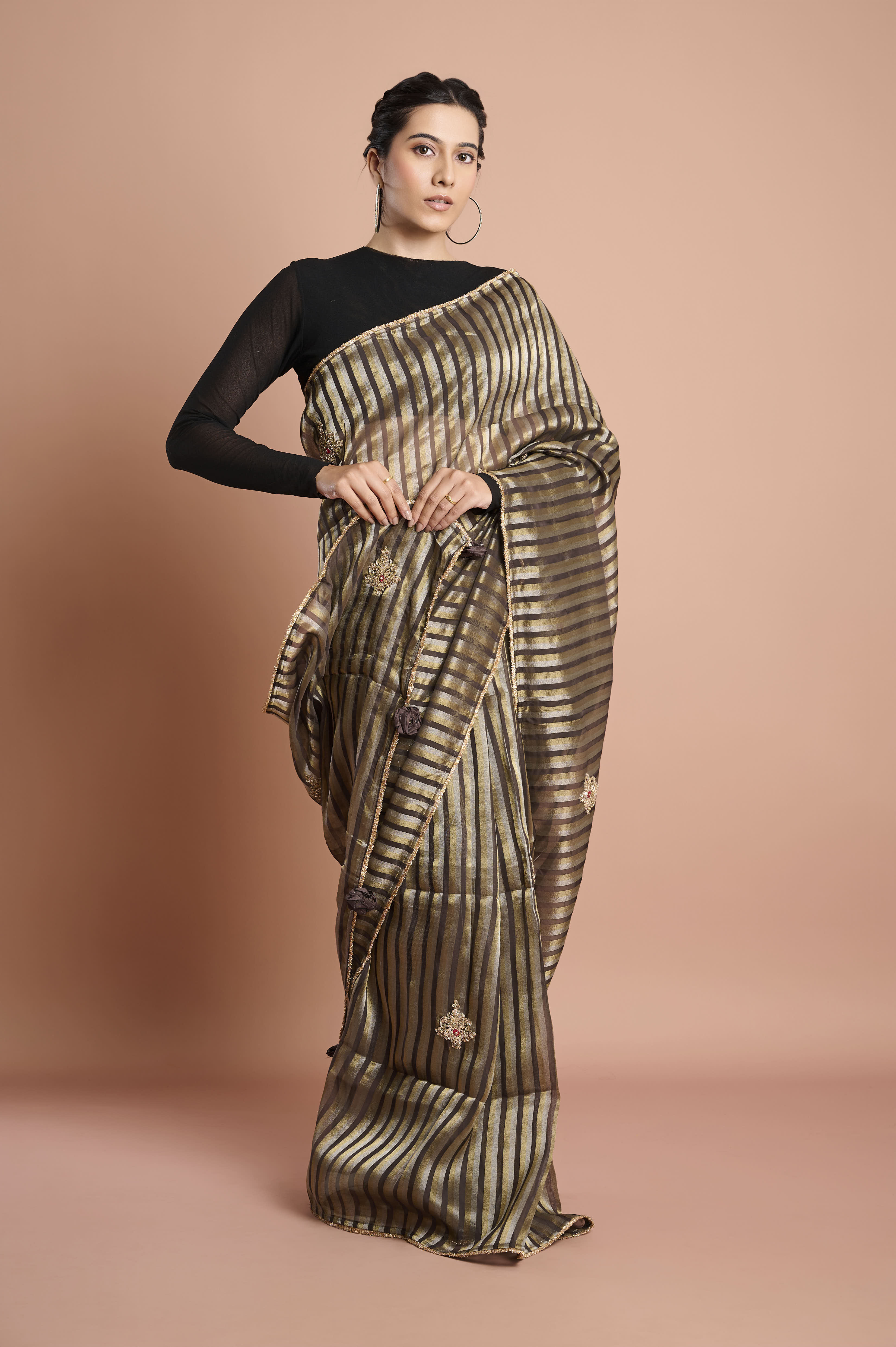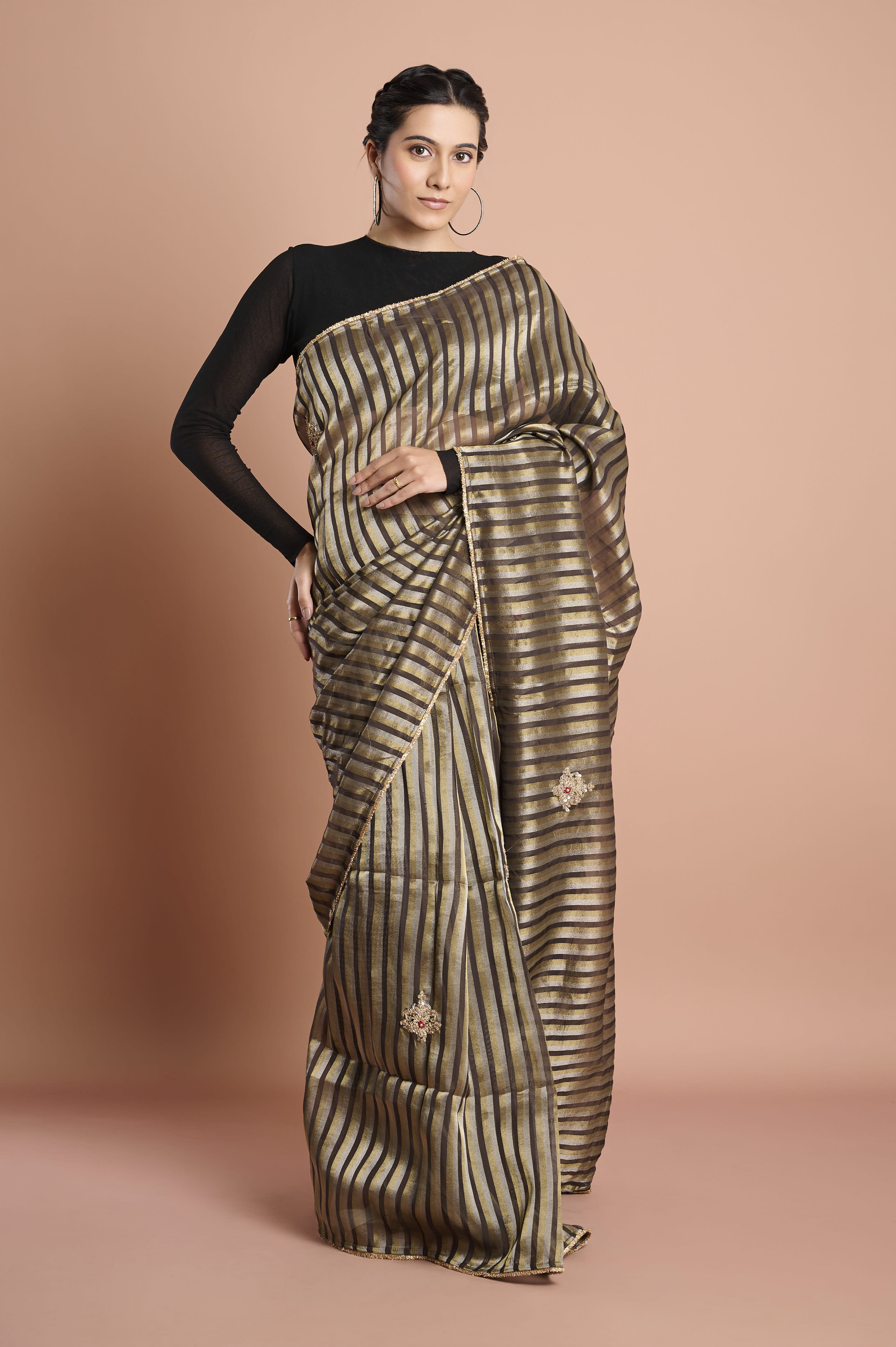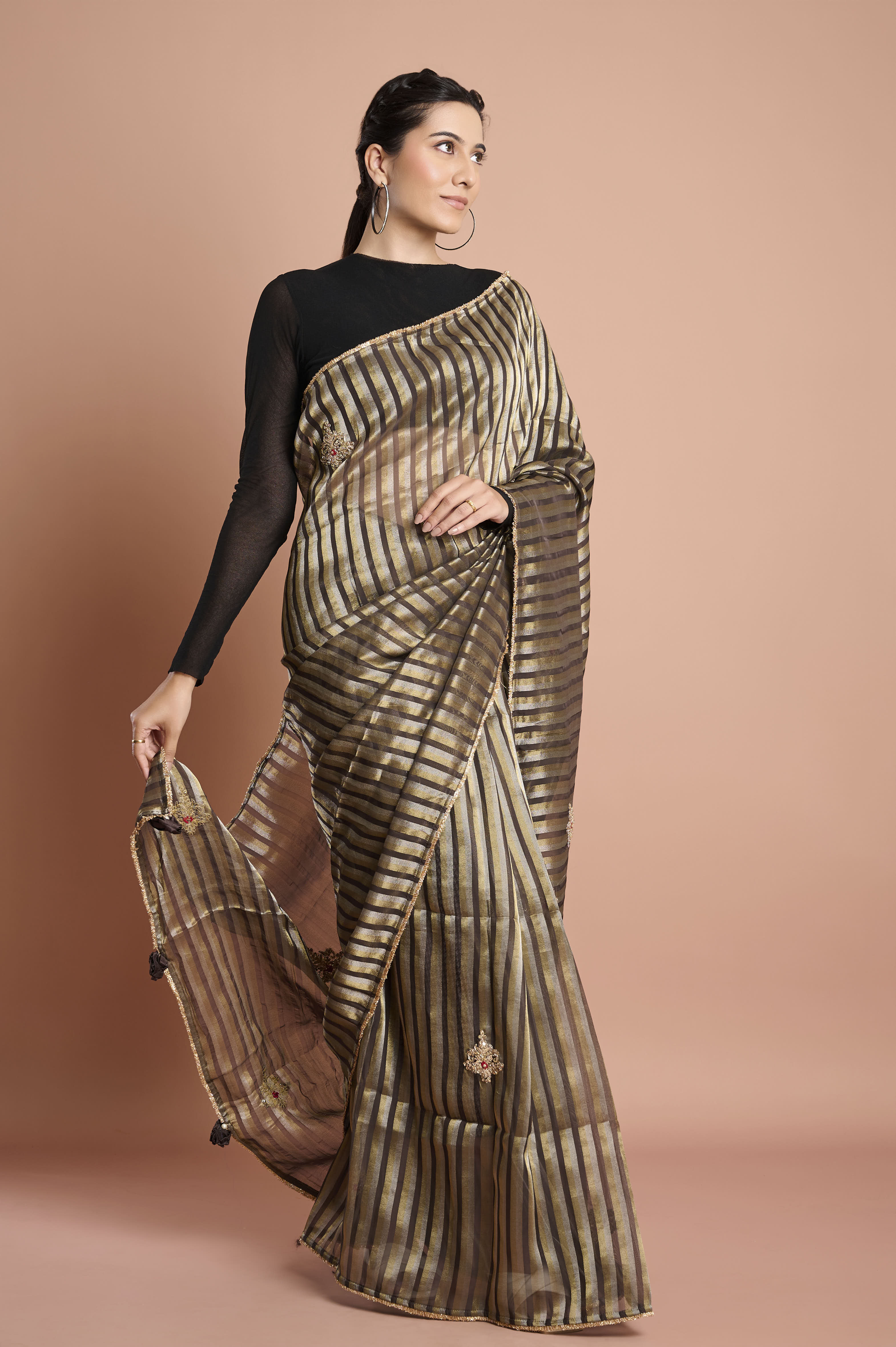 This sophisticated saree features bold horizontal stripes in rich black and lustrous gold woven throughout the premium organza fabric, creating a striking contemporary design with timeless elegance. The saree showcases uniform metallic gold stripes against deep black base that adds dramatic visual impact, enhanced by the structured drape and subtle transparency characteristic of quality organza material. It is beautifully finished with delicate golden lace trim and small decorative motifs that add refined detailing to the modern striped pattern. The lightweight organza fabric provides excellent structure with graceful movement, making it perfect for cocktail parties, evening events, and formal celebrations.