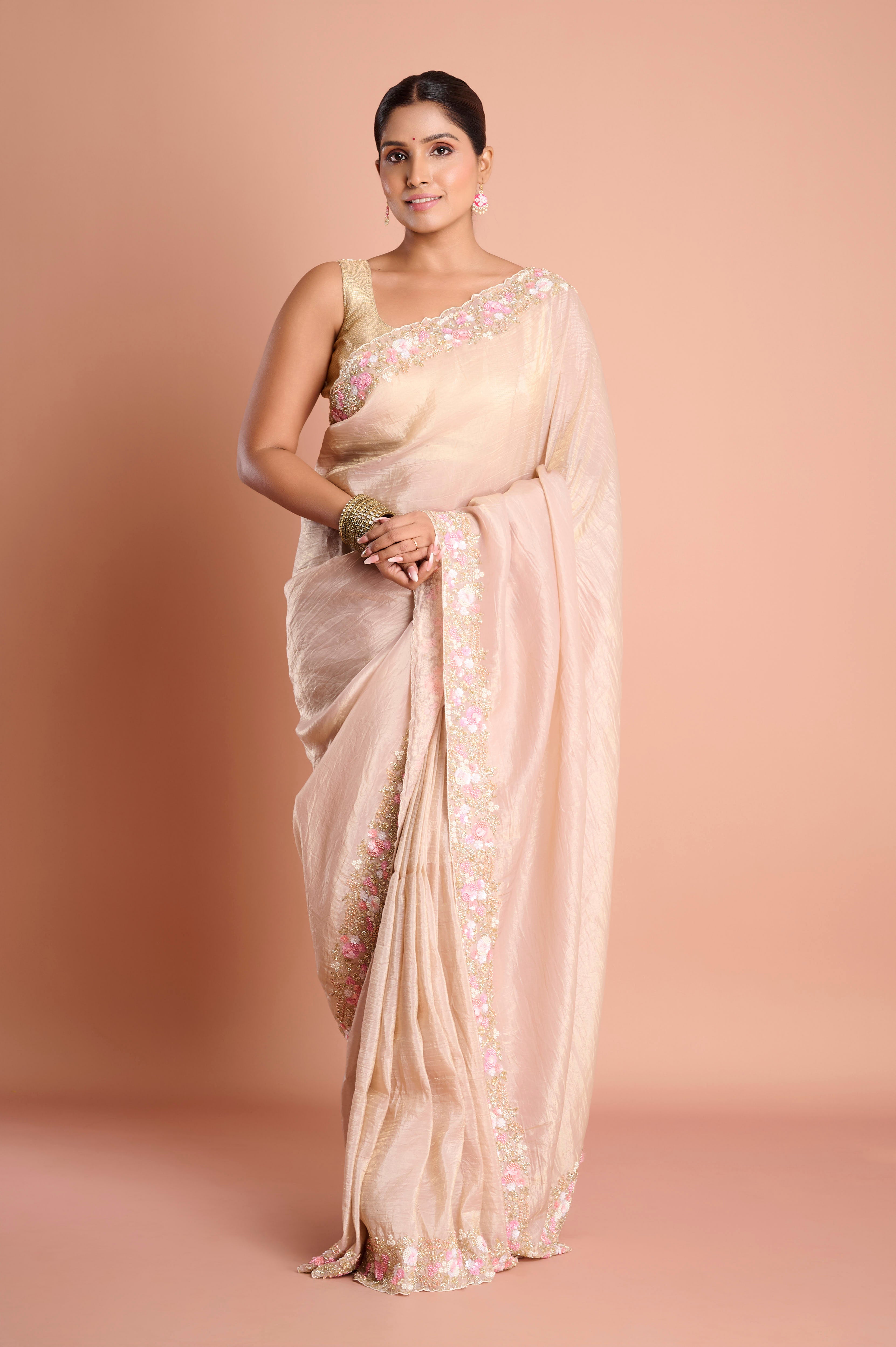 Envelope yourself in soft radiance with this crushed tissue (Onex) saree in a refined blush nude shade, crafted for luxurious parties and evening glamour. The saree features a signature crushed texture that plays beautifully with light, offering gentle shimmer and eye-catching depth throughout. An ornate border, adorned with pastel pink and white floral embroidery, pearl beads, and delicate sequins, adds a romantic and feminine accent. Featherlight drape and contemporary styling ensure effortless grace, while an included unstitched blouse piece lets you customize your look.