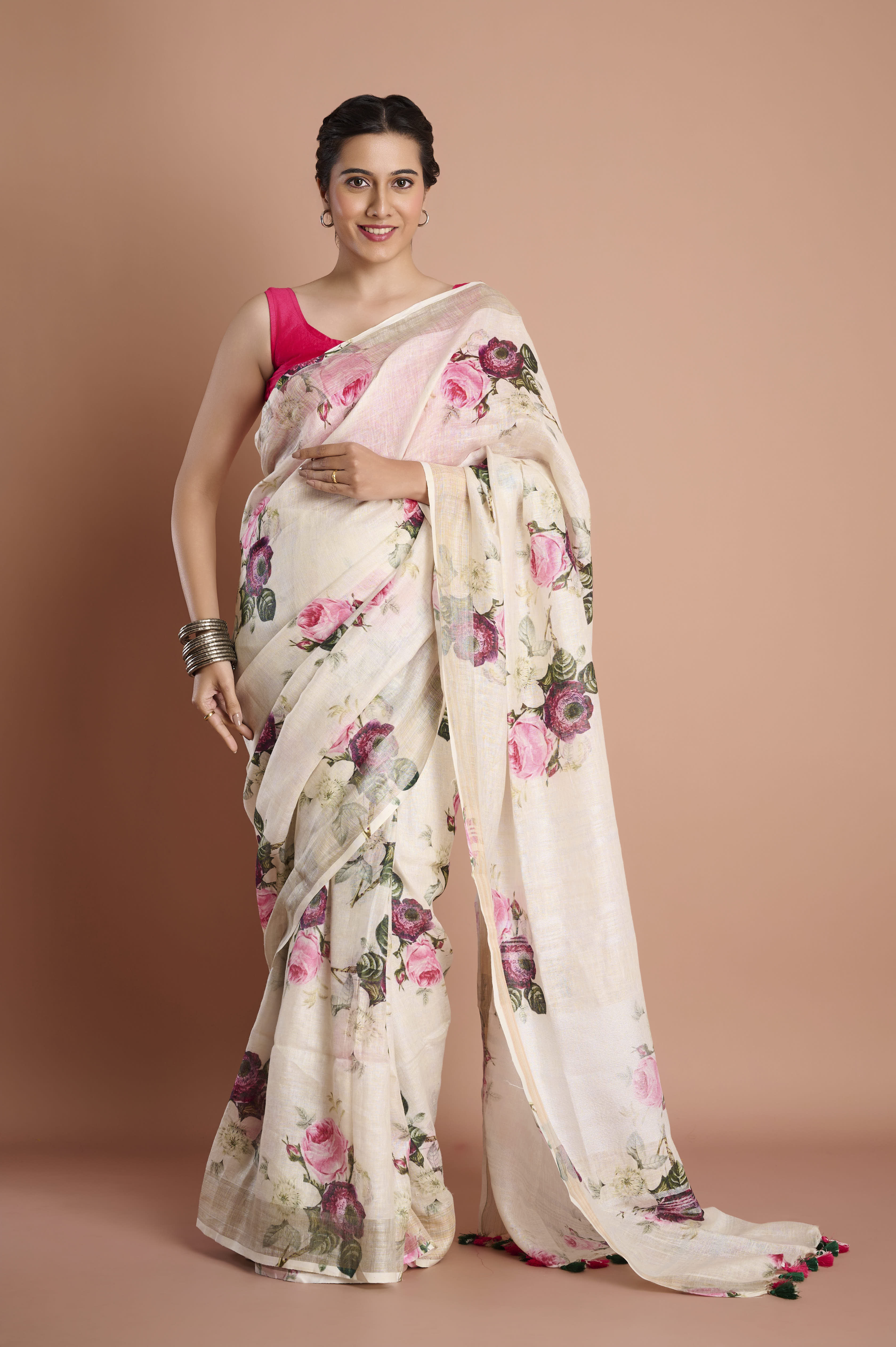 This breezy pure linen saree features a beautiful digital floral print in rosy pinks and wine tones on a soft off-white base, highlighted with subtle green accents. The digital print lends a contemporary and artistic touch, while the natural linen fabric offers exceptional comfort and breathability. Lightweight and easy to drape, this saree is perfect for daytime events, brunches, or relaxed festivities. The look is finished with a matching blouse piece for versatile styling.