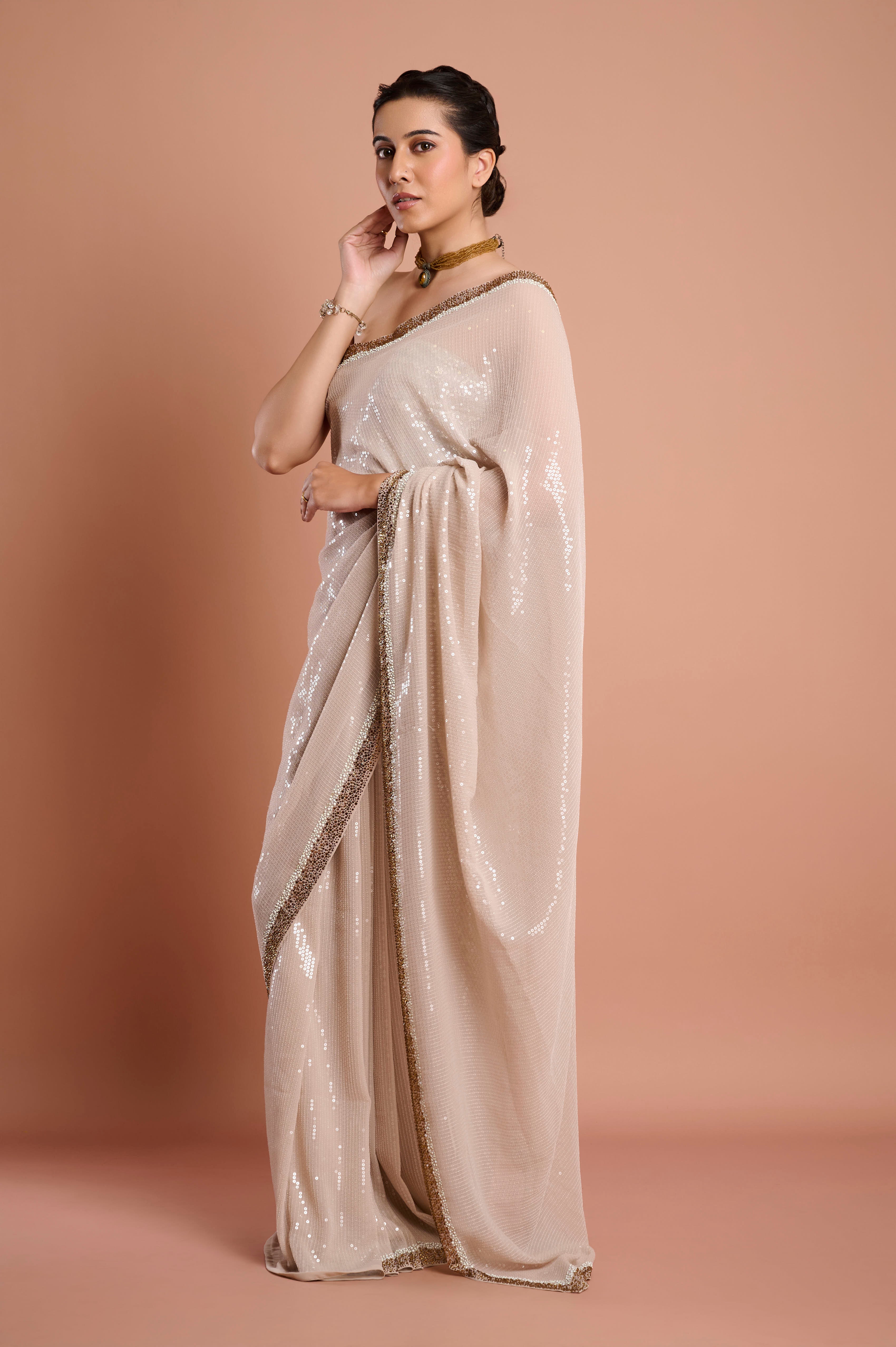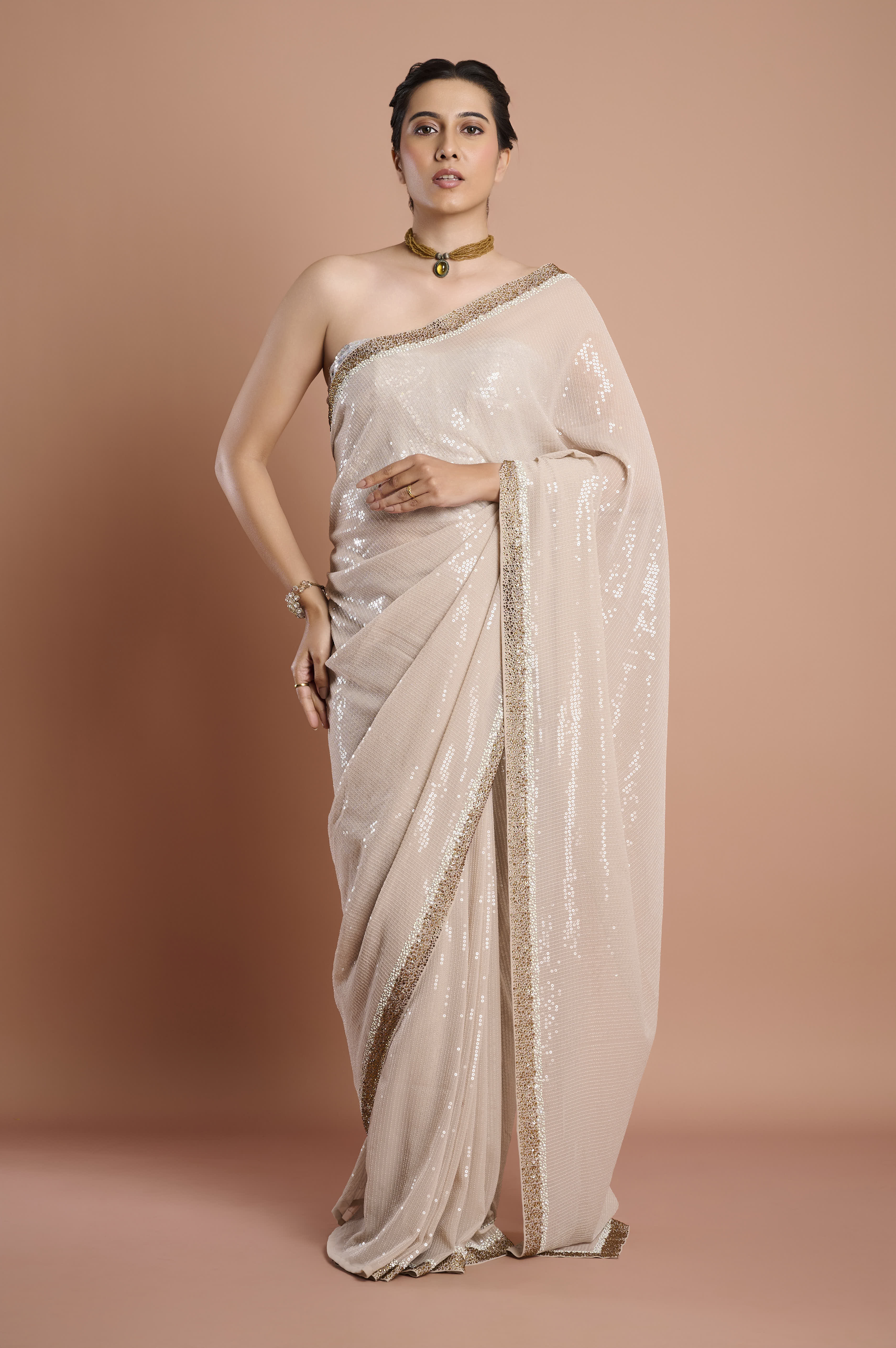 Add a touch of modern glamour to any occasion with this champagne beige georgette saree, lavishly adorned with sparkling sequins work all over for non-stop shimmer and elegance. The saree features a delicately hand-embellished border in matching metallic tones, delivering statement-worthy detail with every movement. Lightweight georgette ensures a graceful drape, making this saree perfect for cocktail parties, receptions, or evening galas. Comes with an unstitched blouse piece to allow for your own unique styling.