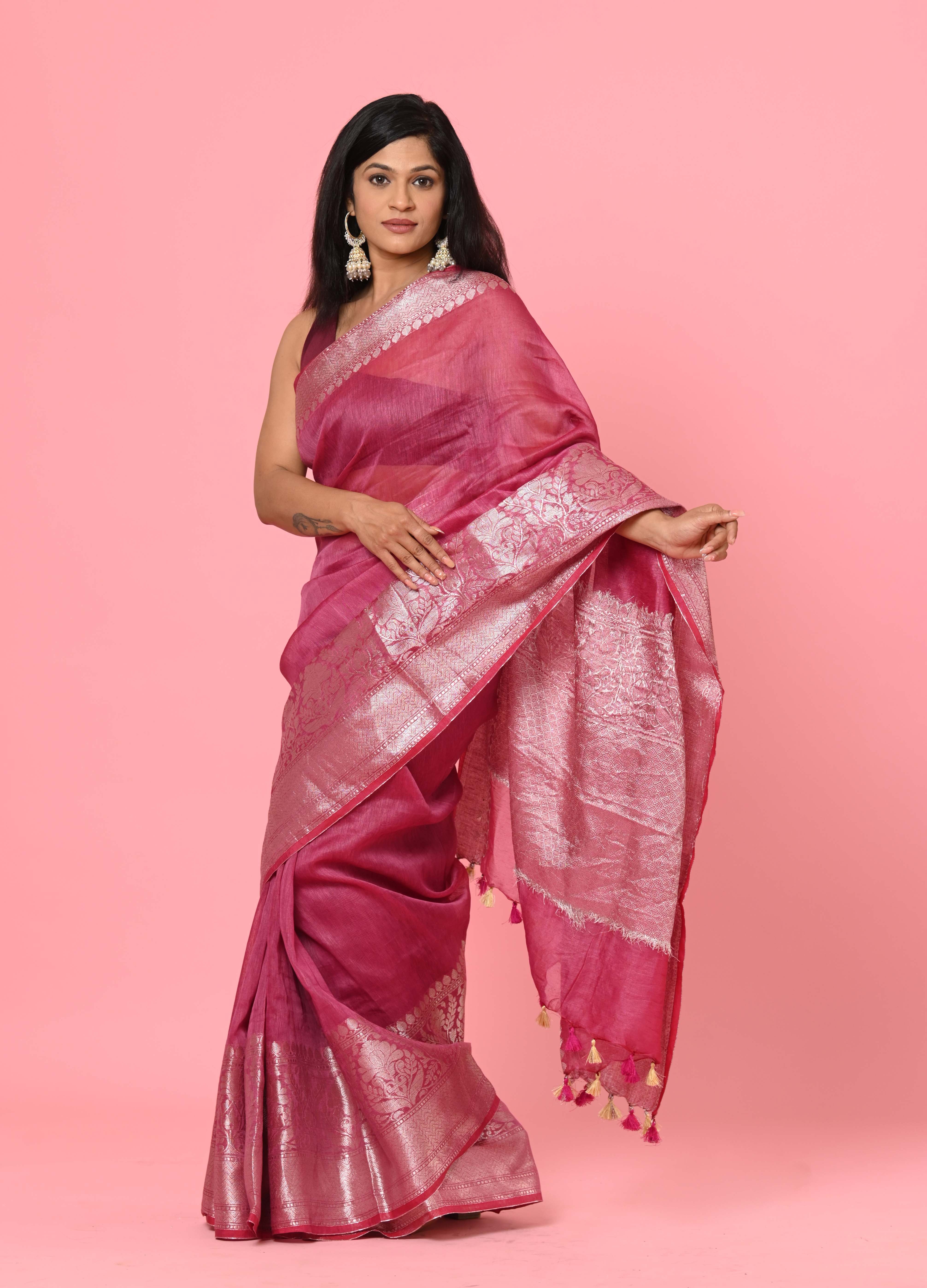 A Banarasi Linen saree combines the elegance of Banarasi silk with the comfort and breathability of linen, creating a beautiful and luxurious outfit.
