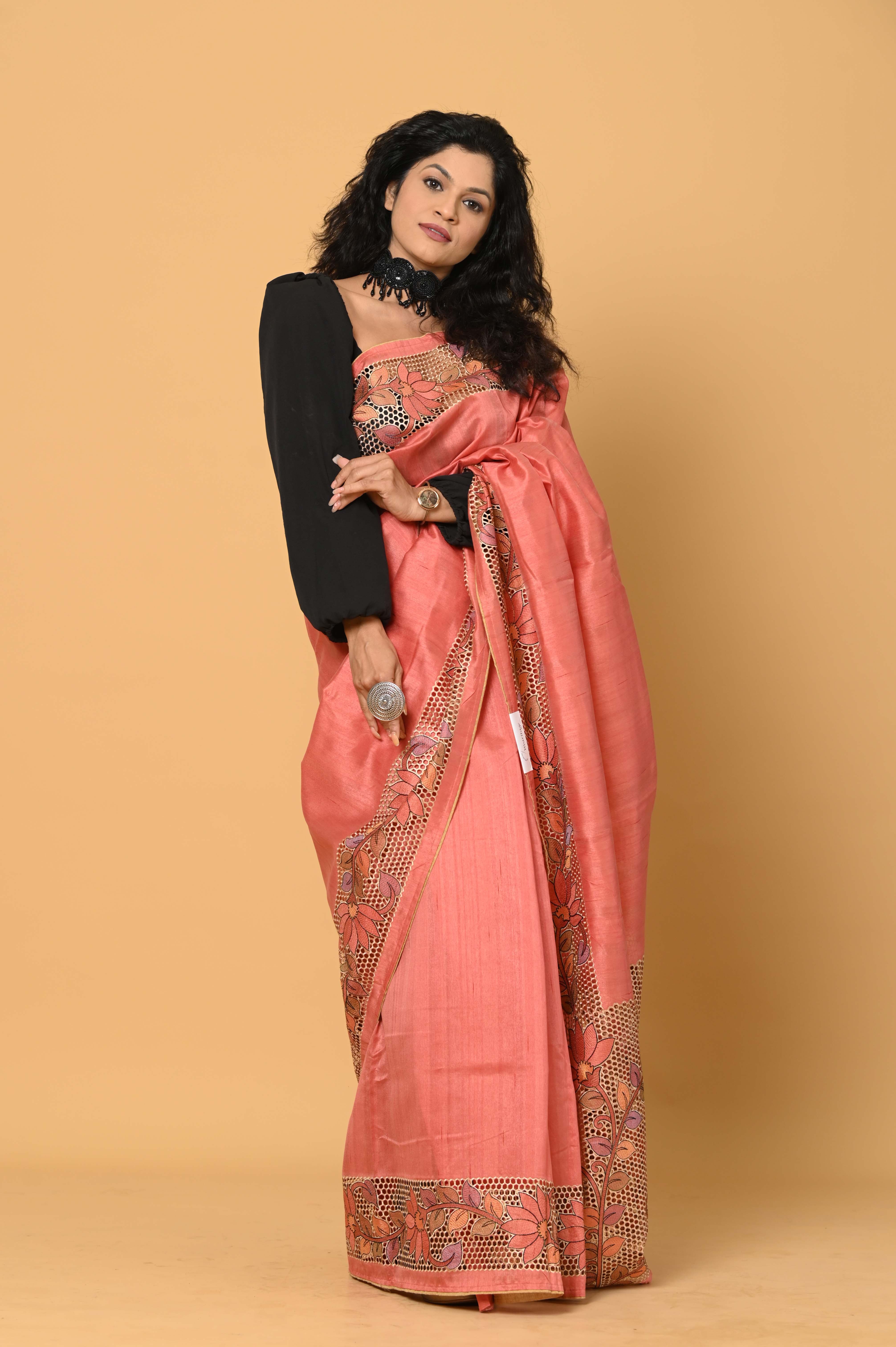 A Semi Tussar Cut Work Saree combines the beauty of semi Tussar silk with the intricate art of cut work embroidery. The cut work is typically done along the borders, pallu (decorative end), and sometimes throughout the body of the saree. It adds an element of exquisite craftsmanship to the saree, making it a fine example of traditional Indian textile artistry.