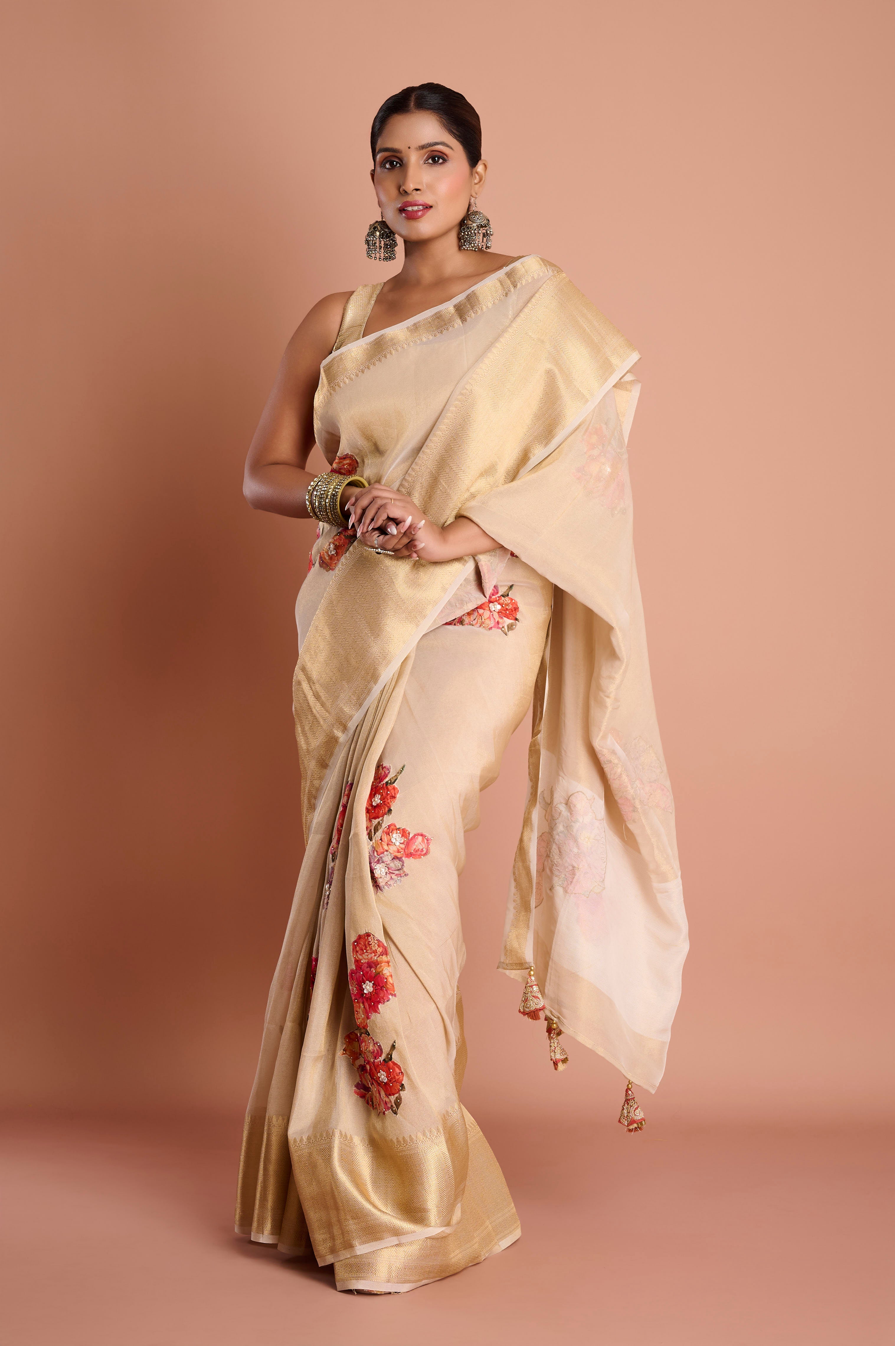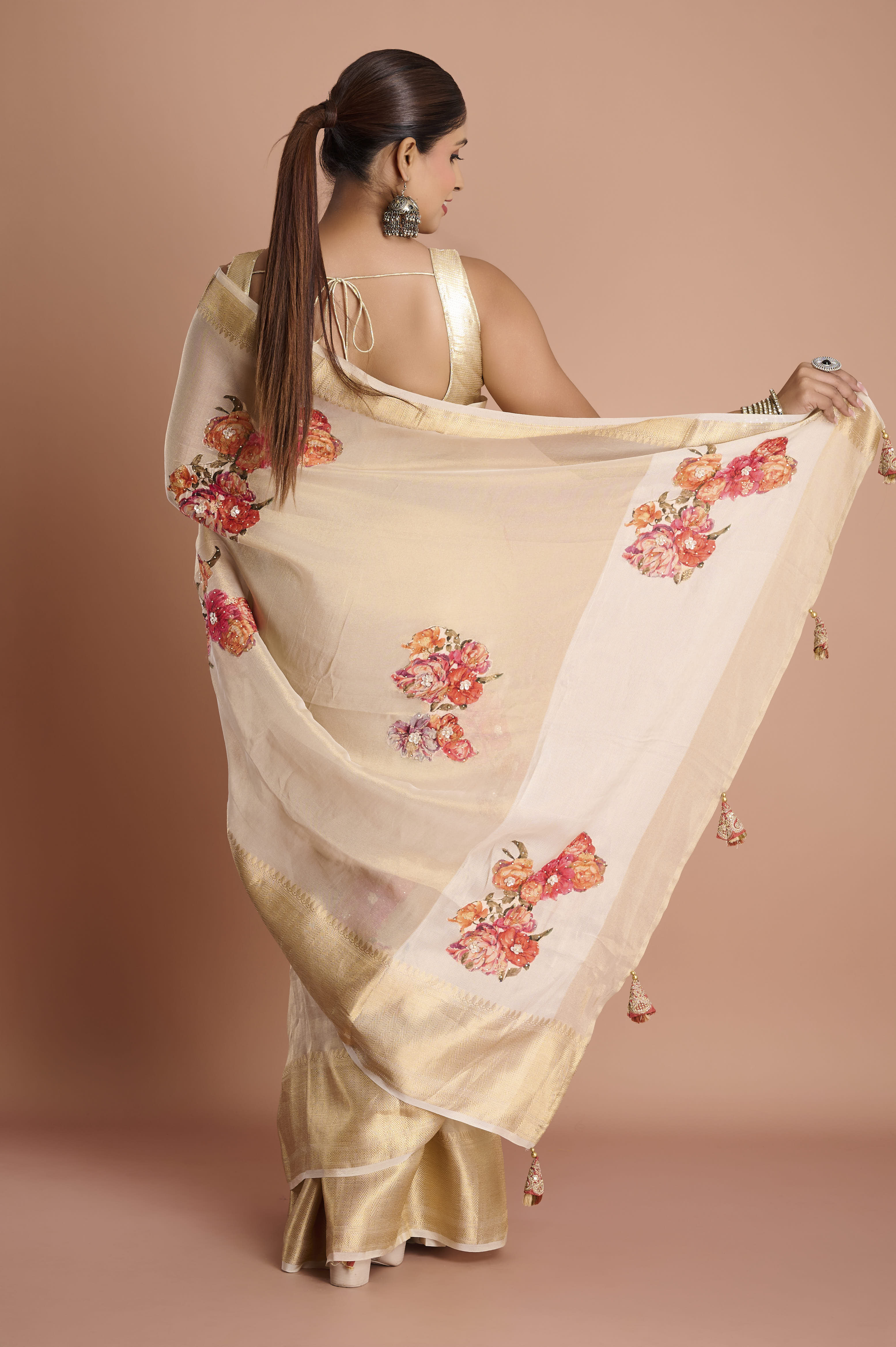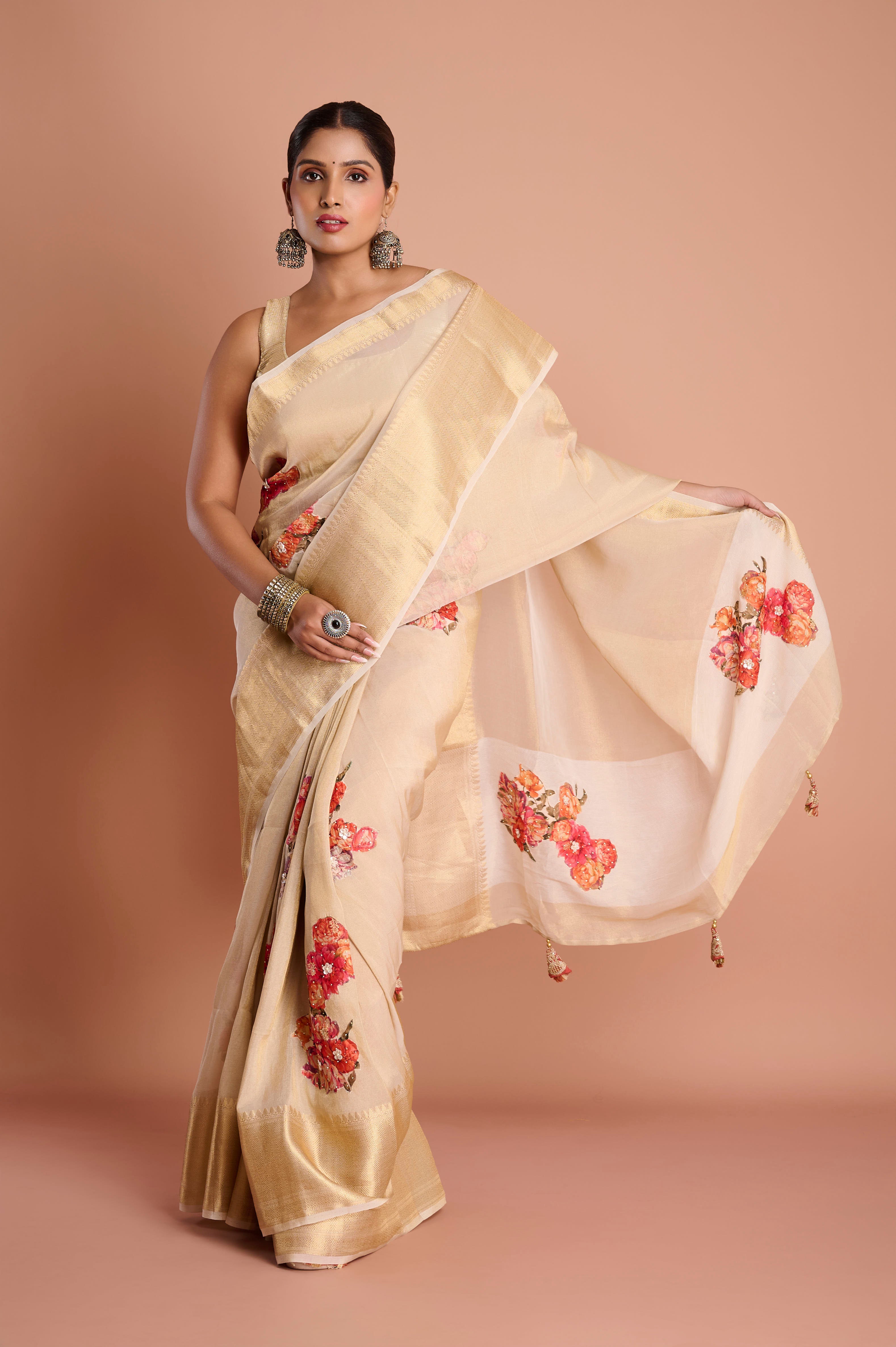 This elegant gold-toned tissue saree is adorned with meticulously hand-stitched applique floral motifs in rich, vibrant colors, creating stunning three-dimensional accents along the pallu and skirt. The luminous tissue fabric gives a soft, radiant sheen, and the intricate applique technique adds artistry, texture, and unique charm. Lightweight and luxurious, this saree is ideal for festive occasions, weddings, or celebrations where statement style meets timeless Indian tradition. A matching blouse piece is included for versatile custom styling.