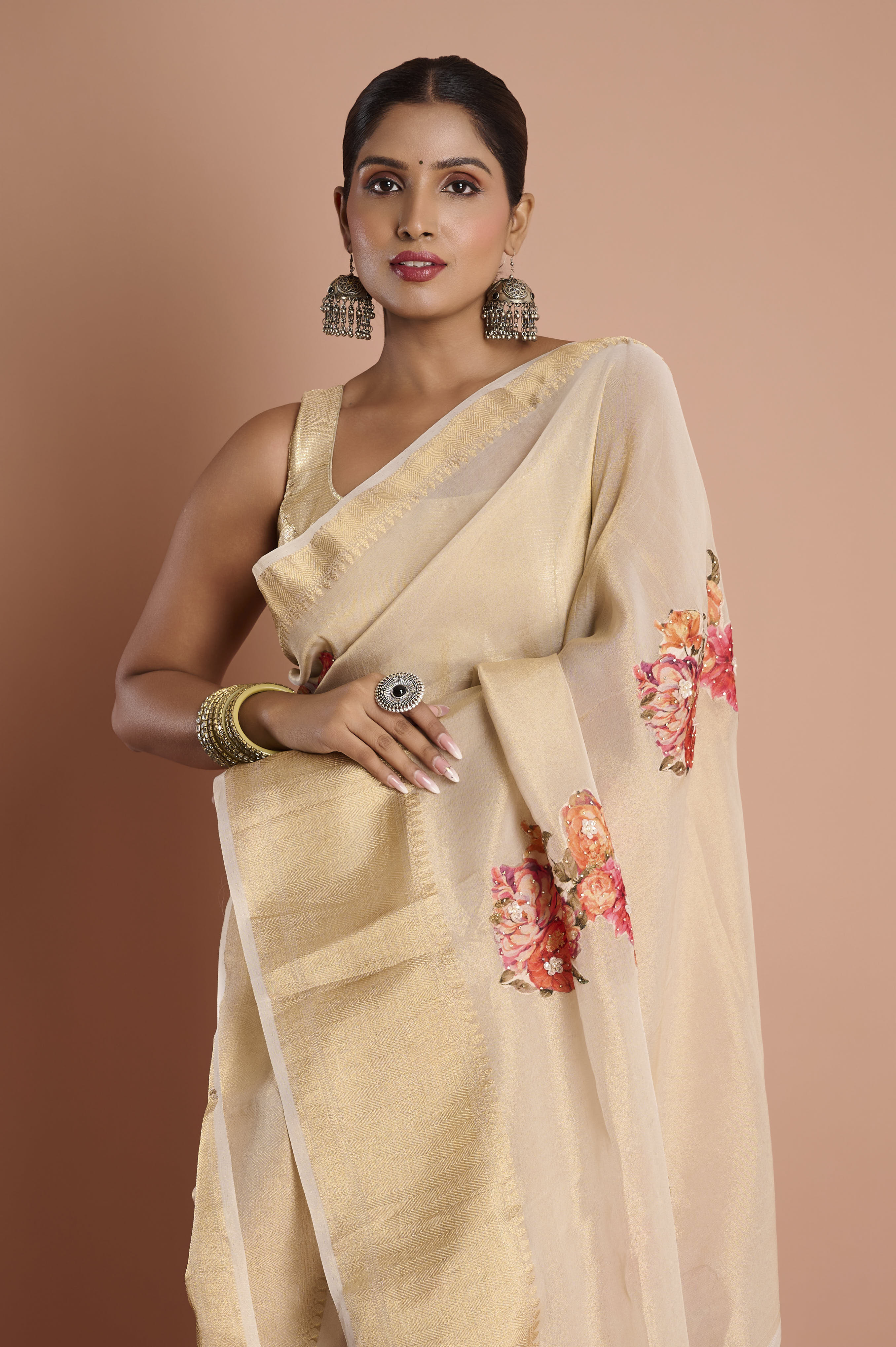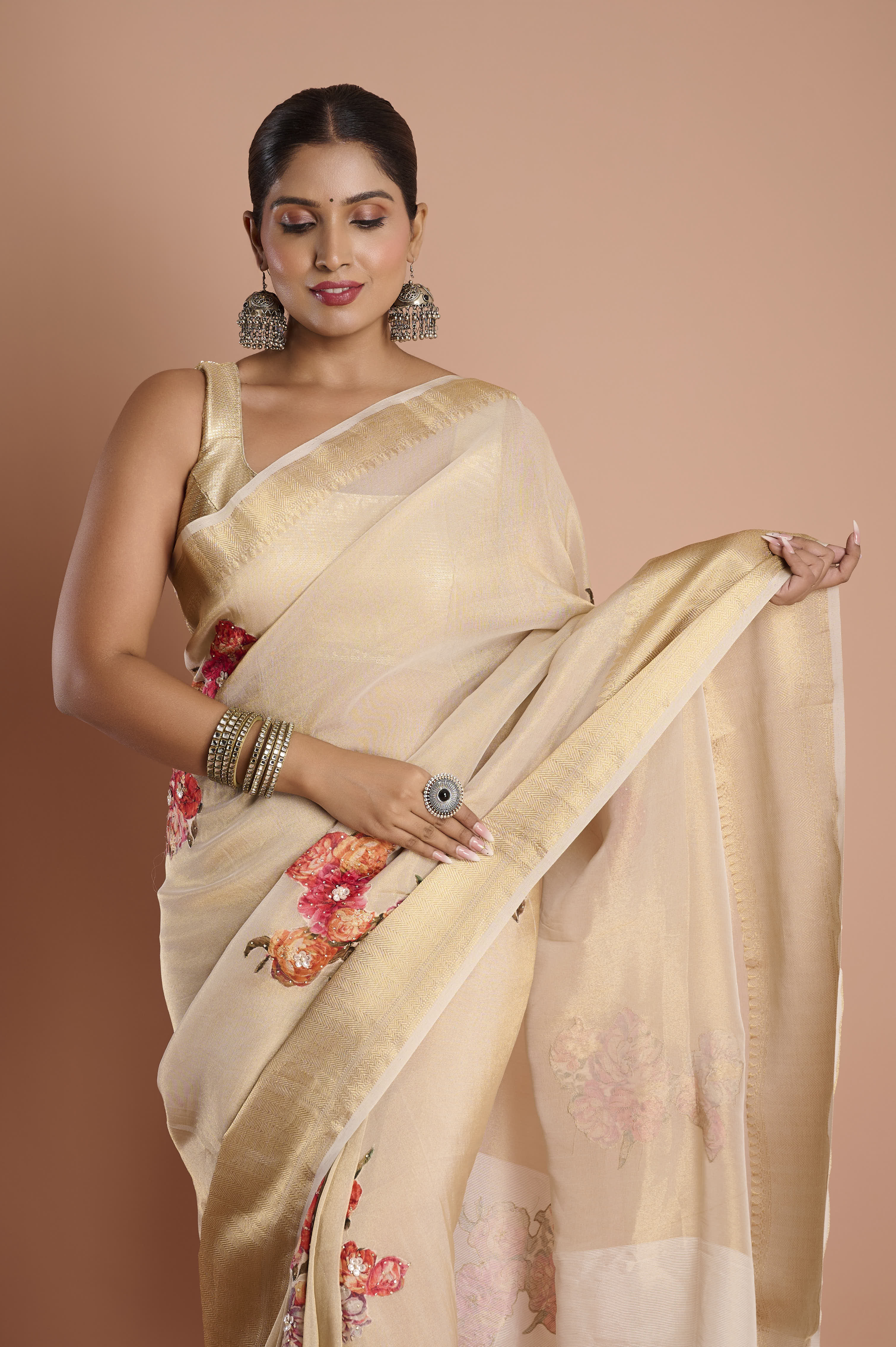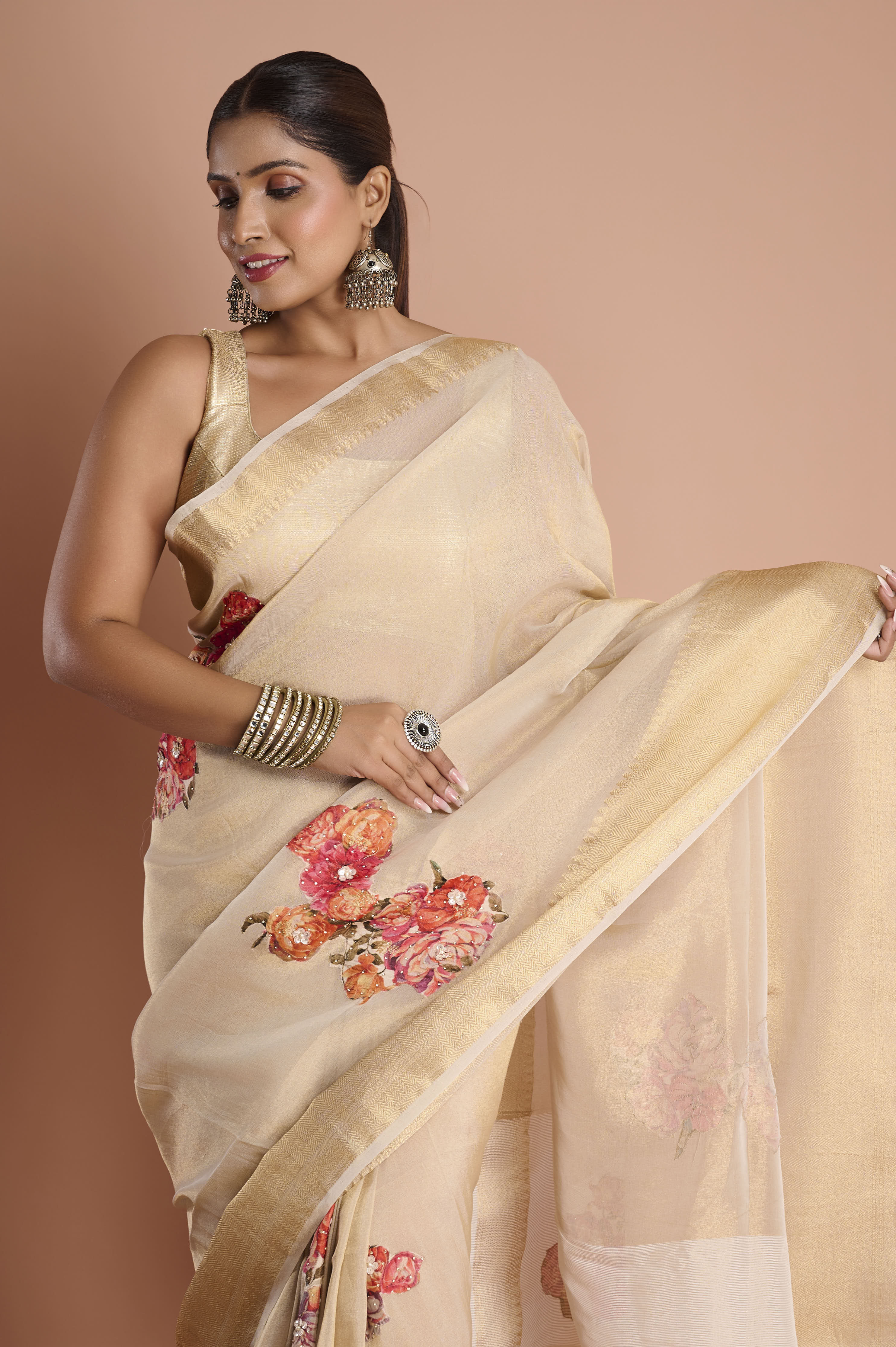 This elegant gold-toned tissue saree is adorned with meticulously hand-stitched applique floral motifs in rich, vibrant colors, creating stunning three-dimensional accents along the pallu and skirt. The luminous tissue fabric gives a soft, radiant sheen, and the intricate applique technique adds artistry, texture, and unique charm. Lightweight and luxurious, this saree is ideal for festive occasions, weddings, or celebrations where statement style meets timeless Indian tradition. A matching blouse piece is included for versatile custom styling.