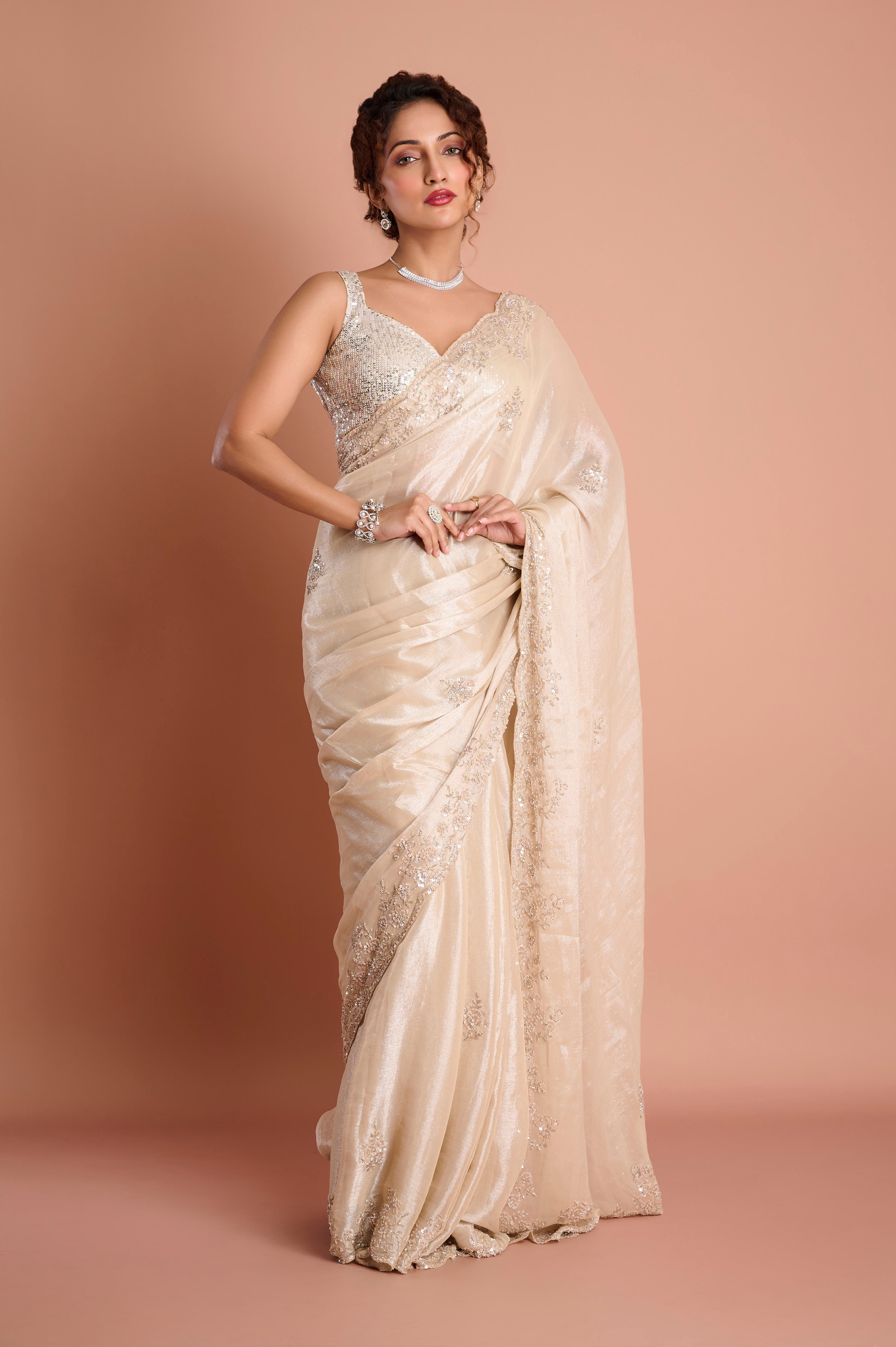 This golden tissue saree dazzles with delicate hand-embroidered sequins and intricate beadwork, creating a luxurious shimmer throughout. The fine fabric drapes beautifully, making it perfect for festive and special occasions. Its soft metallic finish adds an elegant glow, while the detailed border work highlights craftsmanship. Included is a matching blouse piece to complete the look.