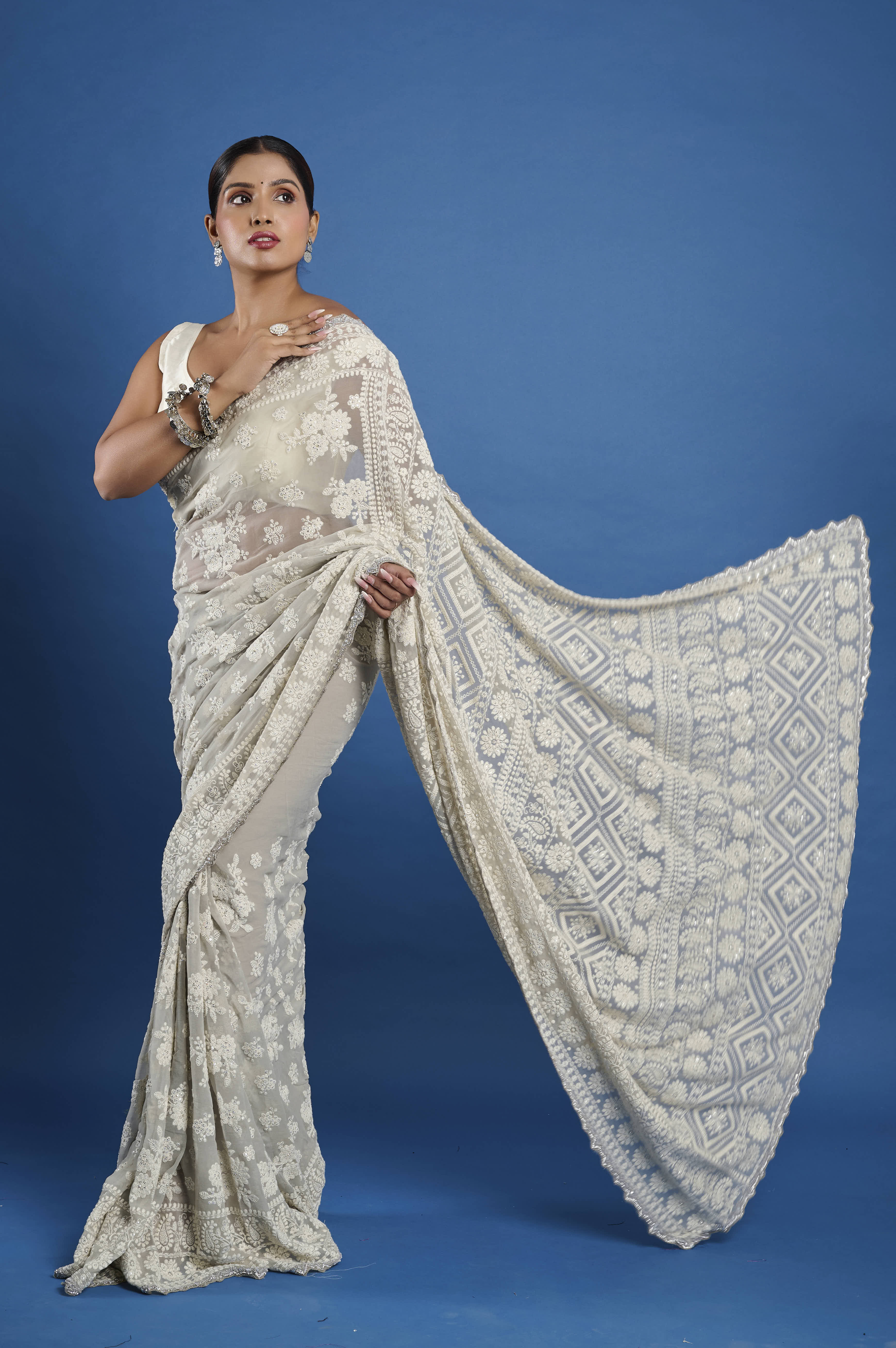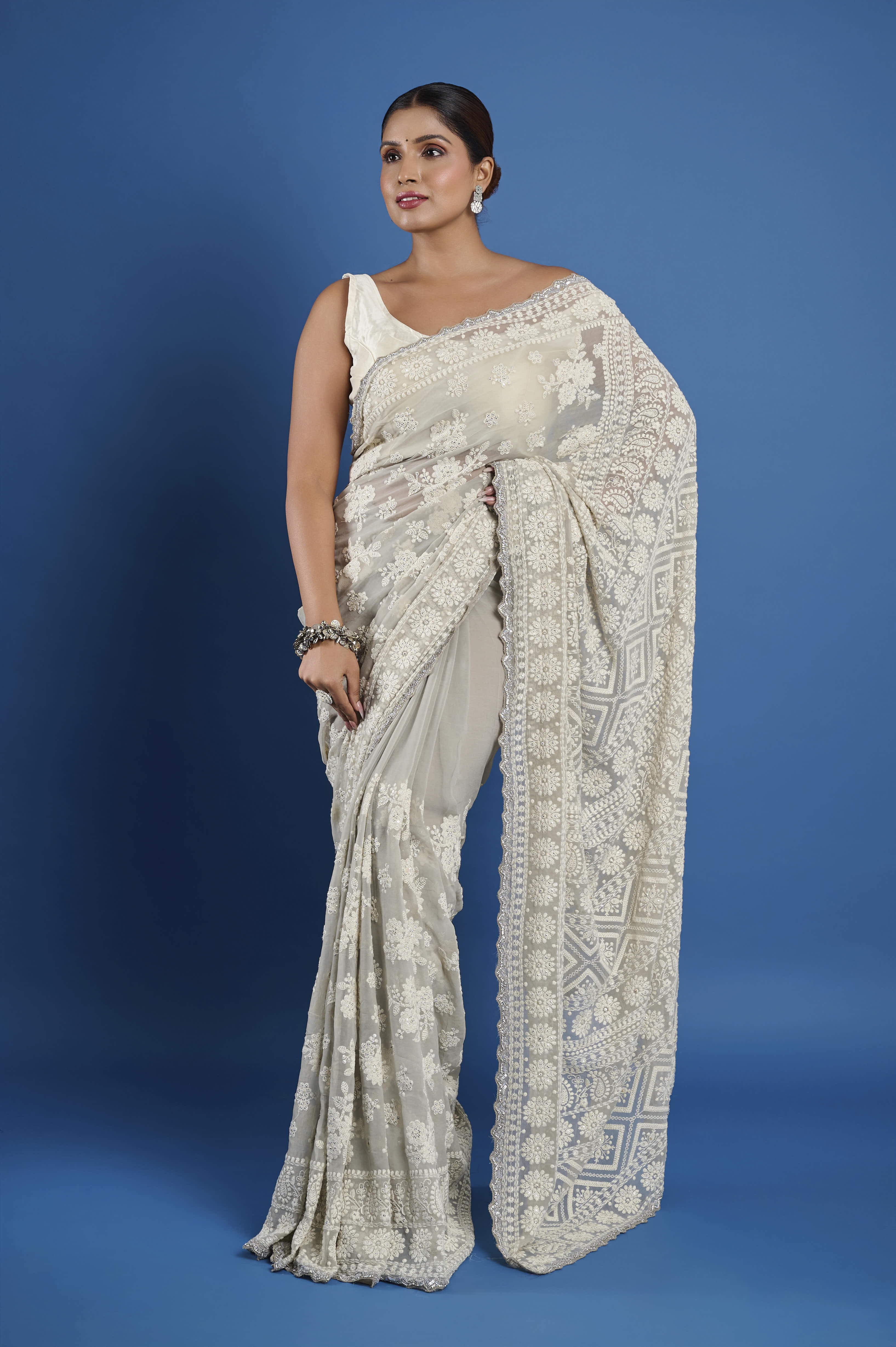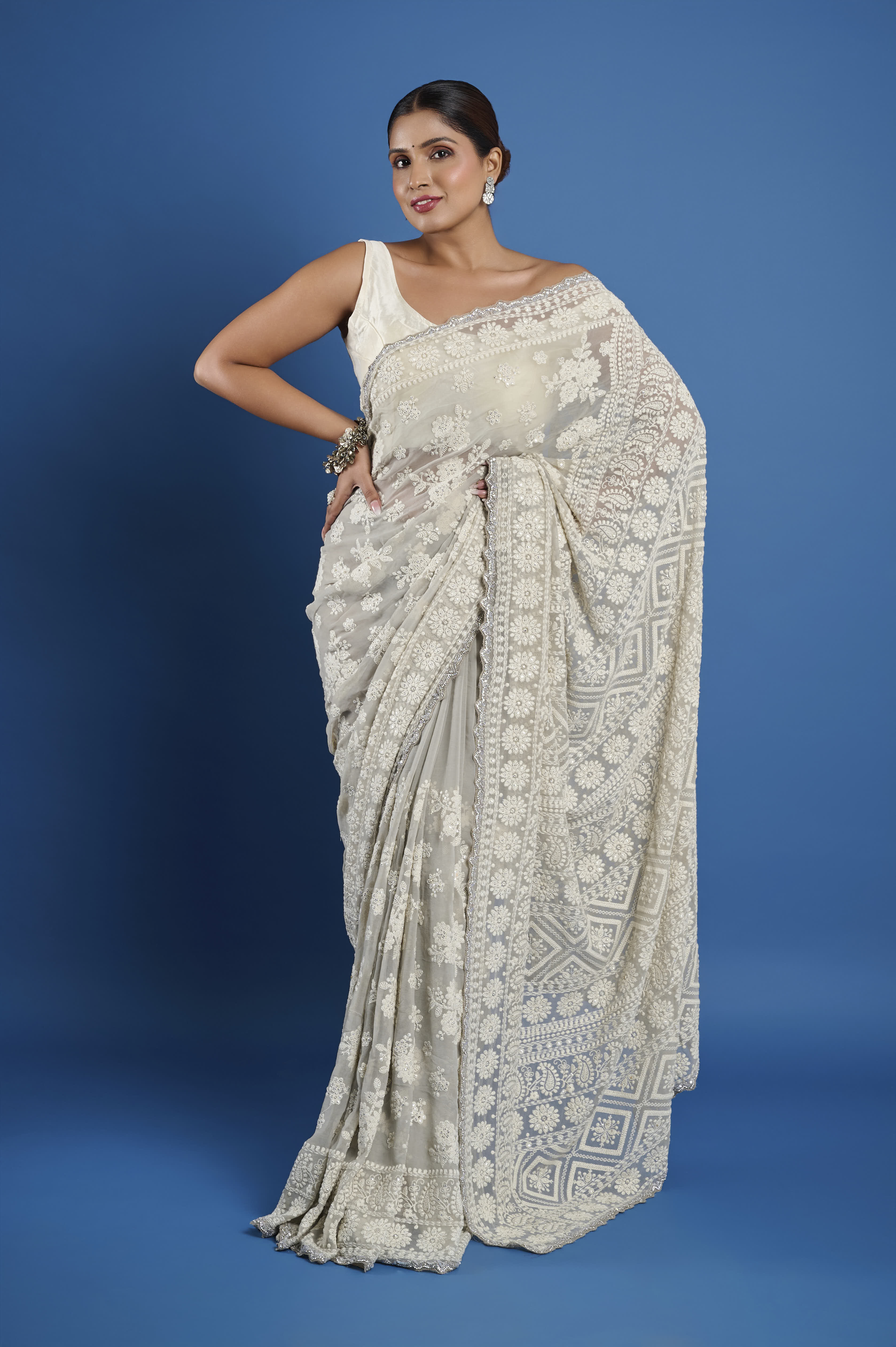 This ethereal georgette saree in a soft champagne hue features exquisite all-over Chikankari embroidery, highlighted by glimmering hand-sewn beads nestled into the intricate floral patterns. The fine, sheer georgette fabric drapes beautifully with a flowing, lightweight feel, making it perfect for elegant daytime celebrations, festive evenings, or wedding occasions. An intricately detailed embroidered border and heavily worked pallu enhance the richness and traditional appeal. The set comes with a matching unstitched georgette blouse piece embellished to coordinate with the saree.