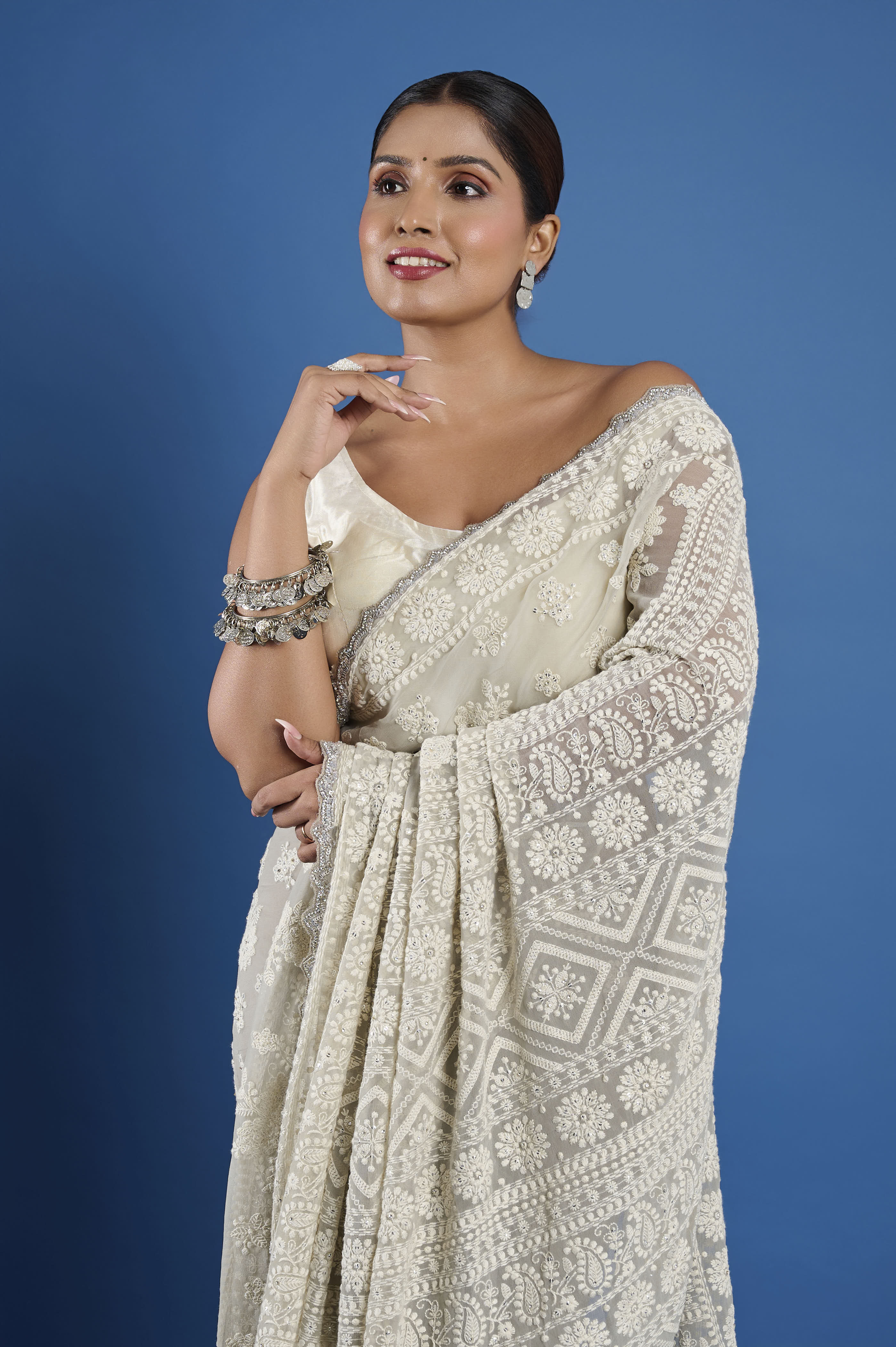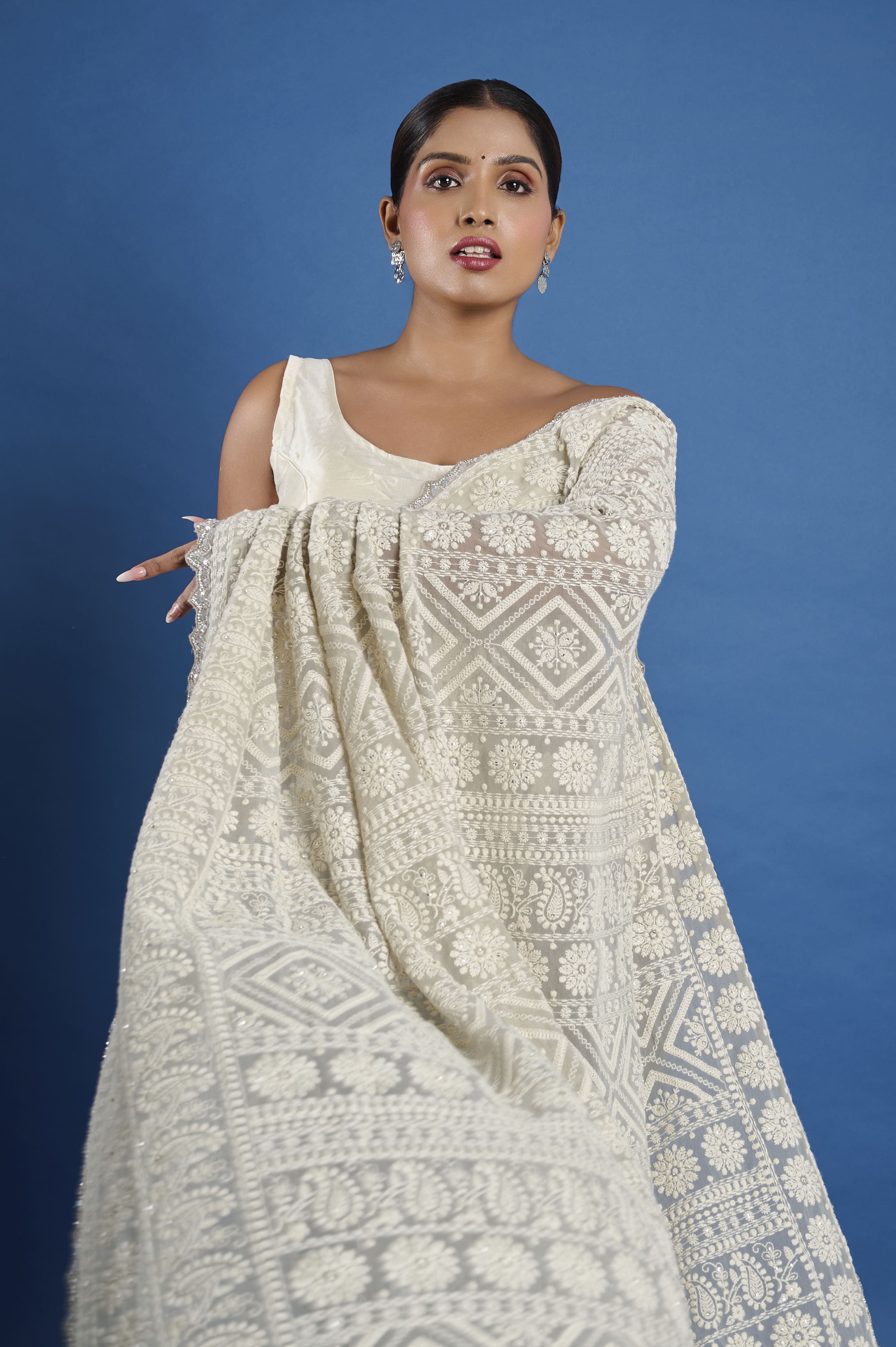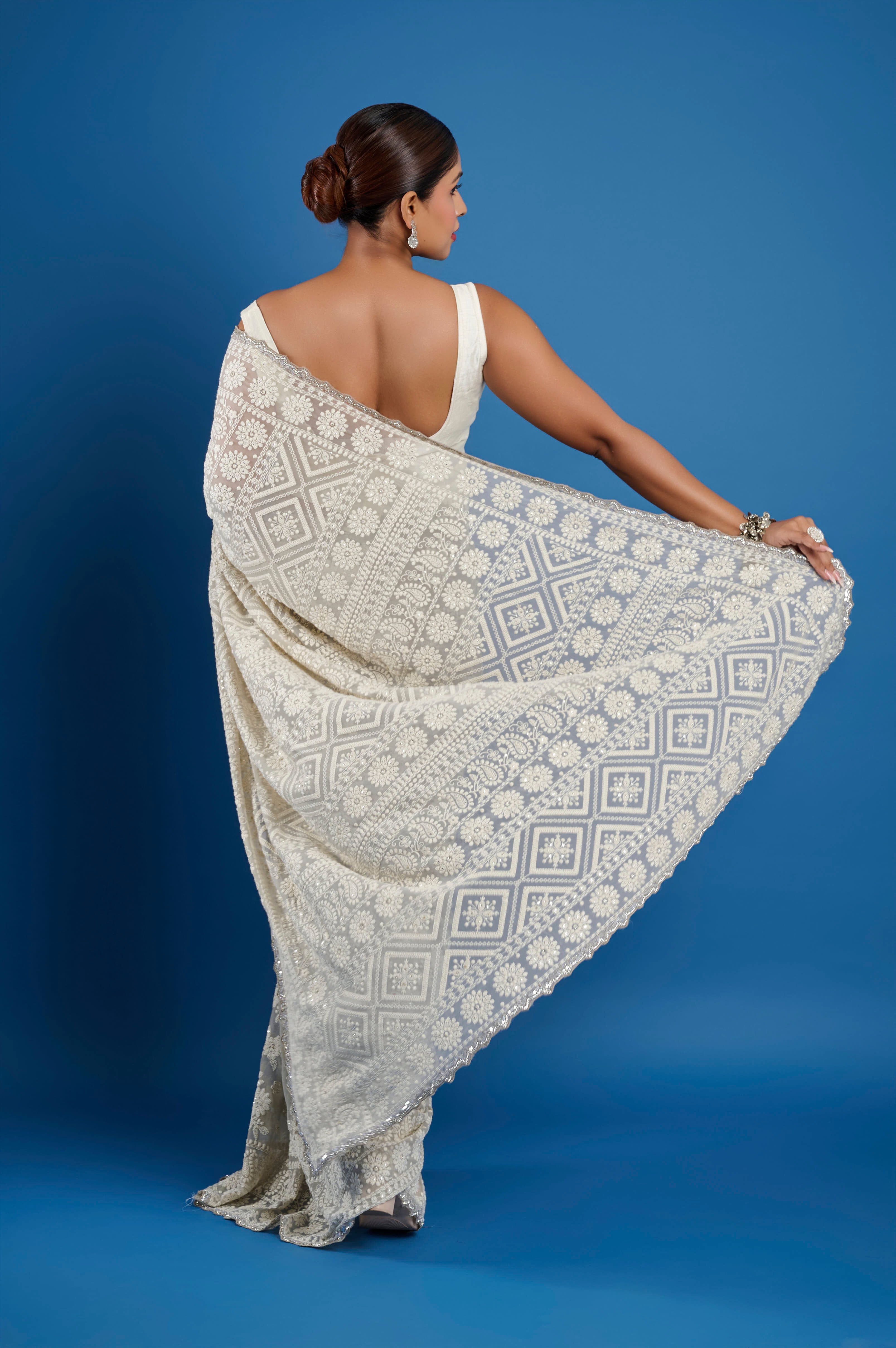 This ethereal georgette saree in a soft champagne hue features exquisite all-over Chikankari embroidery, highlighted by glimmering hand-sewn beads nestled into the intricate floral patterns. The fine, sheer georgette fabric drapes beautifully with a flowing, lightweight feel, making it perfect for elegant daytime celebrations, festive evenings, or wedding occasions. An intricately detailed embroidered border and heavily worked pallu enhance the richness and traditional appeal. The set comes with a matching unstitched georgette blouse piece embellished to coordinate with the saree.