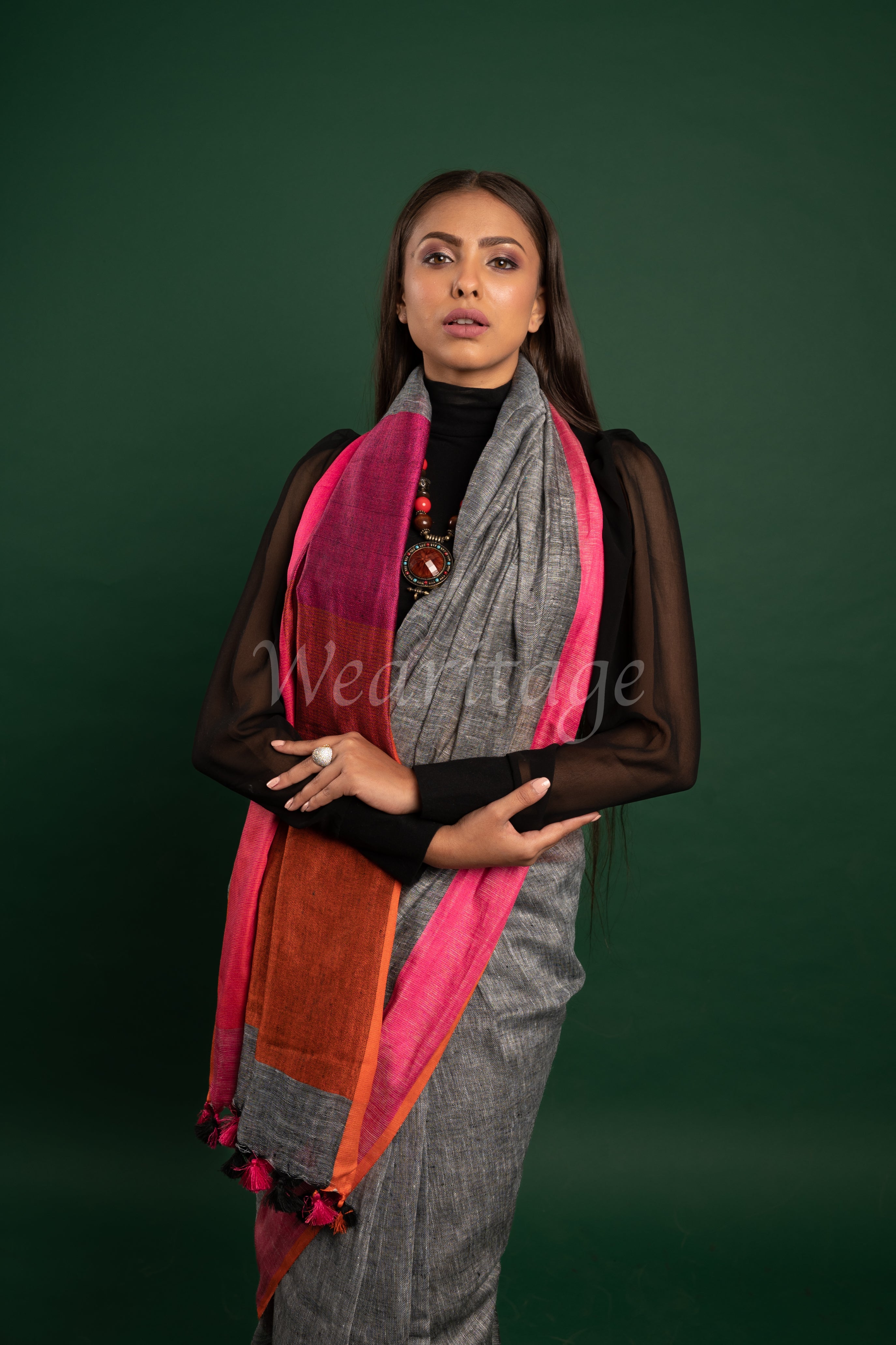 This light fabric is very breathable when worn. It suits the Indian climate perfectly and can be worn all year round. When mixed with other textiles like cotton, it becomes very soft and delicate. Linen sarees are easy to wear, vibrant and very common all over India.