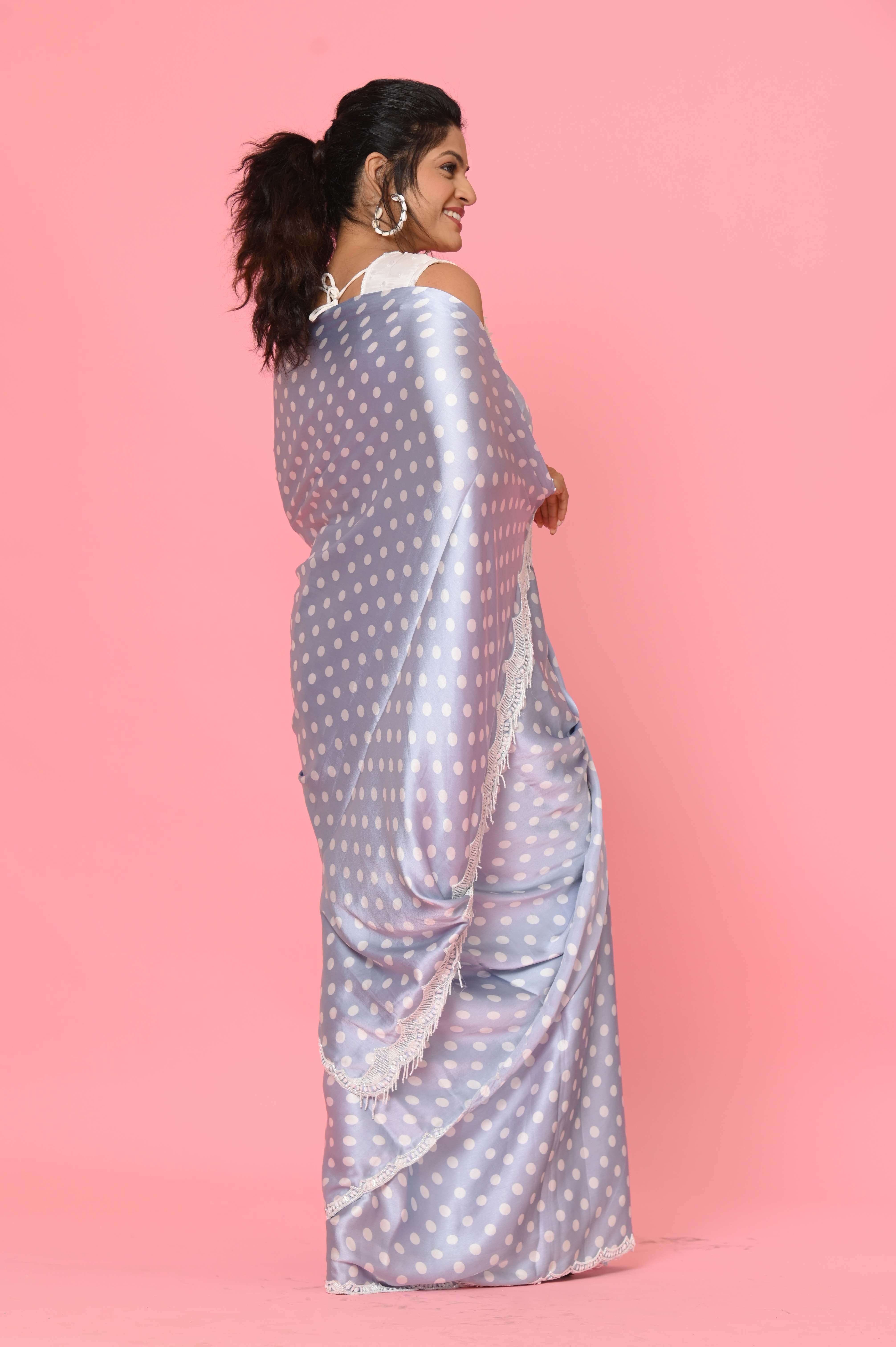 Gray Polka Dots Satin Saree with Stitched Blouse