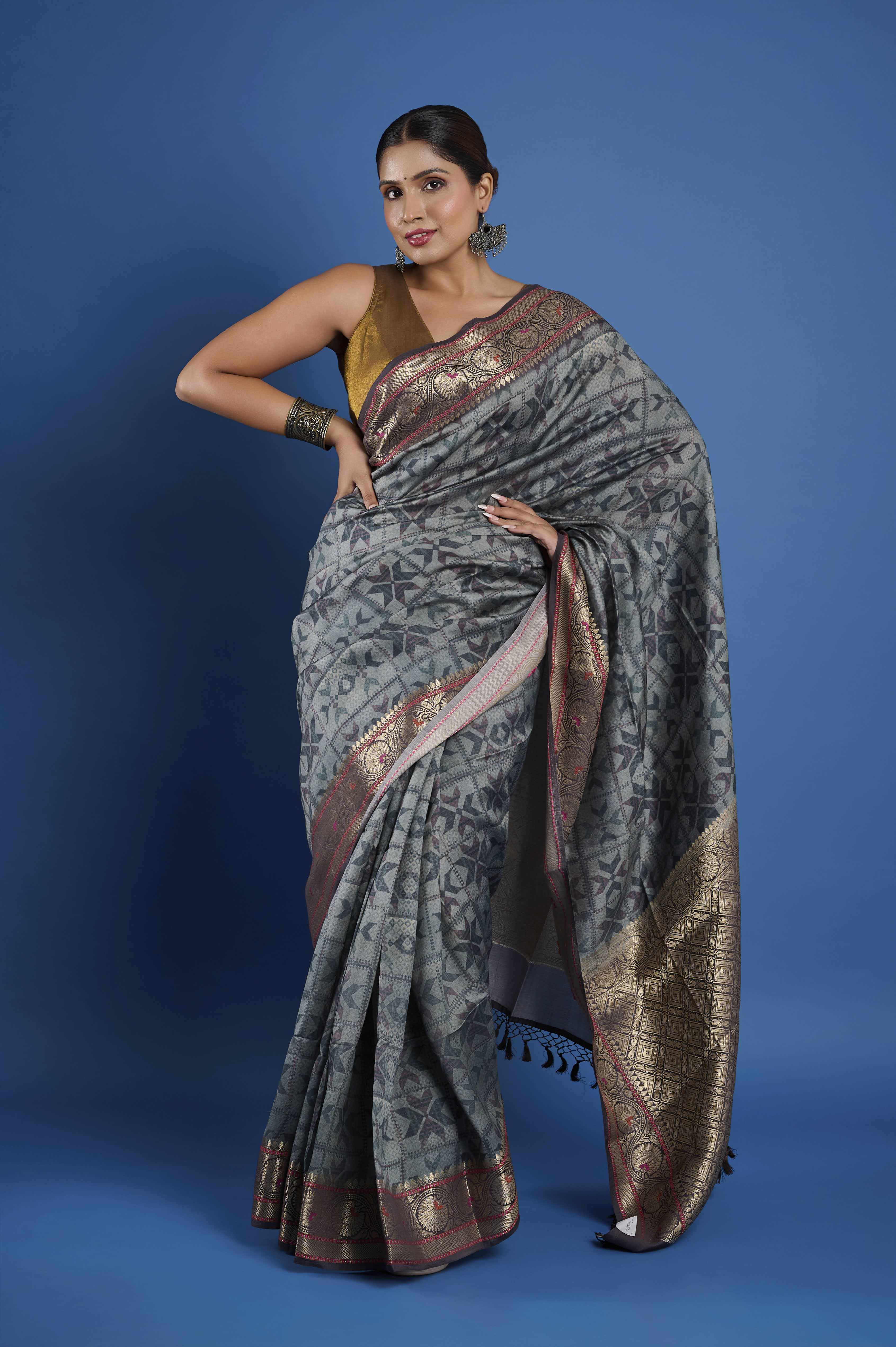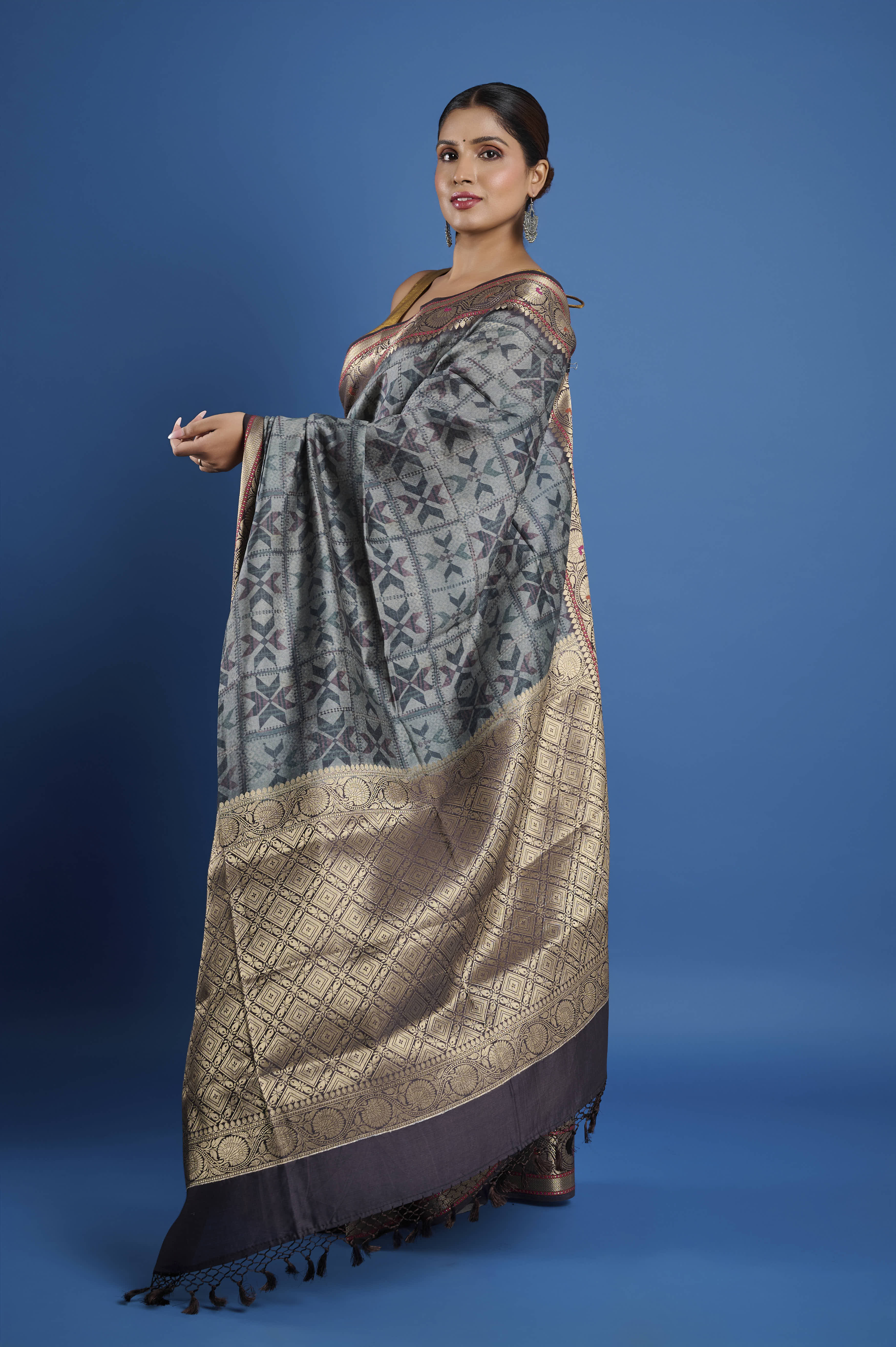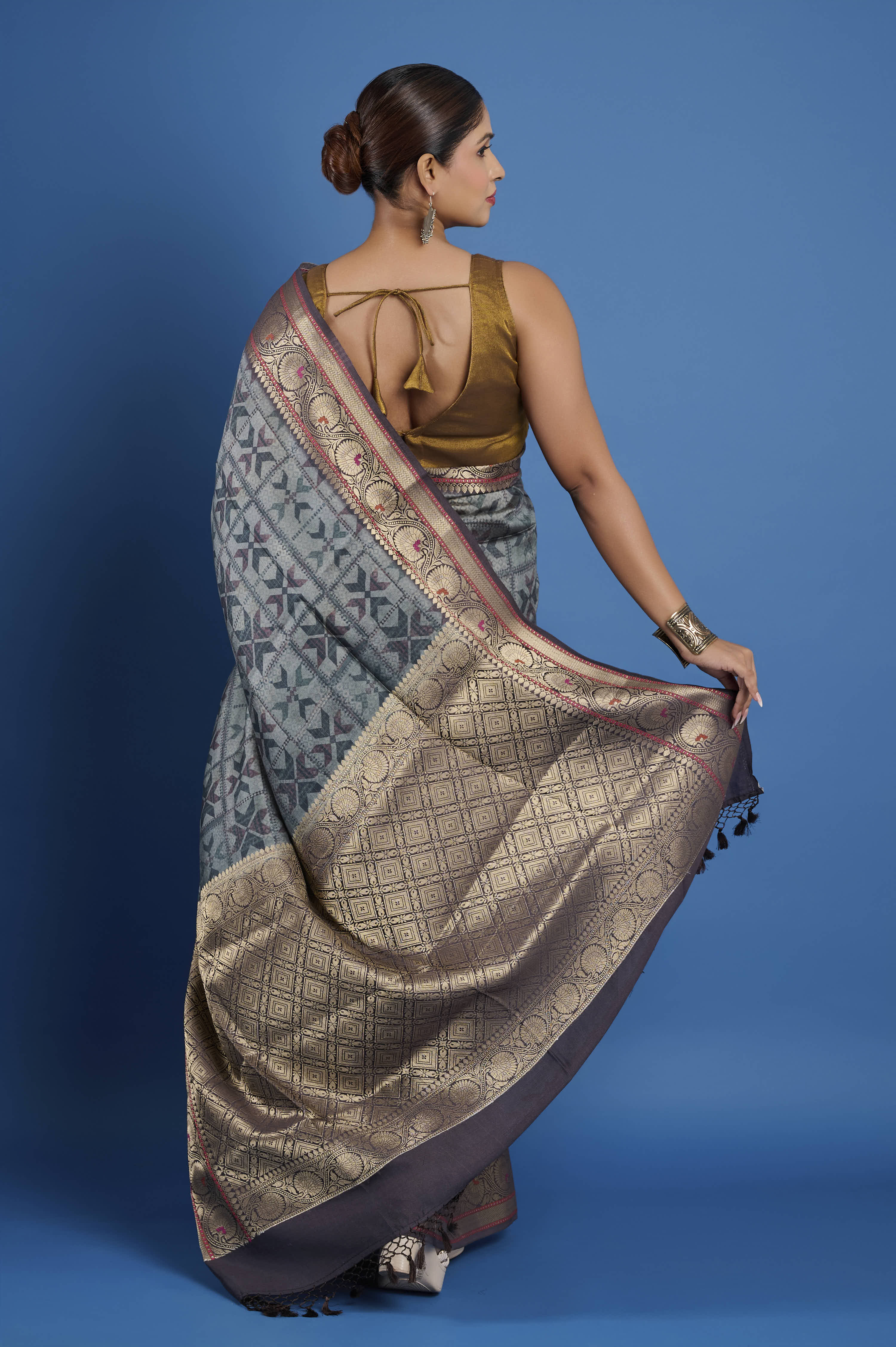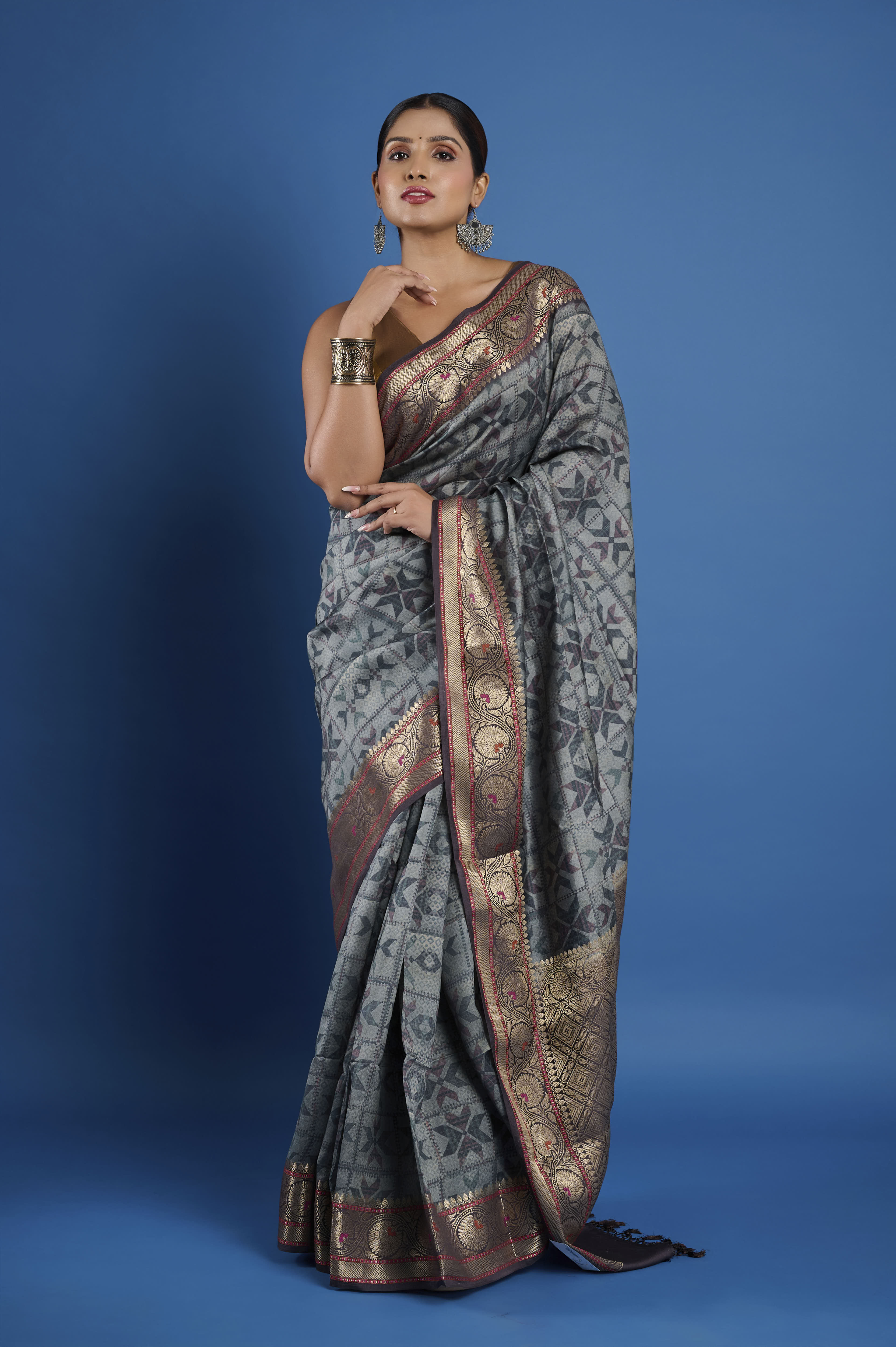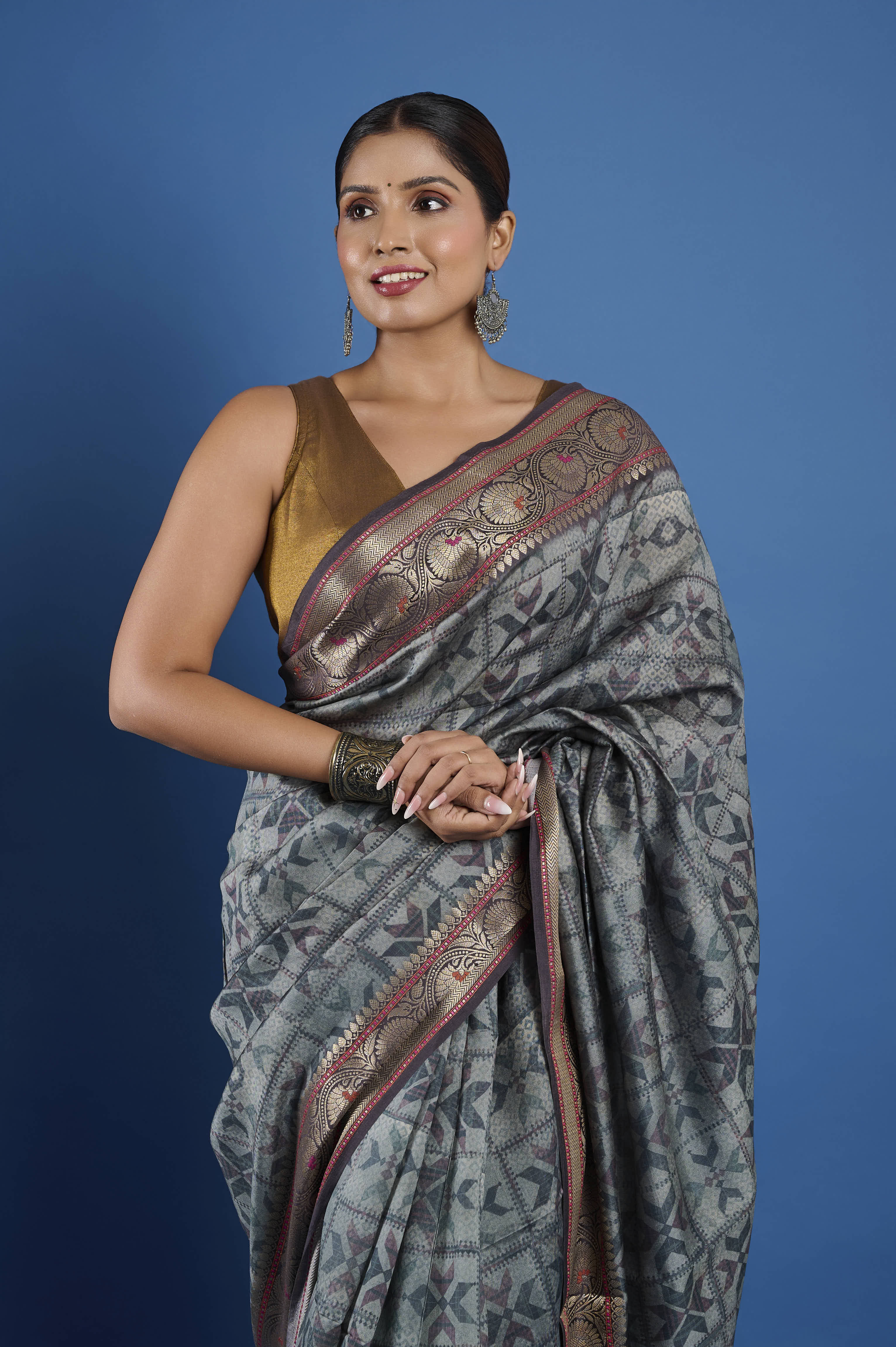 This pure Chanderi saree features a modern digital print with geometric and floral motifs in muted black, olive, and taupe shades, elegantly contrasted by a deep antique gold zari border and pallu. The feather-light, semi-sheer Chanderi fabric delivers a fluid, sophisticated drape with subtle sheen, making it perfect for festive occasions, elegant daytime functions, or evening gatherings. A matching unstitched blouse piece is included, allowing for customized stitching.