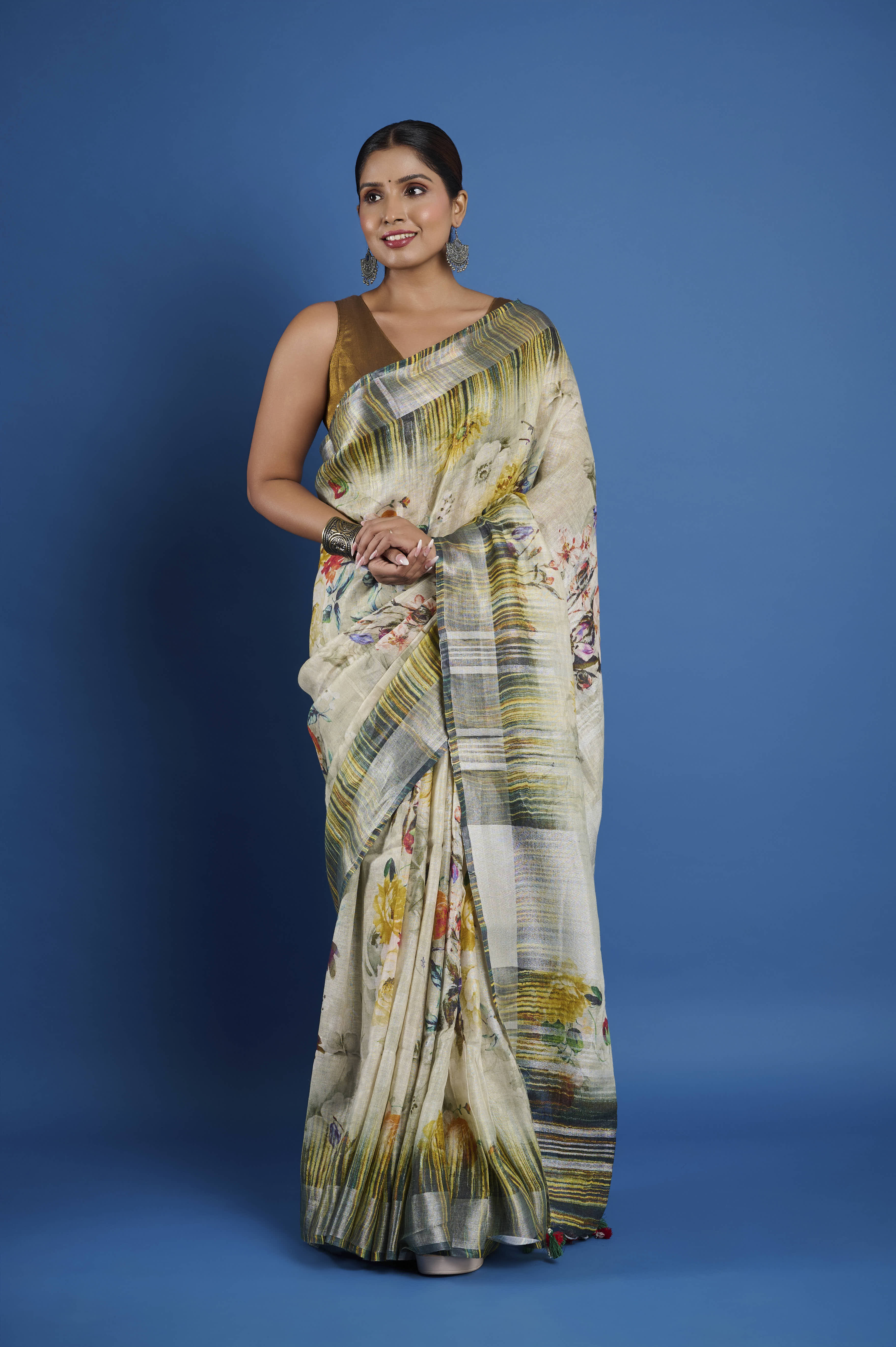 This pure linen saree showcases a sophisticated digital print, blending ochre yellow, olive, and muted earthy tones into an abstract ombre border alongside delicate floral motifs. The sareeÕs lightweight, airy linen is soft and breathable, making it perfect for summer events, daywear, or artful semi-formal occasions. Finished with a natural textured drape and smooth pallu, it comes with a matching unstitched blouse piece for custom tailoring.
