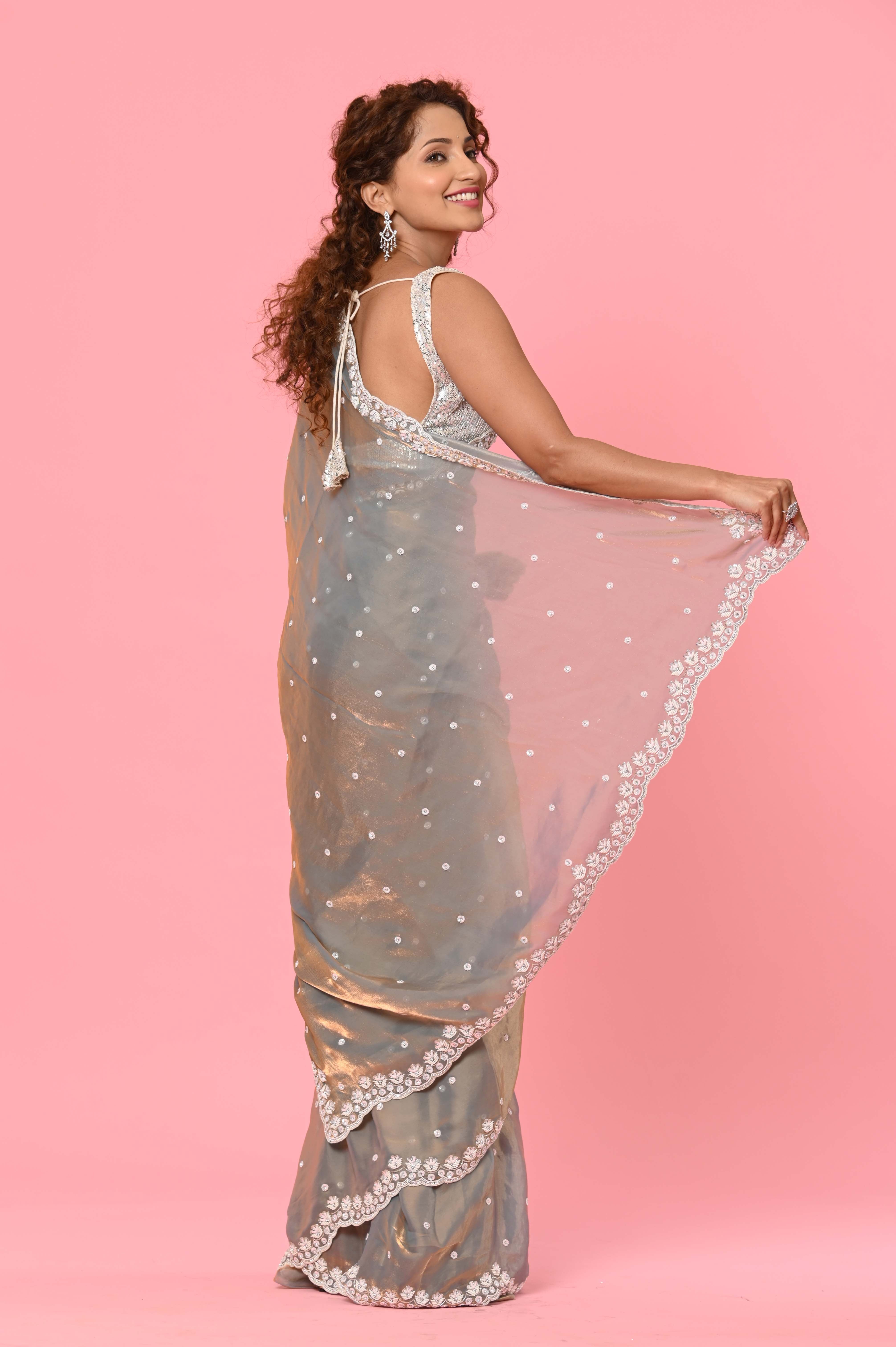 A shot silk designer saree is a luxurious and elegant traditional Indian outfit. Shot silk, also known as changeable silk, is a fabric woven with threads of different colors, creating a two-tone or iridescent effect when viewed from different angles. This gives the fabric a unique and visually appealing quality. When combined with designer elements, it adds a touch of high fashion to the saree.