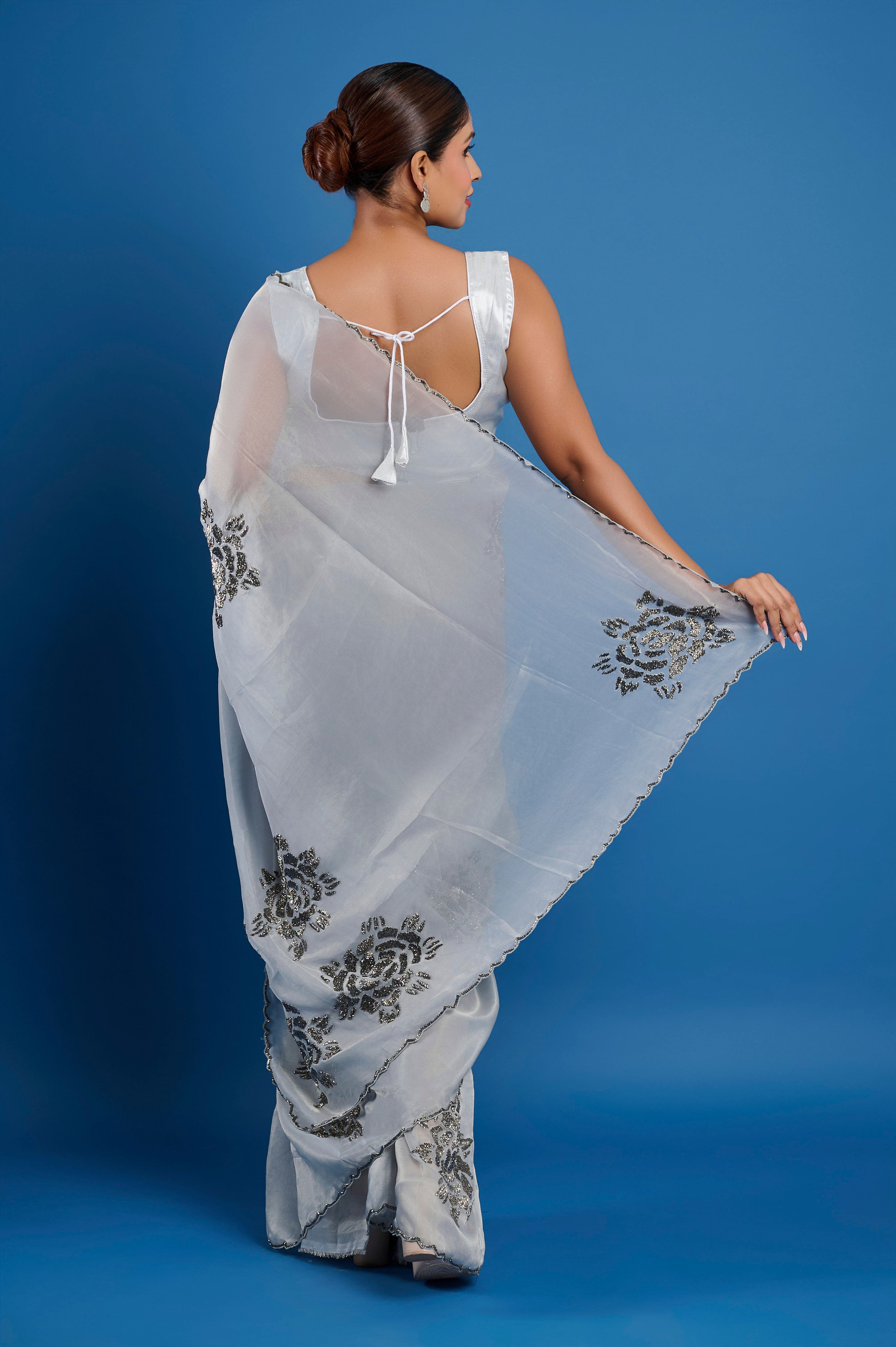 This luxurious tissue saree is crafted in a shimmering silver-grey hue, featuring heavy hand-applied bead embellishments intricately forming floral motifs across the drape and along the blouse piece. The signature sheer, luminous tissue fabric creates an ethereal silhouette, perfect for festive evenings, weddings, and high-glam occasions. The scalloped border is highlighted with additional bead detailing for enhanced sparkle and texture, while the soft, lightweight nature of the saree ensures a graceful fall and effortless movement. Includes a matching unstitched tissue blouse piece, lavishly adorned with coordinated beadwork for a complete couture experience.