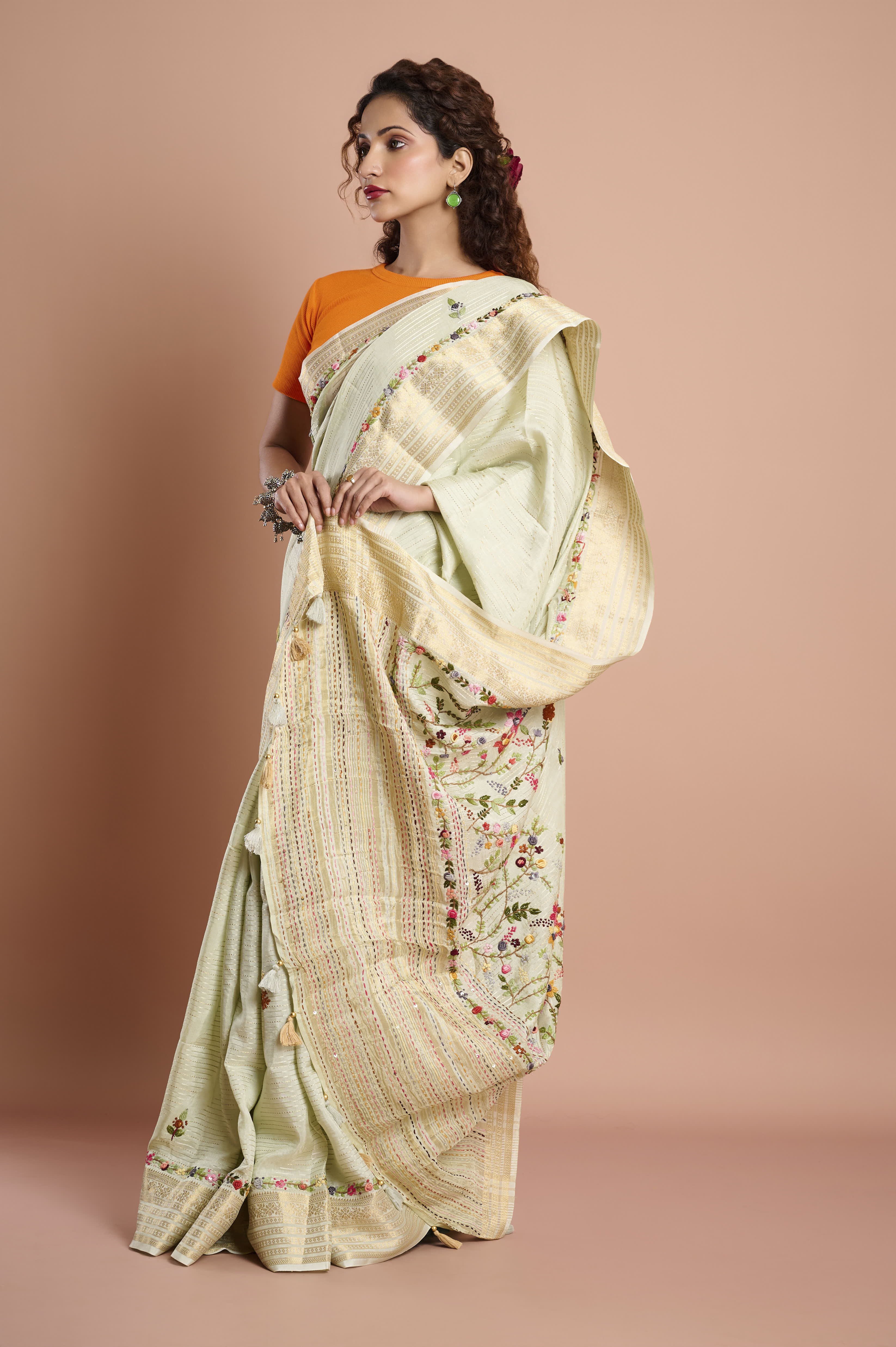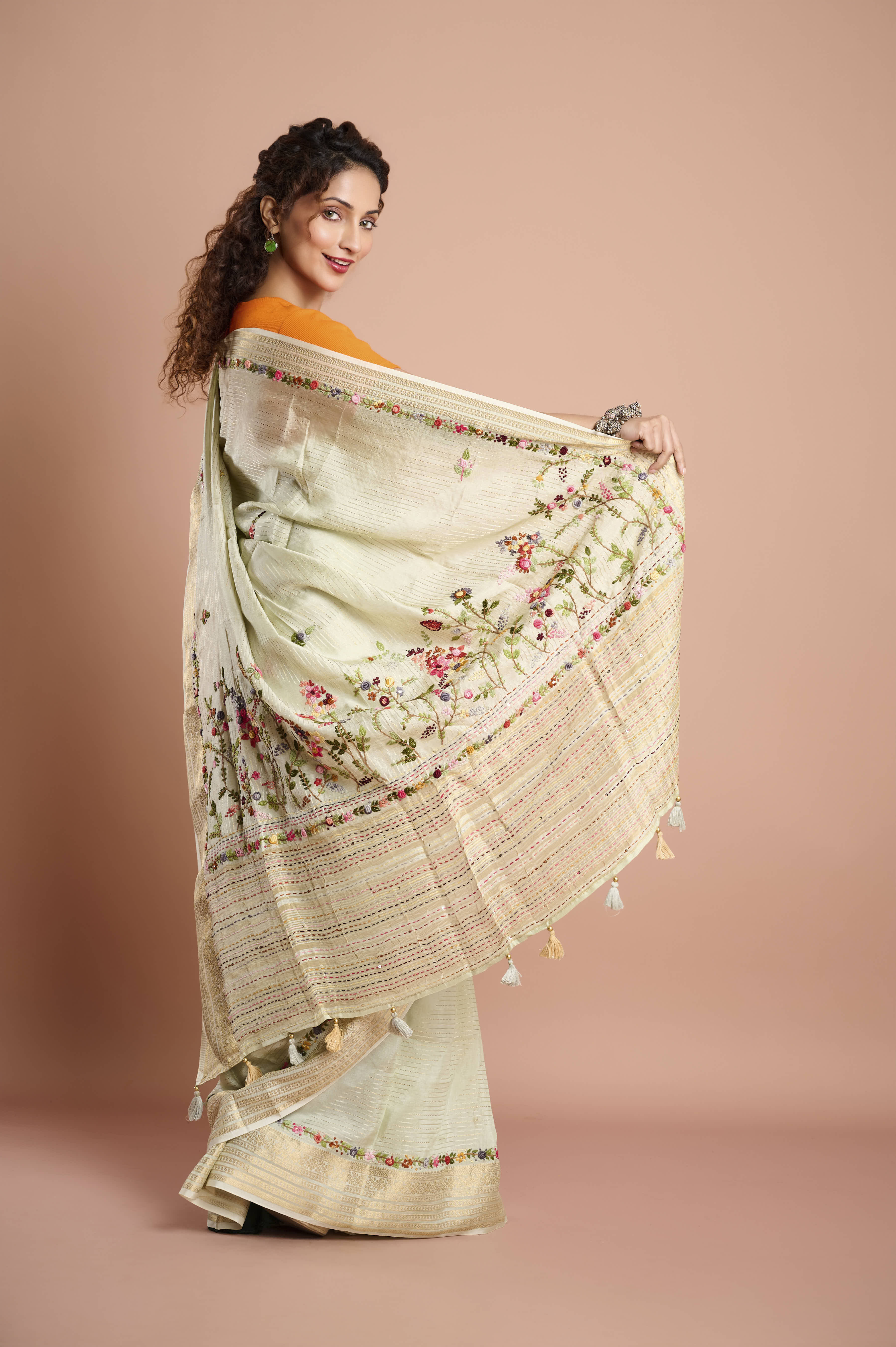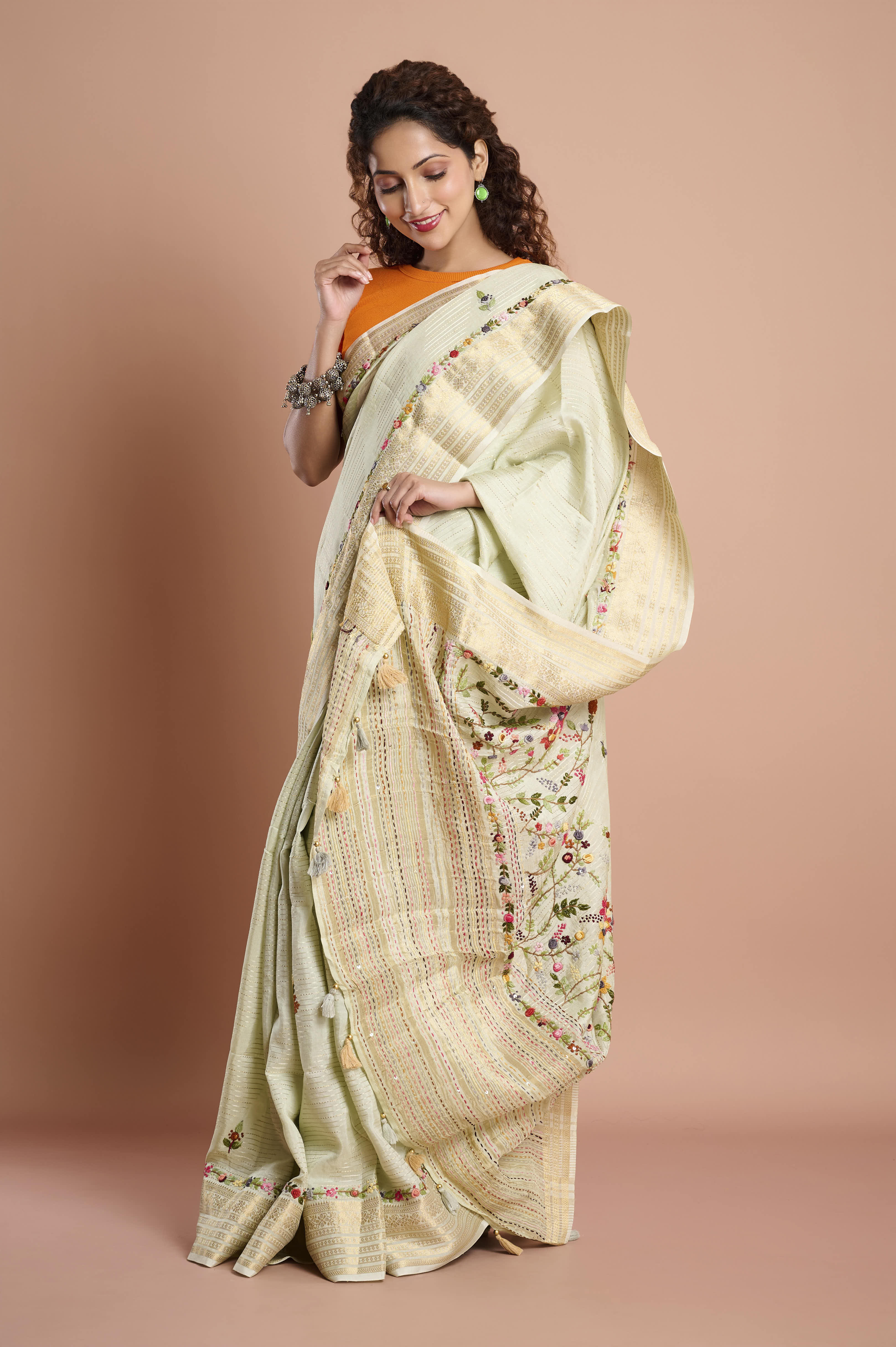 This pastel green Dola silk saree showcases exquisite hand embroidery with vibrant floral motifs and delicate vine patterns. The artful stitches bring together pops of pink, coral, and leaf green, giving the saree a lush, springtime feel. The fabric's gentle sheen and smooth drape ensure a luxurious wearing experience, perfect for daytime celebrations or refined soirees. Intricate detailing adorns both the border and pallu, enhancing the sareeÕs artistic elegance. Each saree comes with an unstitched blouse piece for tailored styling.